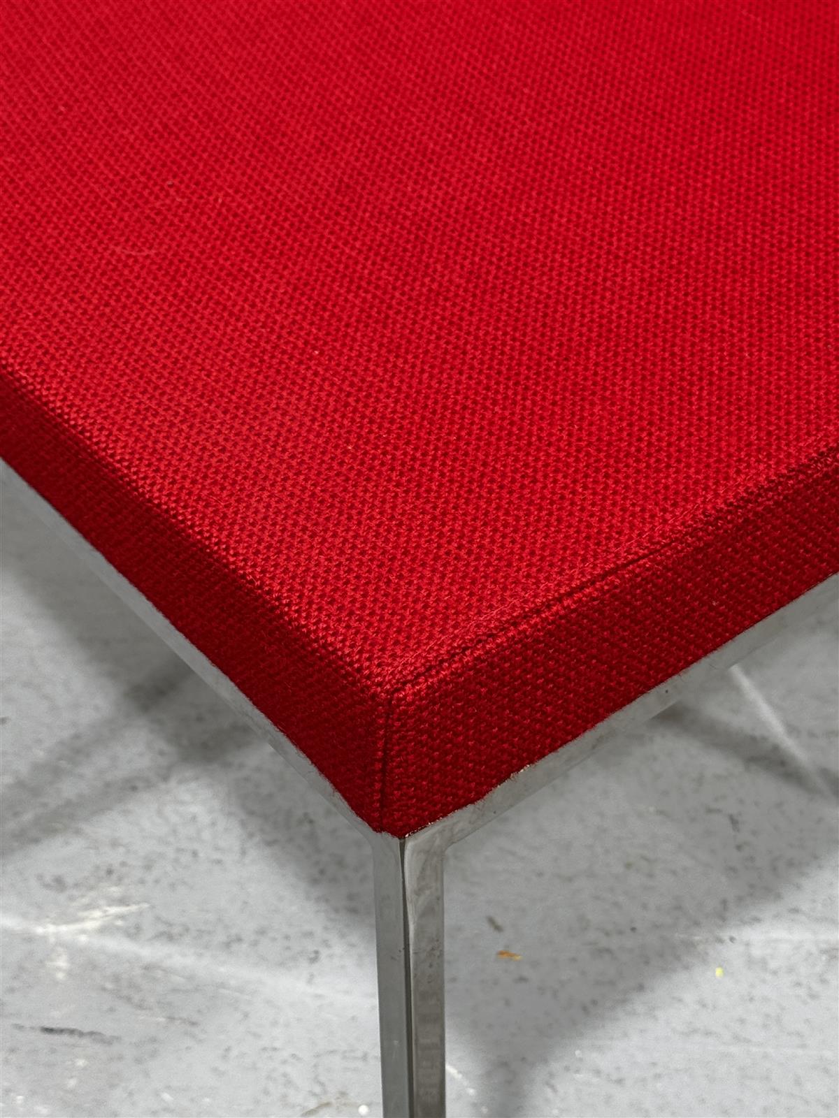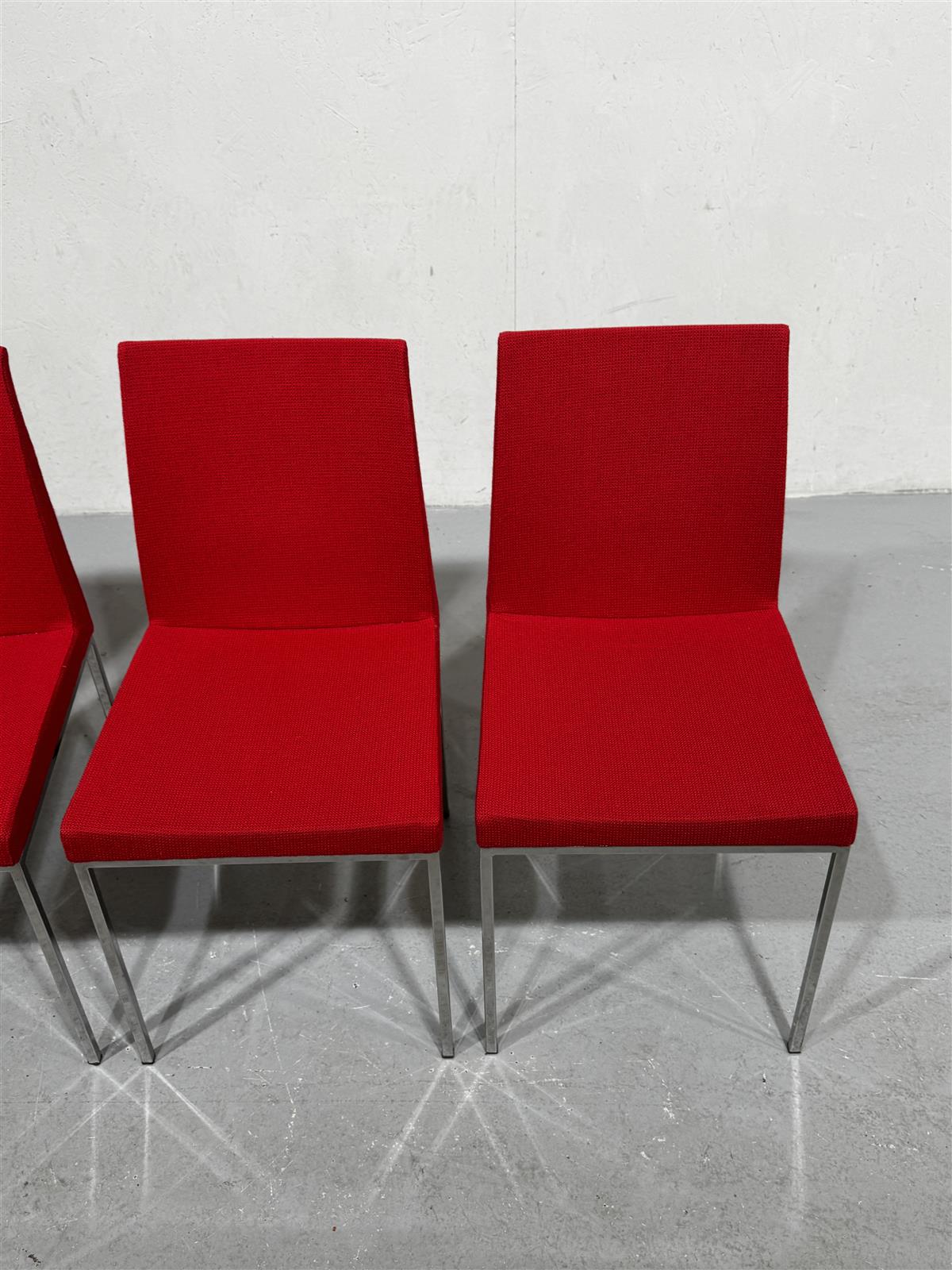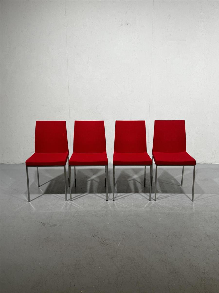 Bross-merkkiset tuolit, joissa on punainen kangasverhoilu ja metalliset jalat. Setti sisältää neljä tuolia.