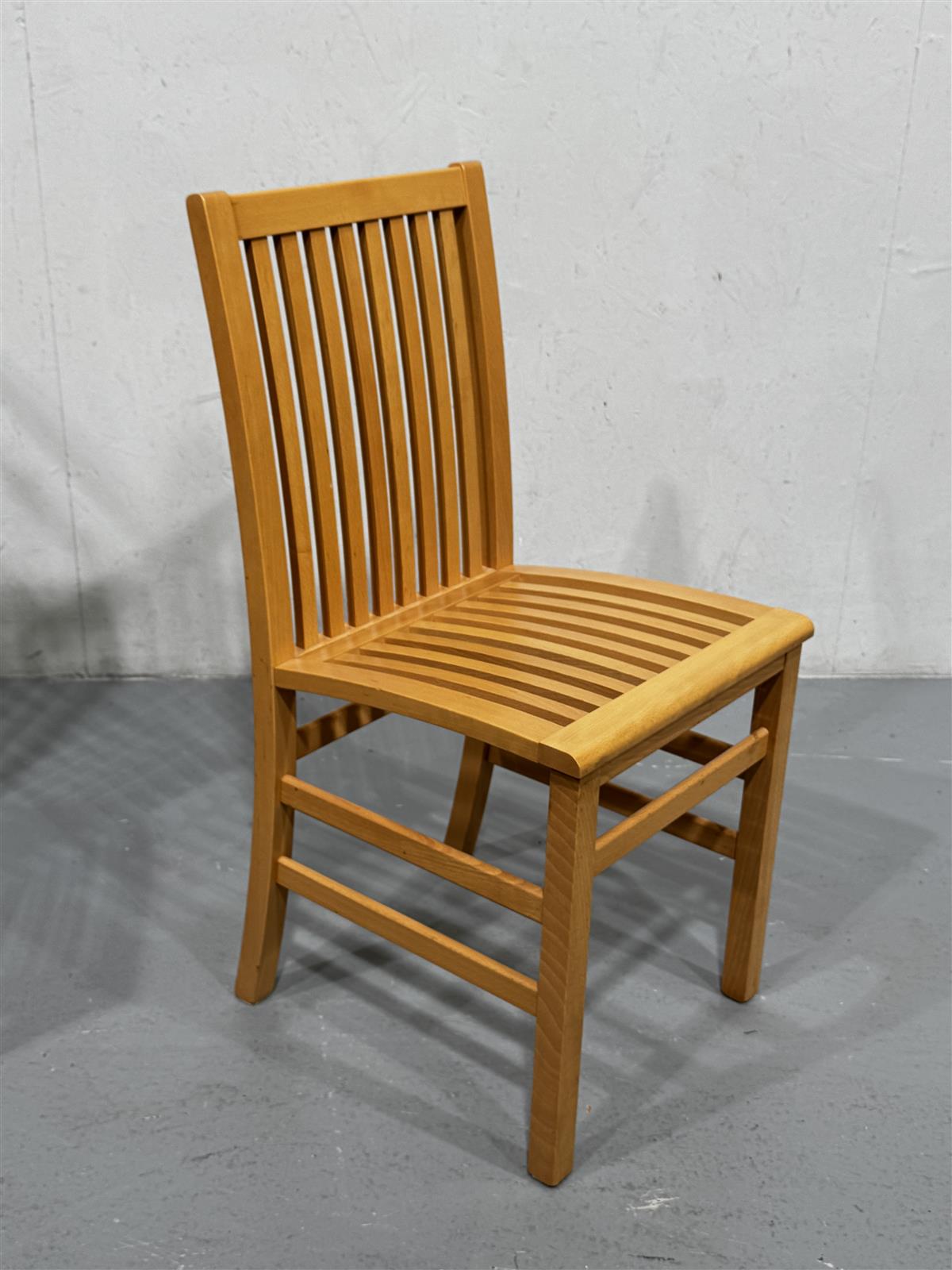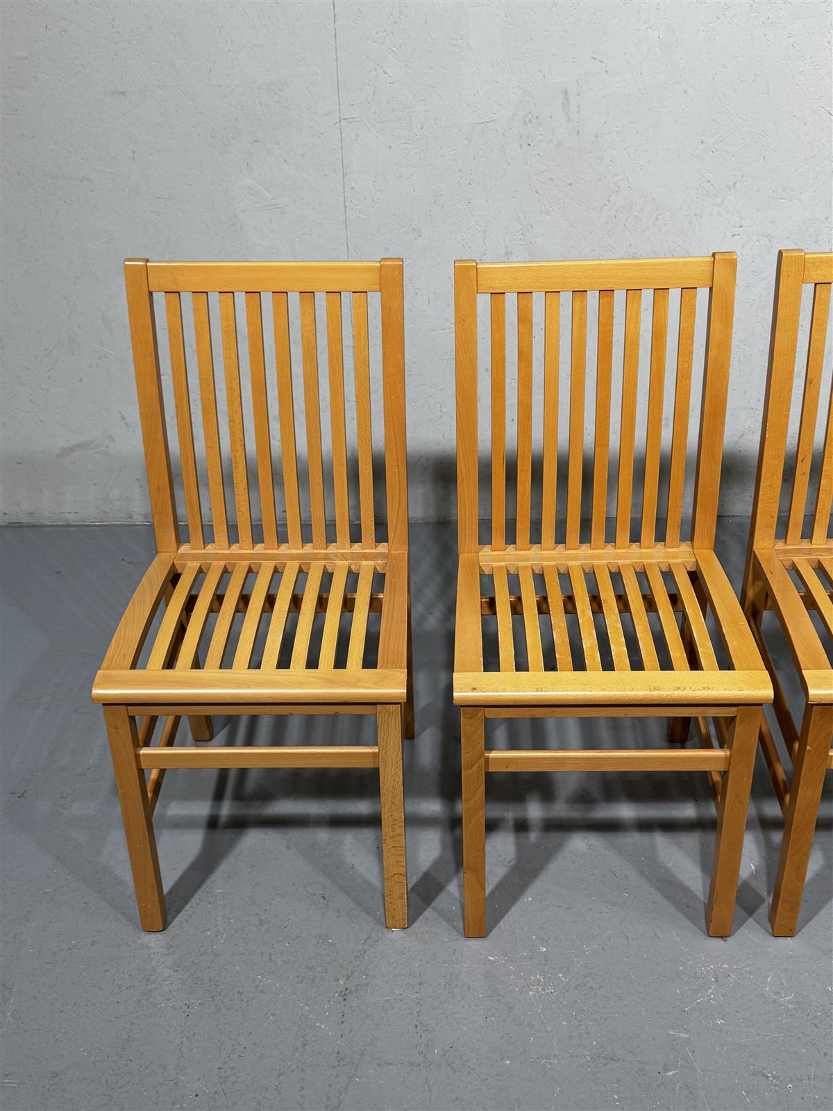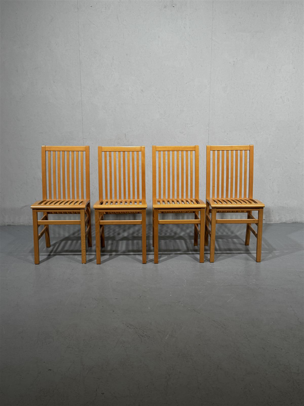 Neljä tuolia, joissa on pystysuorat selkänojat ja vaakasuorat istuimet. Valmistaja Italialainen Calligaris, merkintä ’made in Italy’.