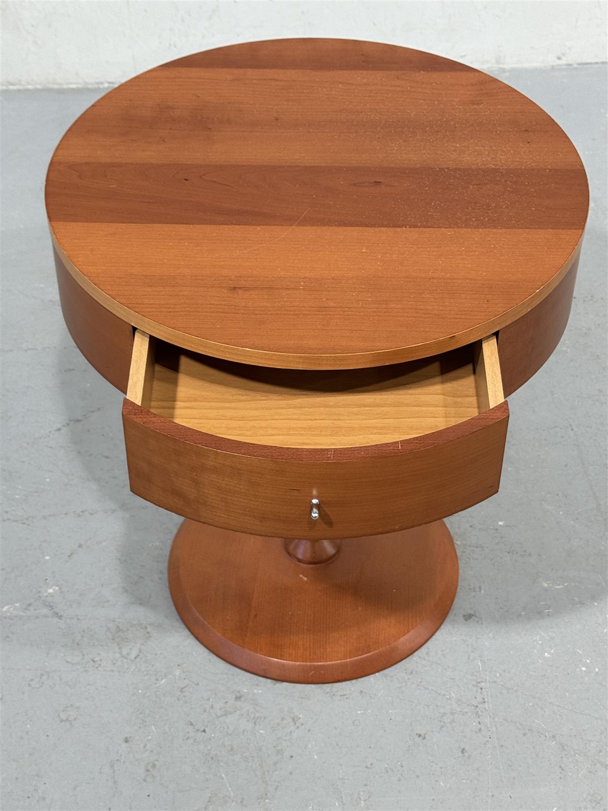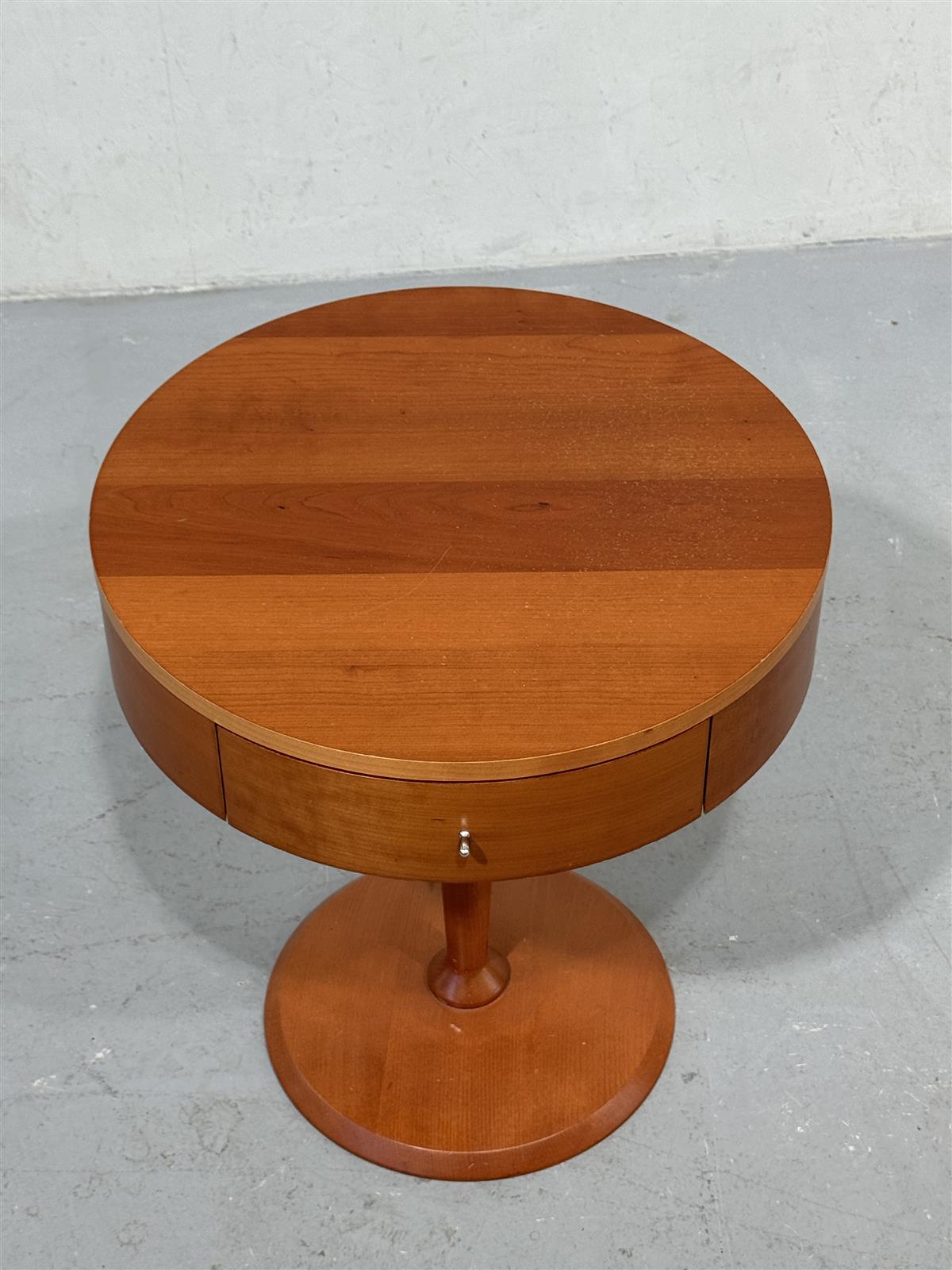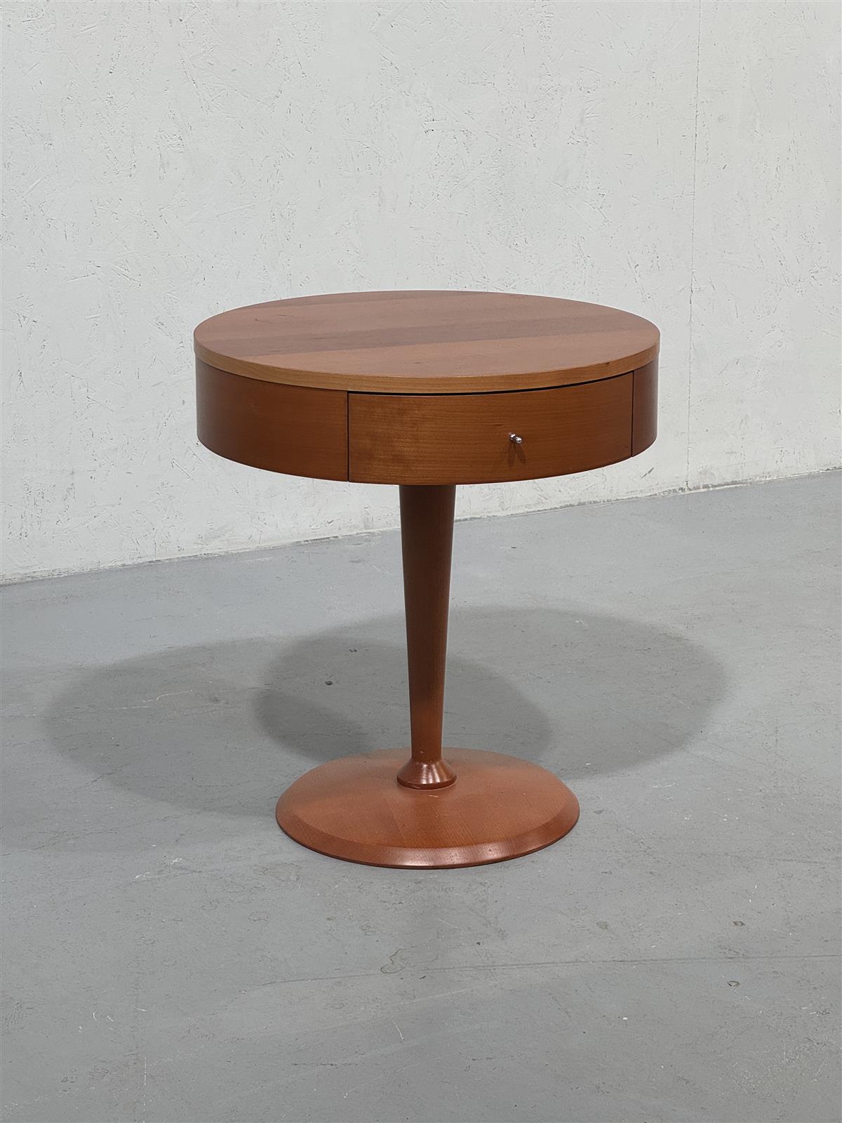 Pyöreä sivupöytä, jossa on yksi vetolaatikko. Taso päällä pyörii jalan ympärillä. Pöydän jalka on keskitetty ja pyöreä, mikä antaa sille modernin ilmeen. Pöydän pinta on sileä ja siinä on kaunis puun sävy. Valmistaja italialainen Calligaris