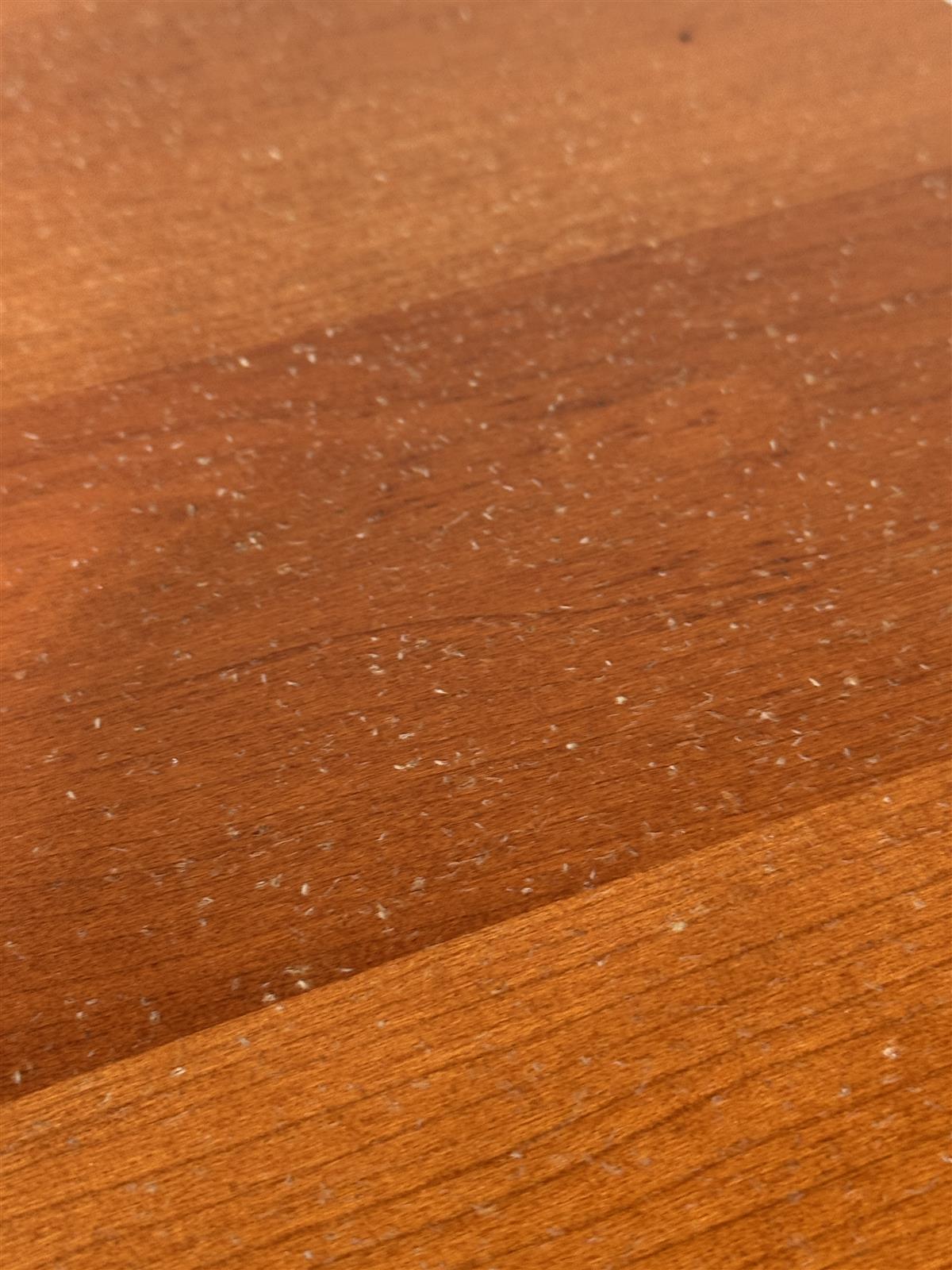 Pöydässä on havaittavissa pieniä naarmuja ja kulumajälkiä tasossa, mutta yleisesti se on hyvässä kunnossa. Pinta on säilynyt siistinä ja laatikko toimii moitteettomasti.