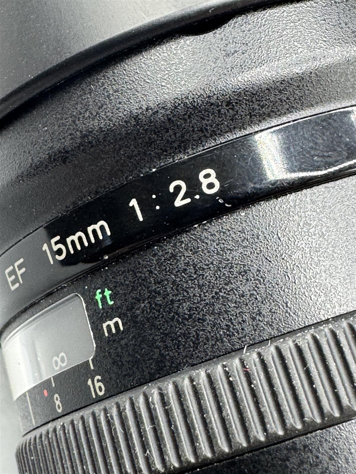 Canonin fisheye-objektiivi, jossa on 15 mm polttoväli ja f/2.8 aukko. Objektiivi on suunniteltu EF-kiinnitykselle ja siinä on automaattitarkennus sekä manuaalitarkennus.