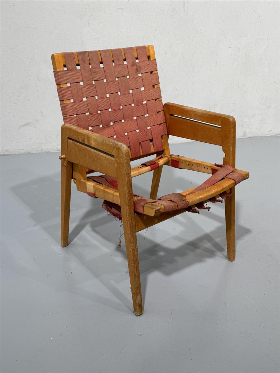 Nikolai Bomans Ångsnickeri Ab klassikko Dublett tuoli, jossa on remmi kangasistuin ja selkänoja. Runko on puuta, ja siinä on yksinkertainen rakenne, joka mahdollistaa tuolin istuinkorkeuden säädön kahteen eri asentoon. Tuolin muotoilu on selkeä ja funktionaalinen, mikä viittaa skandinaaviseen minimalismiin.