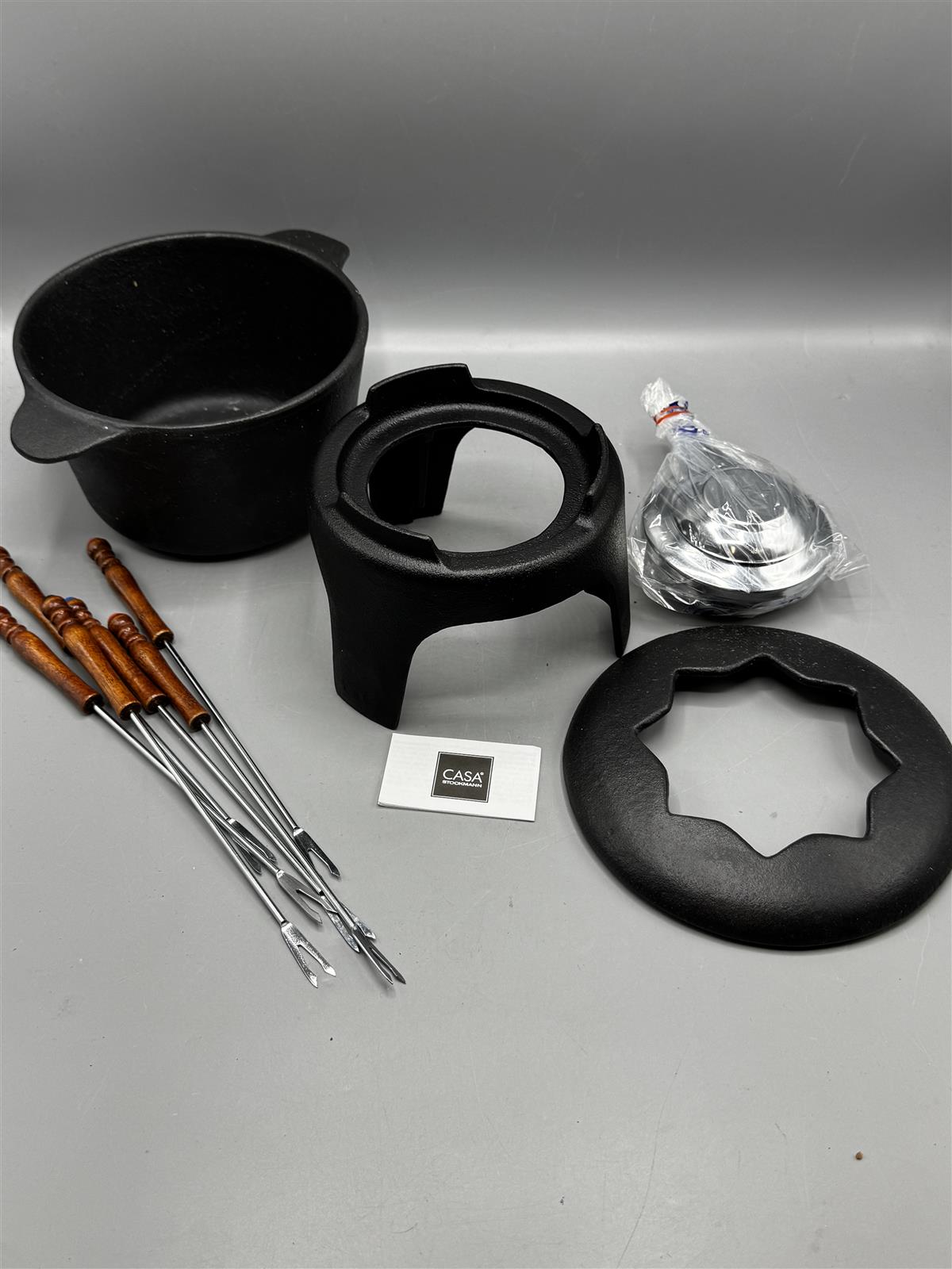 Fondue-setti, joka sisältää valurautaisen kattilan, polttimen ja haarukat. Valmistaja on Casa Stockmann. Setti on musta ja siinä on puiset kahvat haarukoissa.