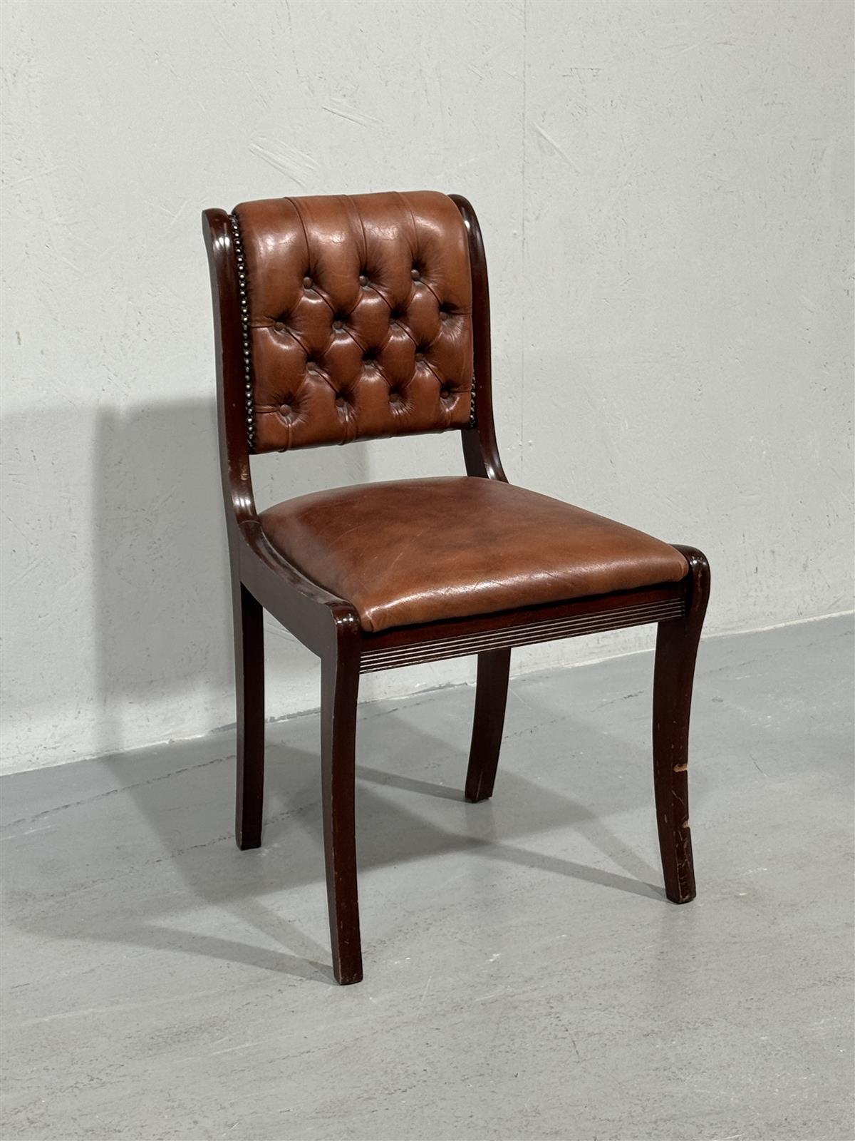 Tyylikäs chesterfield tuoli, jossa on ruskea nahkaverhoilu ja koristeelliset napit selkänojassa. Tuolin runko on tummaksi käsiteltyä puuta, mikä korostaa sen eleganssia.