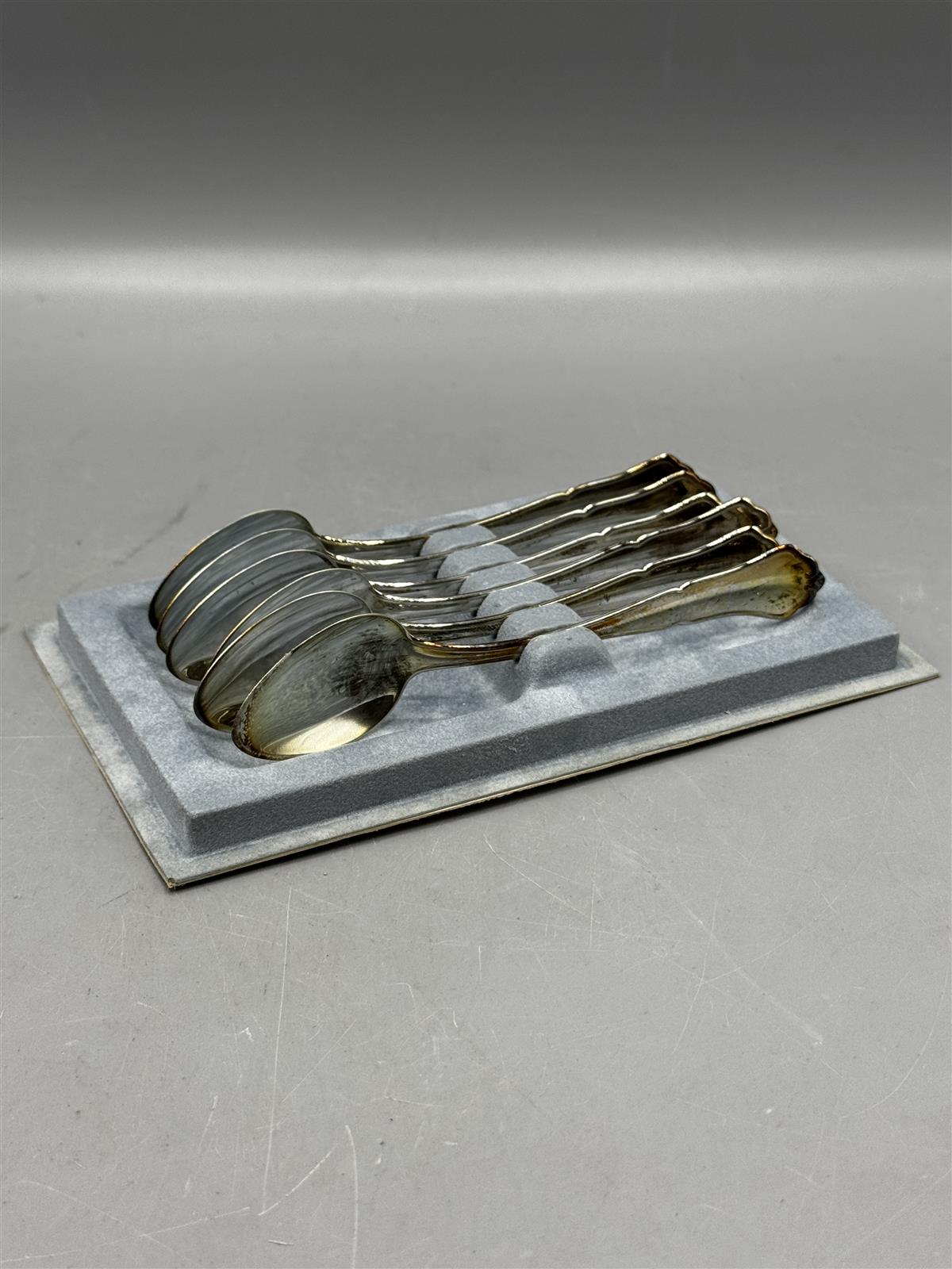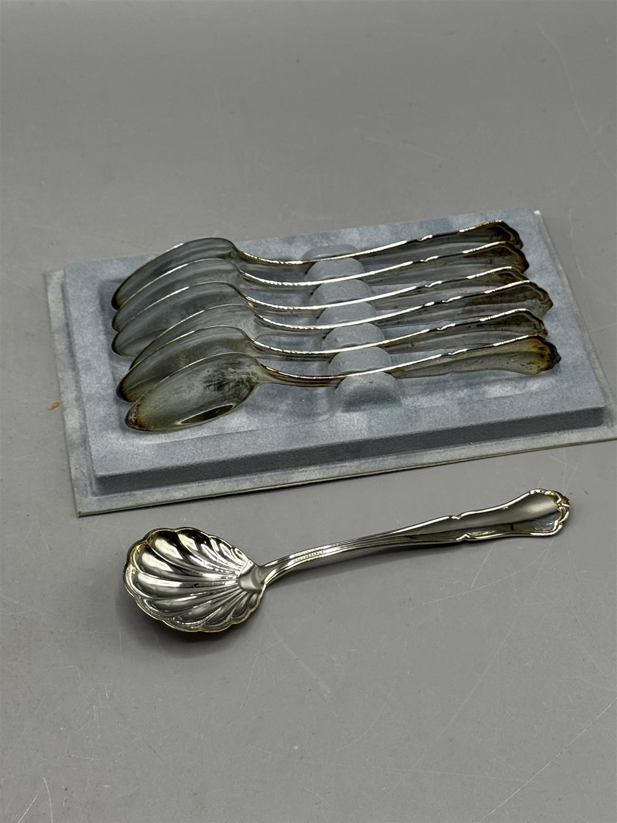 Chippendale hopealusikat, 6 kpl laatikossa sekä samalla kahvalla oleva koristeinen sokerilusikka (kunto siisti). Ei kaiverruksia, pituus kahvilusikalla noin 11.5cm ja paino kaikilla lusikoilla noin 92g. Leimat takana H830.
