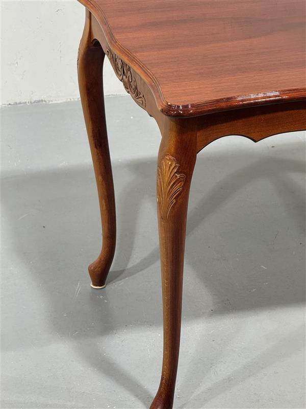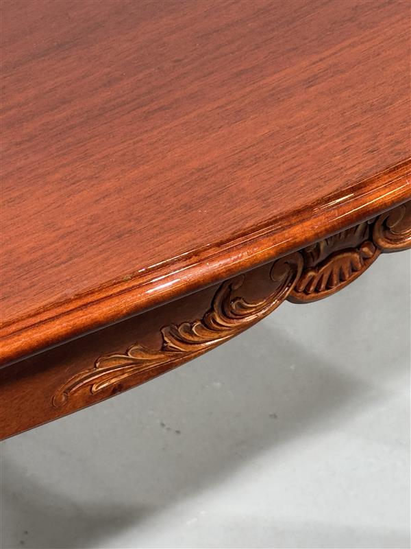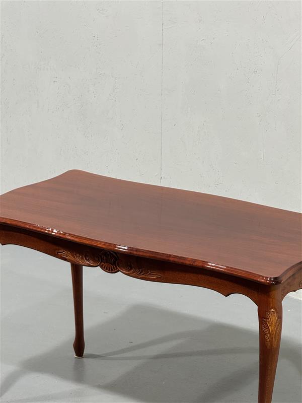 Klassinen puinen pöytä kauniilla kaiverruksilla ja kaarevilla jaloilla.