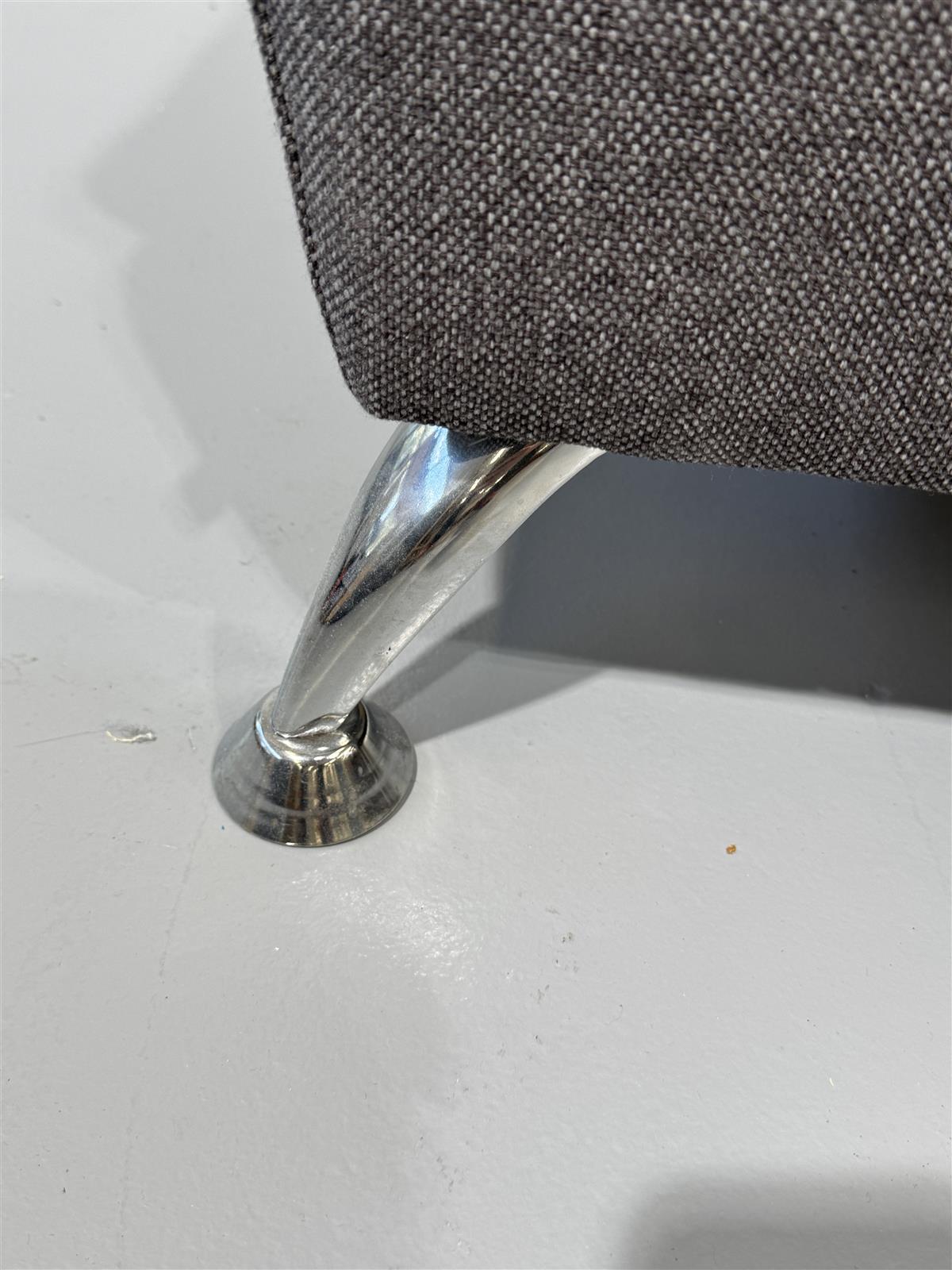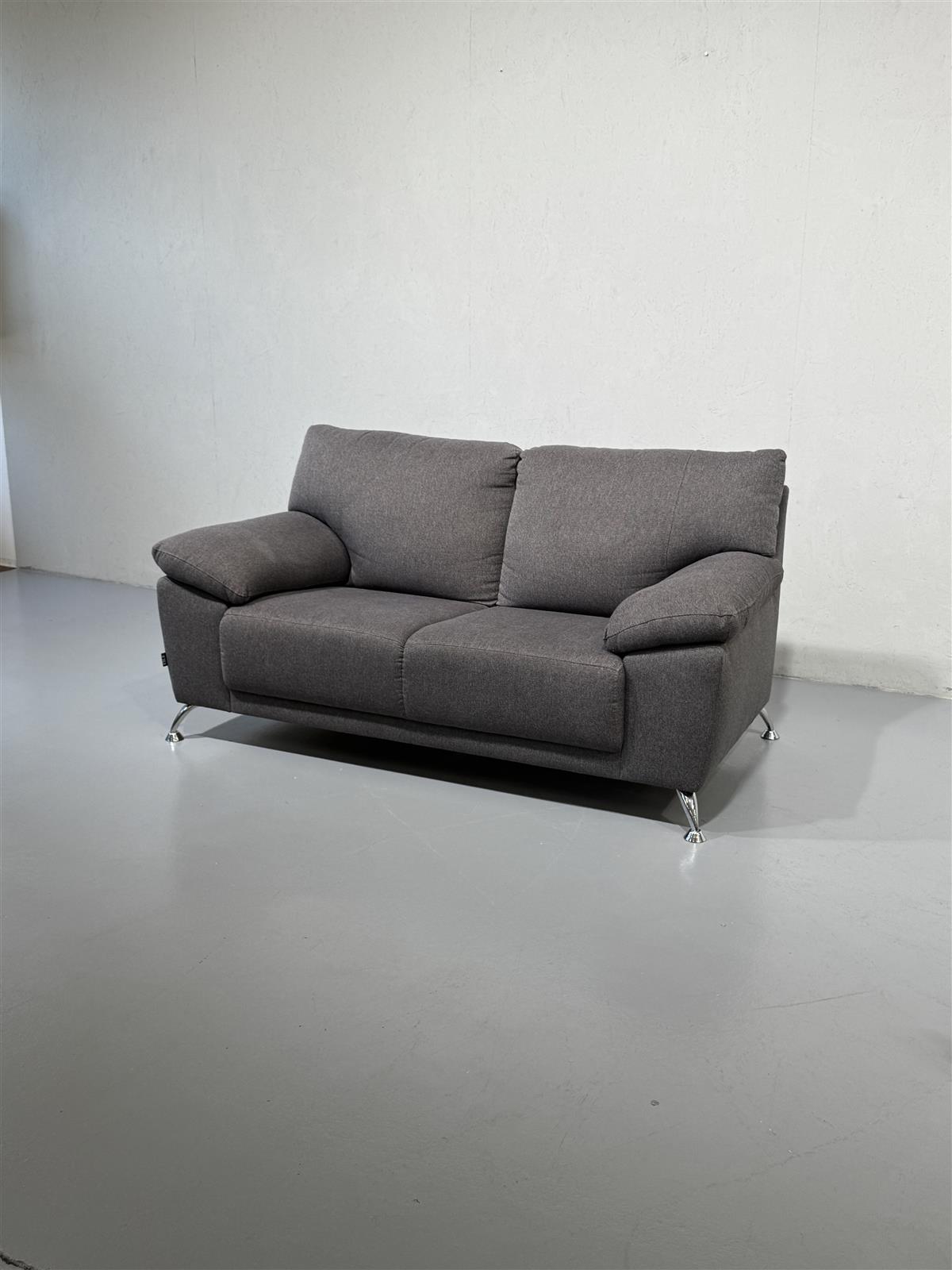 Moderni harmaa sohva, jossa on pehmeät tyynyt ja tukevat käsinojat. Kromatut jalat antavat tyylikkään ilmeen ja tukevat rakennetta hyvin. Istuinkorkeus noin 43cm