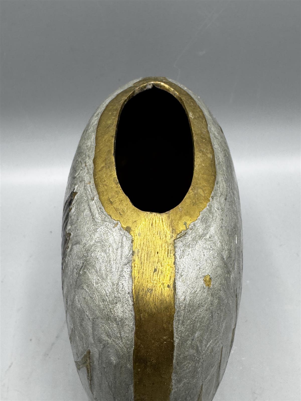 Cloisonne tekniikalla koristeltu messinkinen vaasi, jossa on koristeellinen lintukuviointi. Vaasi on muodoltaan pyöreä ja siinä on kapea suuaukko.