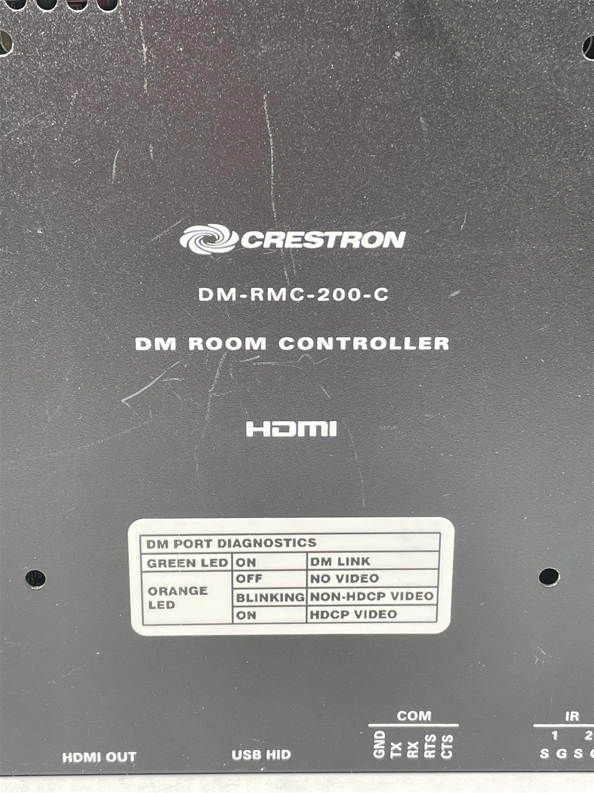 Crestron DM-RMC-200-C on DM Room Controller, joka tukee HDMI-liitäntää. Laitteessa on useita portteja, kuten HDMI OUT ja USB HID. Mukana on myös DM-portin diagnostiikka LED-valoilla.