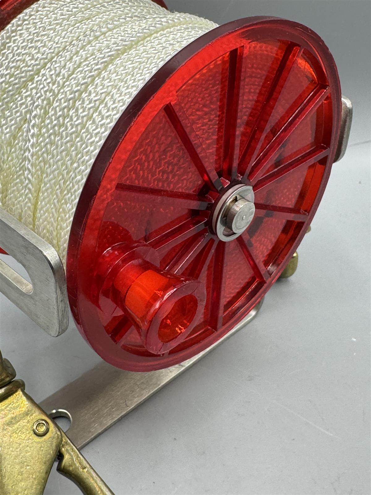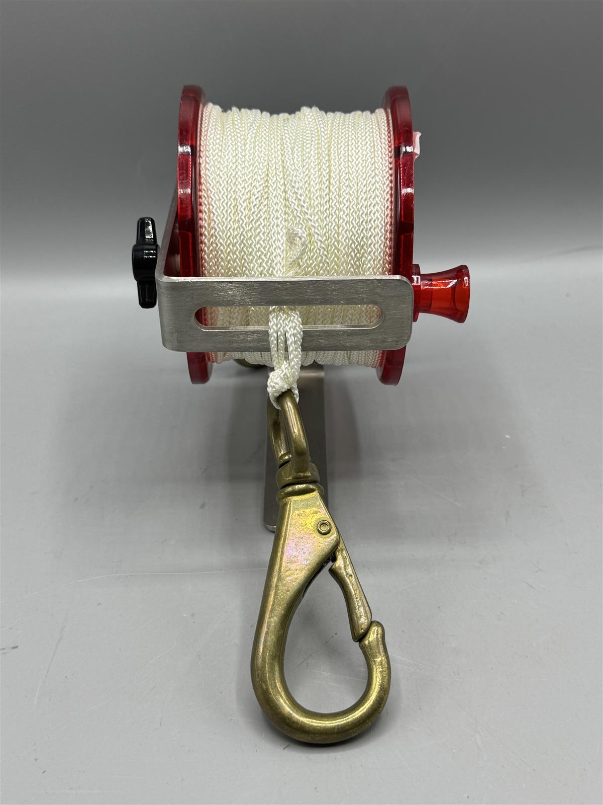 Kestävä Dive Rite kelarulla, jossa on punainen muovinen kela ja valkoinen naru. Metallinen runko ja messinkiset karabiinihaat tekevät siitä tukevan ja luotettavan käytössä. Sopii erityisesti sukelluskäyttöön tai muuhun vastaavaan tarpeeseen, jossa tarvitaan luotettavaa narukelajärjestelmää.