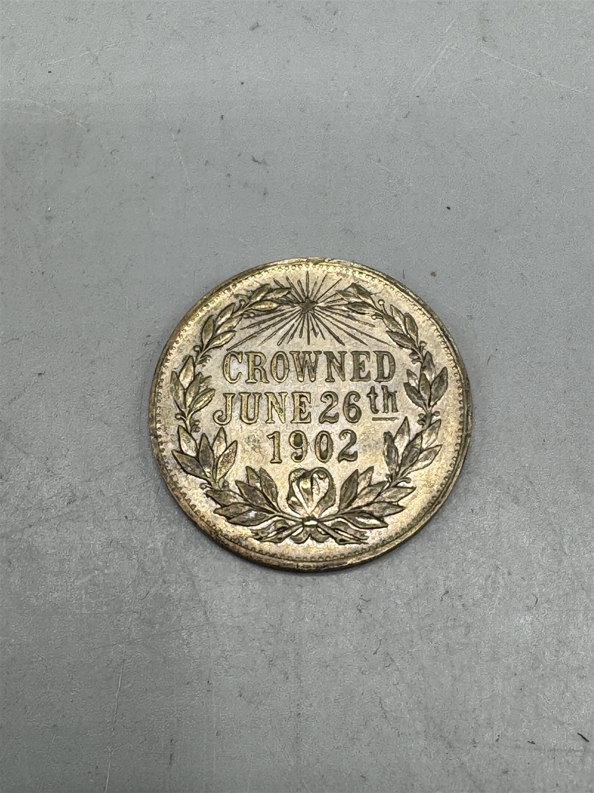 Harvinainen Edward VII:n ja kuningatar Alexandran kruunajaiskolikko vuodelta 1902. (A Rare Edwardian Coronation coin marked Crowned 26th June 1902 coin, possible silver coin, not medal). Kolikon etupuolella on kuningas Edward VII:n ja kuningatar Alexandran profiilit, ja takapuolella on kruunajaispäivämäärä 26. kesäkuuta 1902.