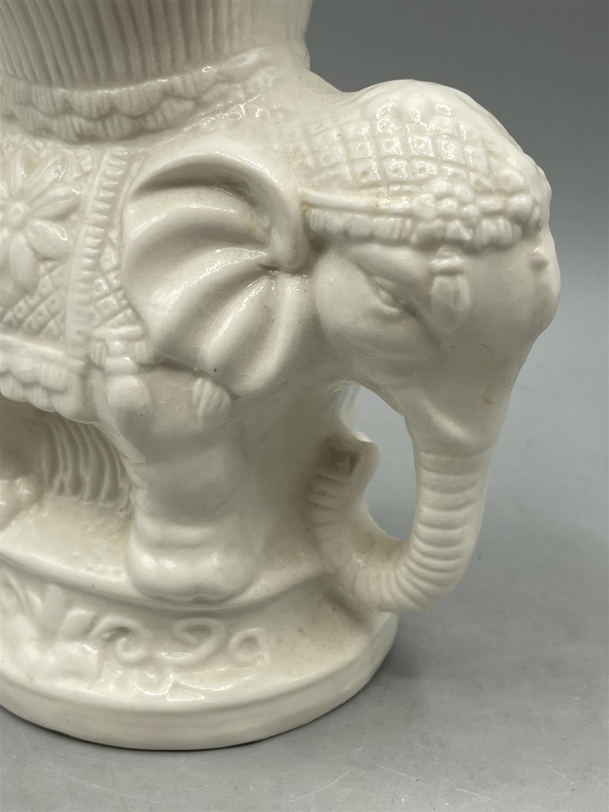 Kaksi valkoista koriste-esinettä, joista toinen on Elefanttimaljakko ja toinen Buddha-pää figuuri. Molemmat esineet ovat yksityiskohtaisesti kuvioituja ja valkoisia.