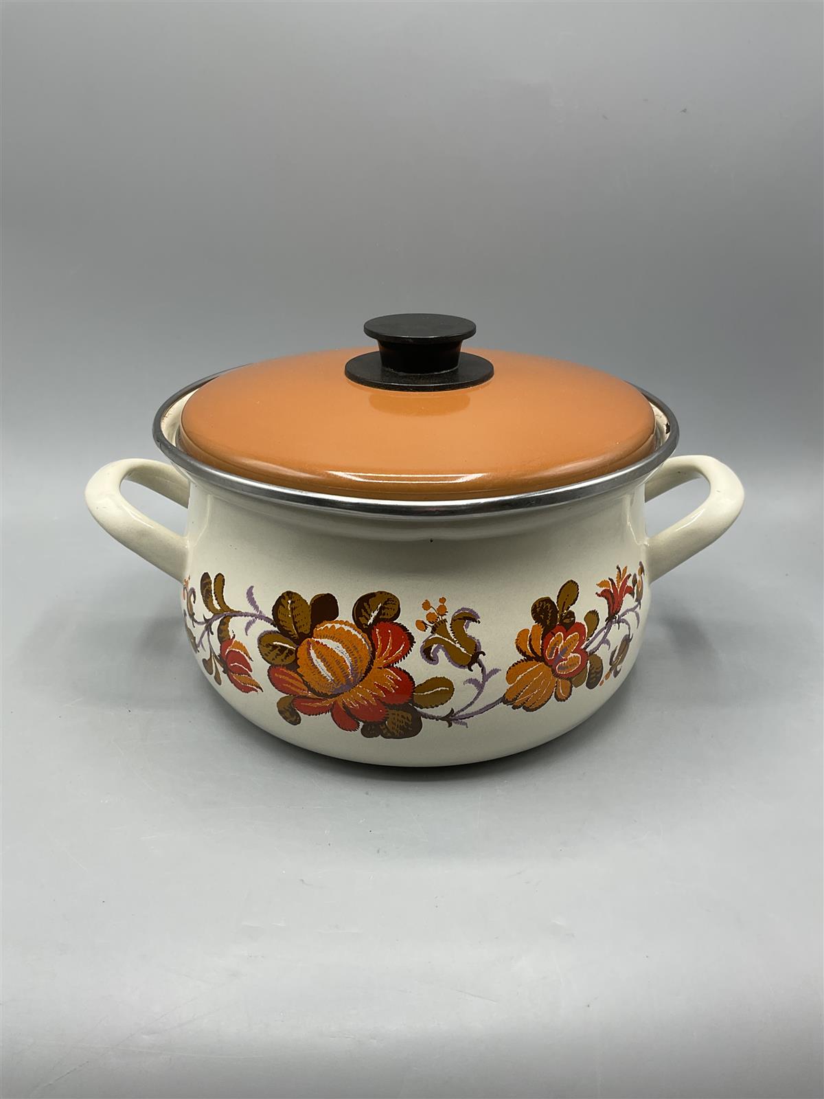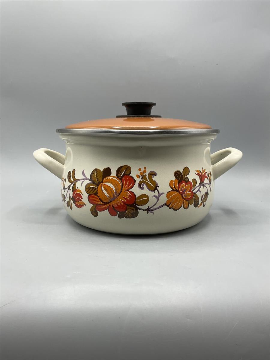 Retro Emaloitu kattila, jossa on kauniit kukkakuviot.