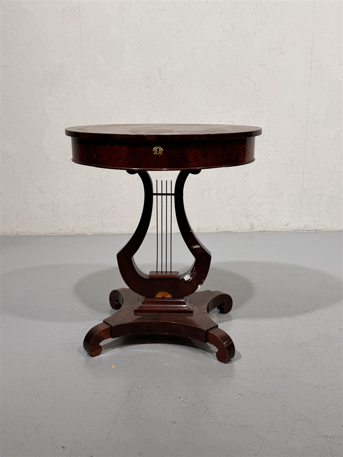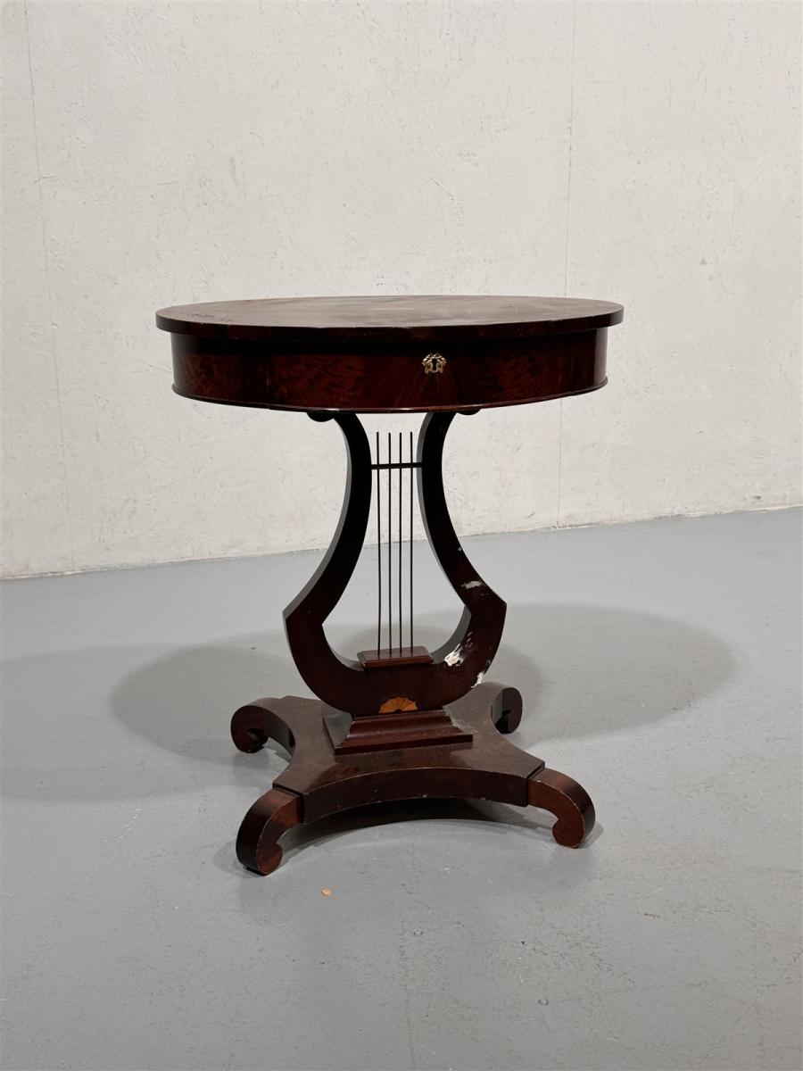 Empire-tyylinen ompelupöytä, jossa on ovaali puinen kansi ja koristeellinen lyyra jalka. Pöydässä on myös pieni vetolaatikko, joka avautuu etupuolelta. Pöydän jalka on muotoiltu kauniisti ja siinä on koristeellisia yksityiskohtia.