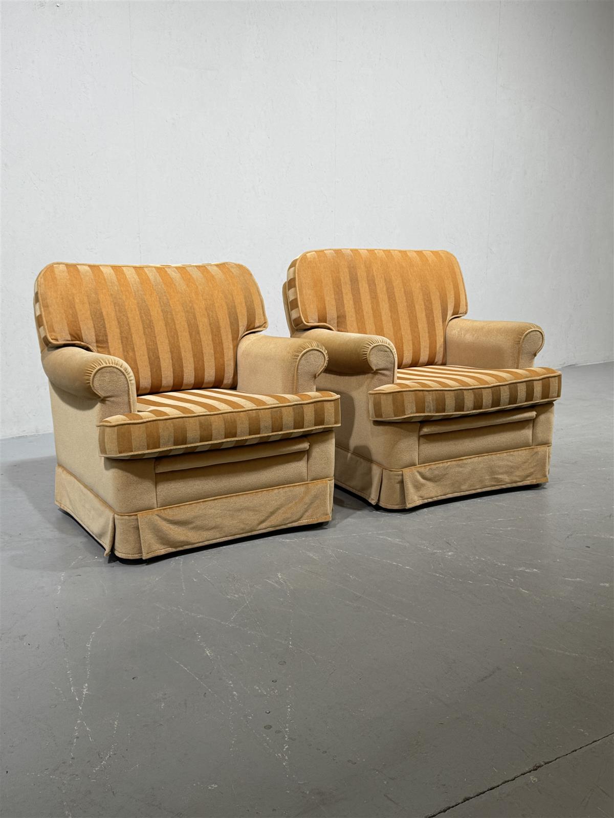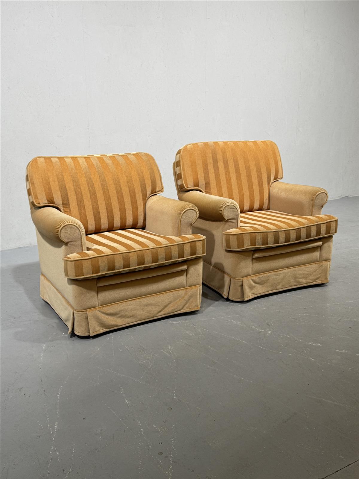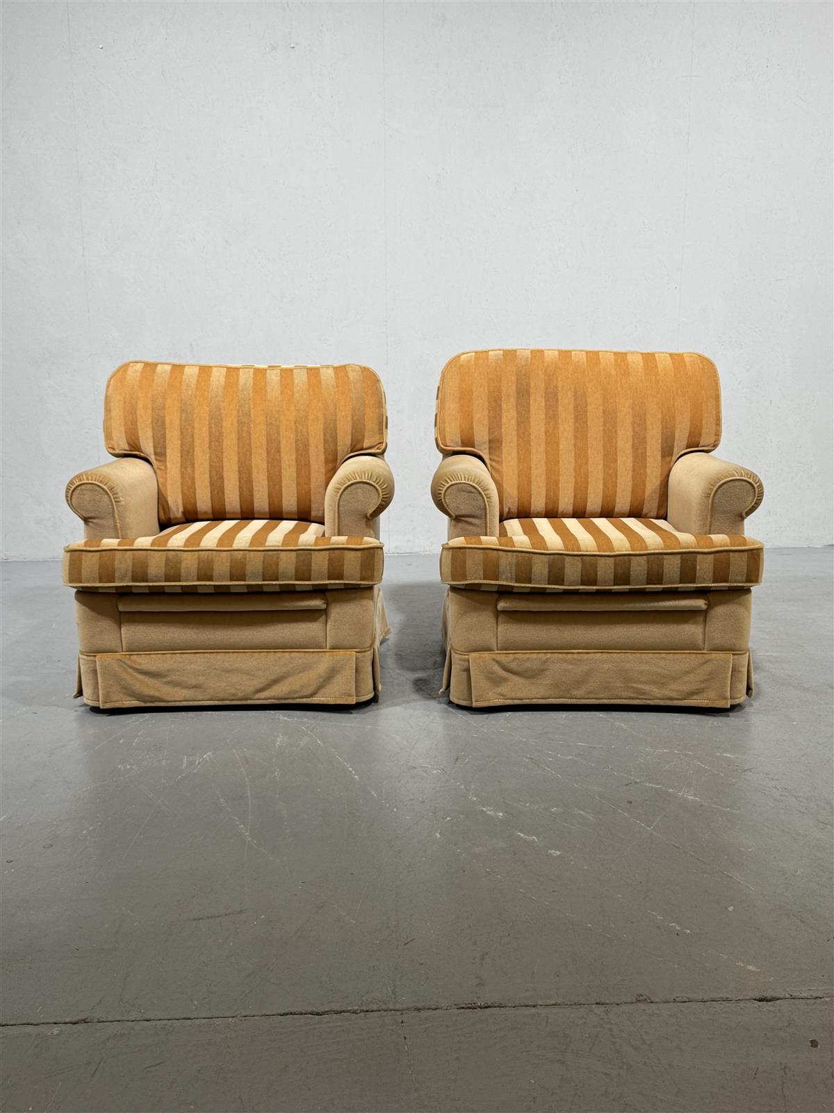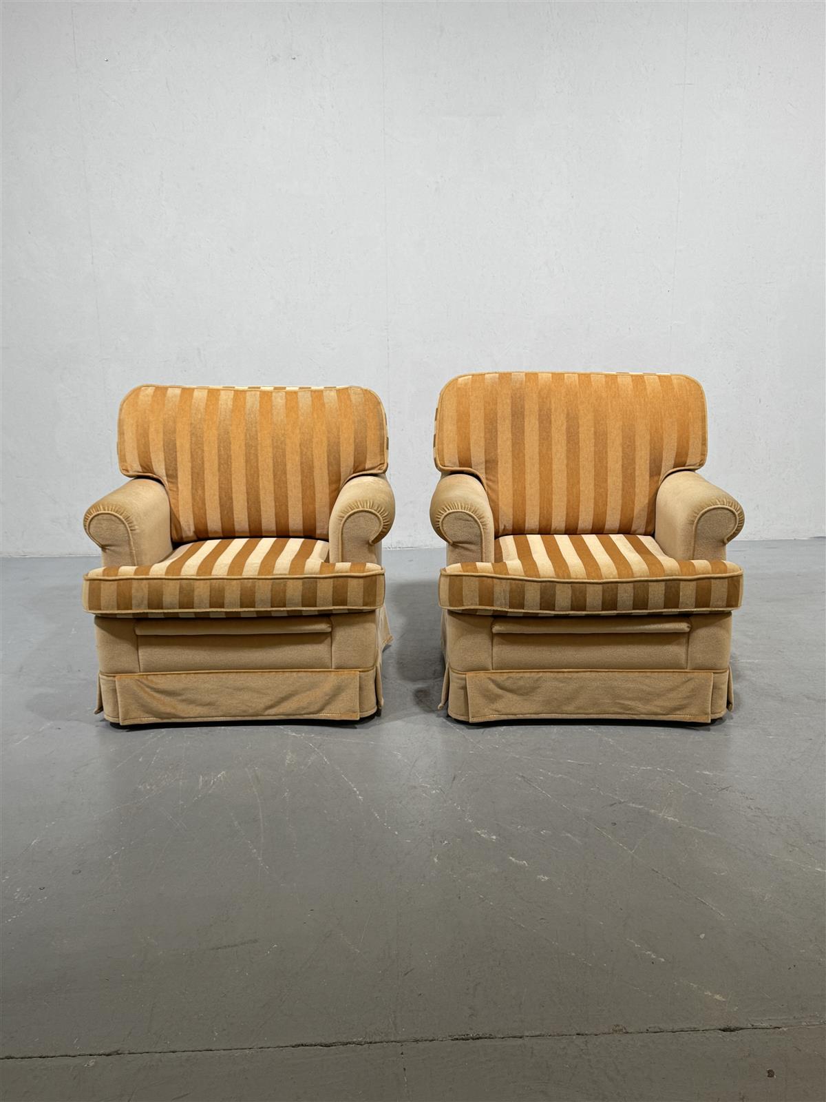 Kaksi Engen nojatuolia, joissa on raidallinen verhoilu. Tuolit ovat mukavat ja tukevat, sopivat hyvin olohuoneeseen tai lukunurkkaukseen. Raidallinen kuviointi tuo eloa ja persoonallisuutta sisustukseen. Istuinkorkeus 47cm