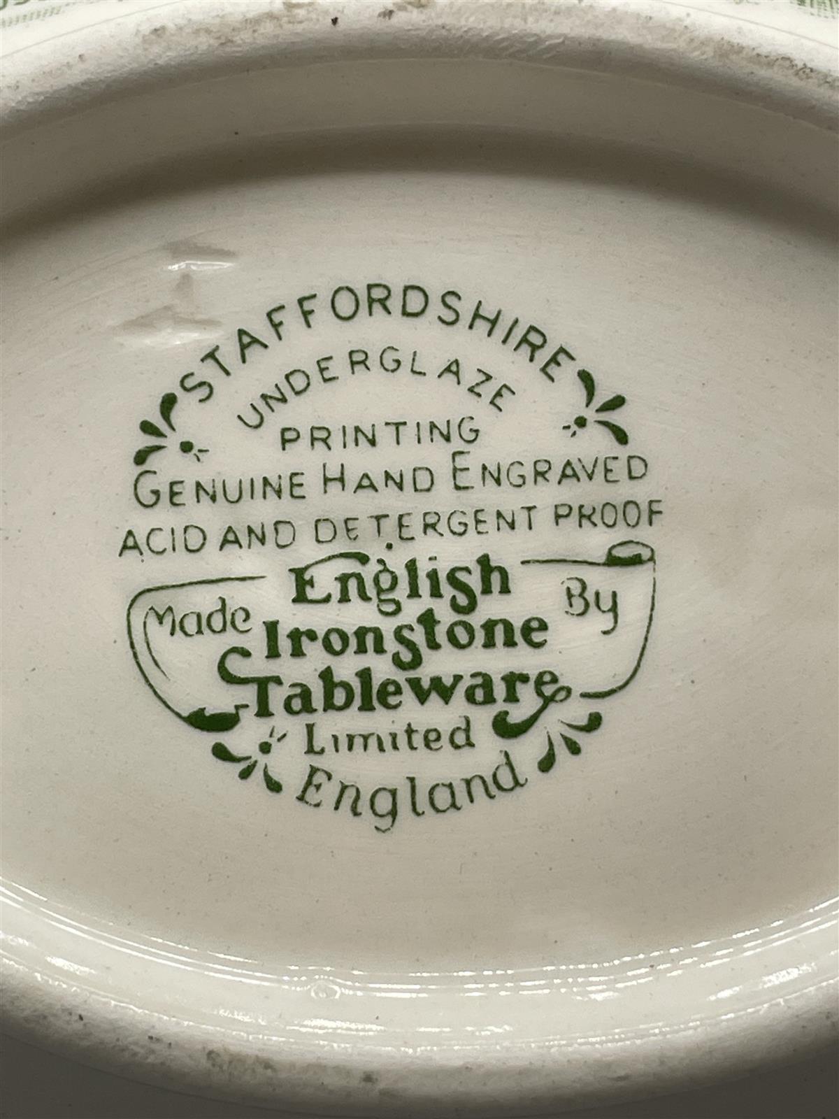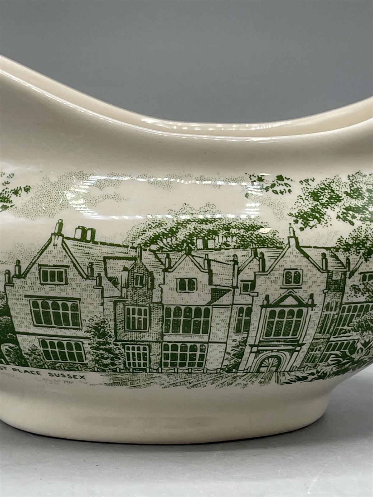 Klassinen kastikekulho, jossa on vihreä kuviointi ja teksti ’Wakehurst Place Sussex’. Valmistettu Englannissa ja se on osa English Ironstone Tablevare-sarjaa.