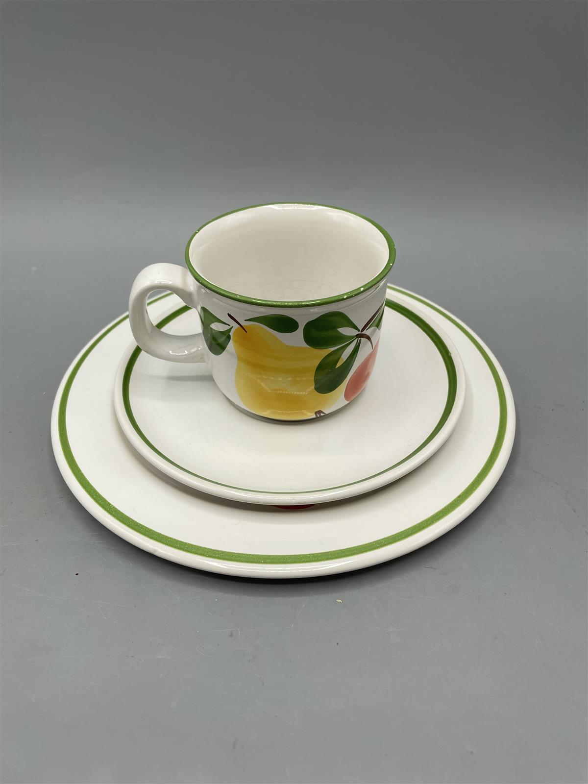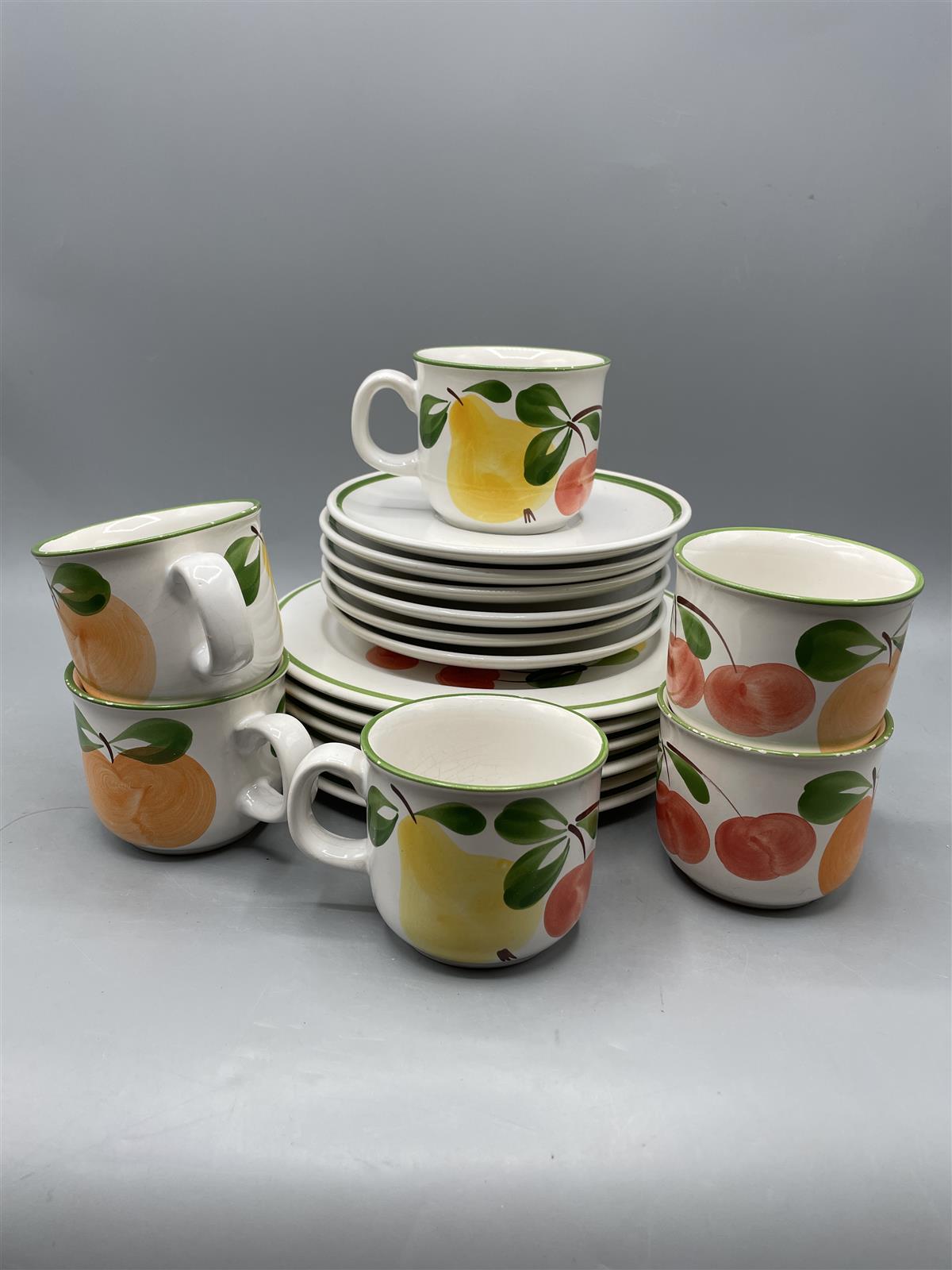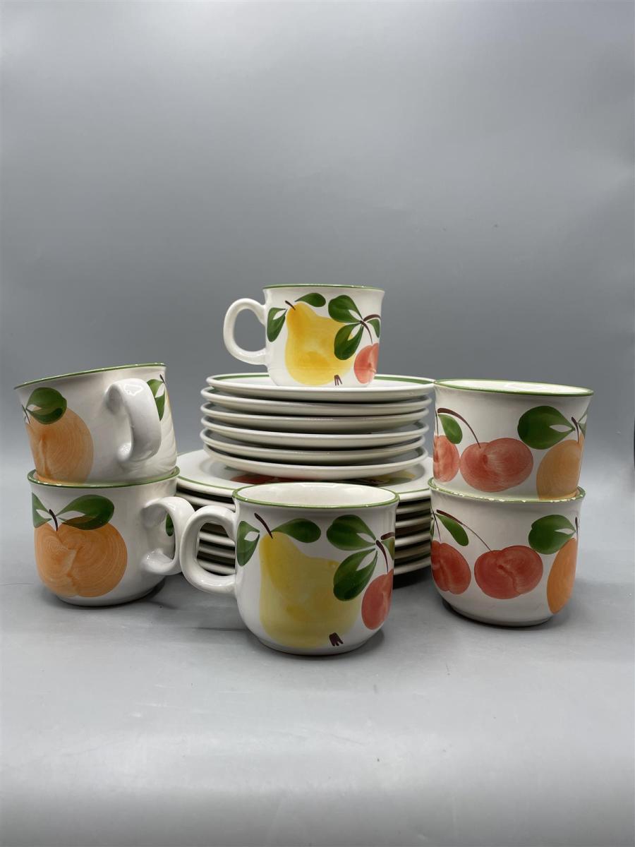 Käsinmaalatut kahvikupit ja lautaset 12-osaa, joissa on hedelmäkuvioita. Valmistaja ENO.