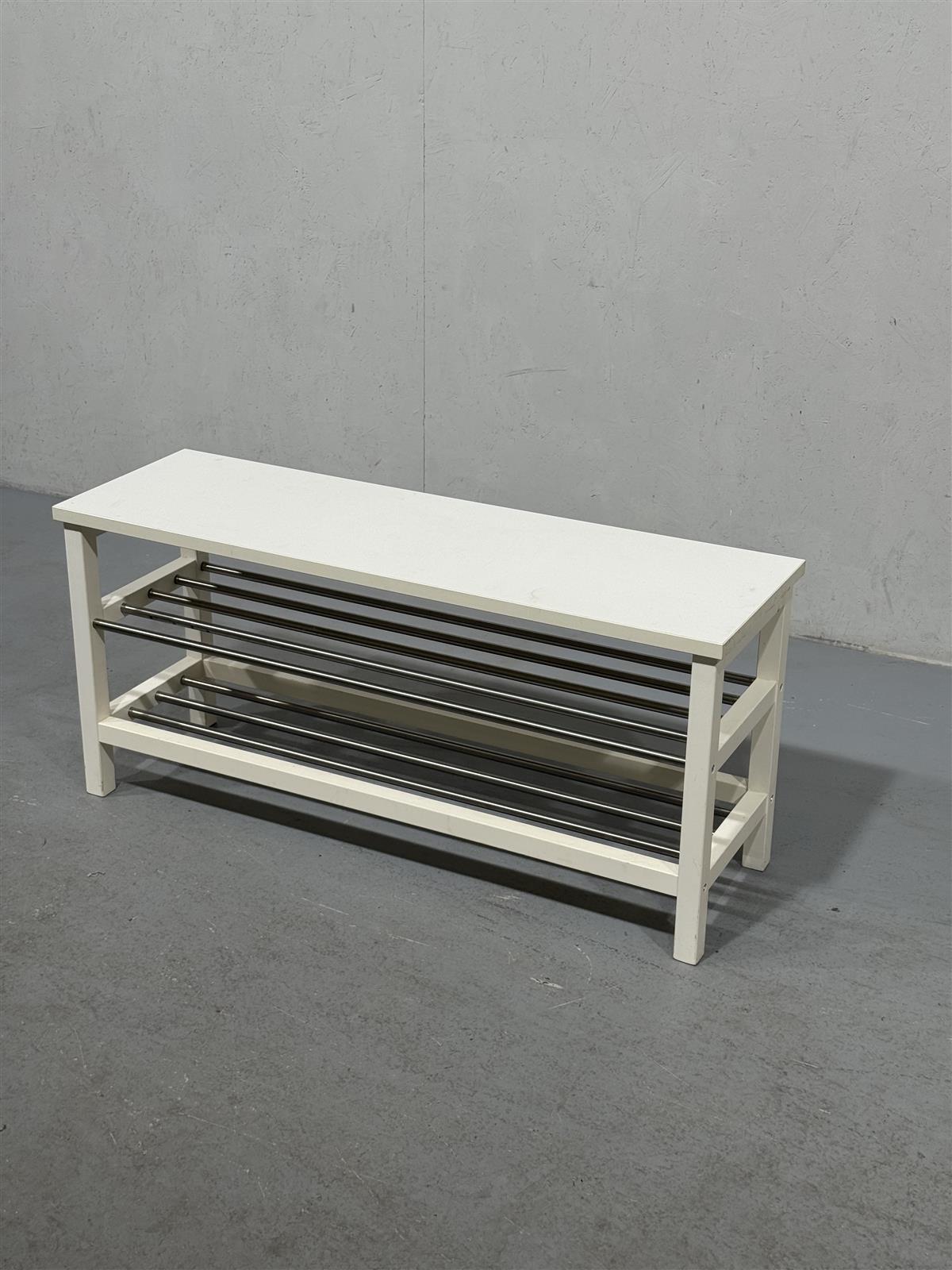 Valkoinen eteispenkki, jossa on metalliset tangot kenkien säilytystä varten. Penkki tarjoaa istumatilaa ja säilytystilaa kengille.