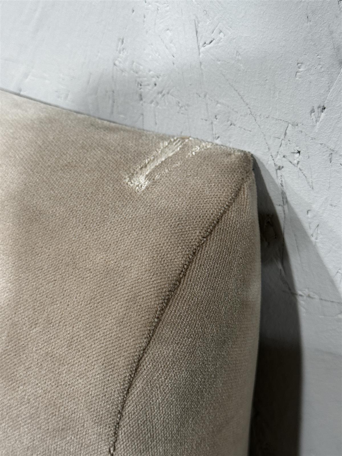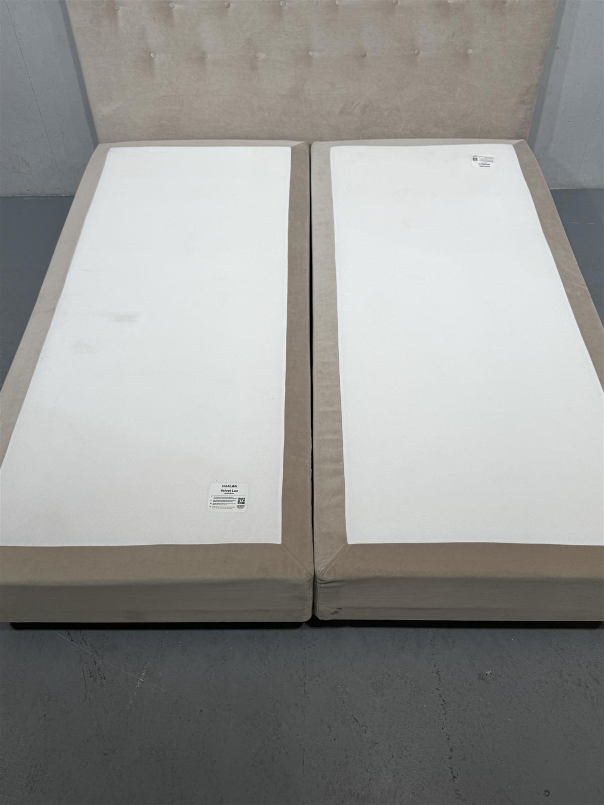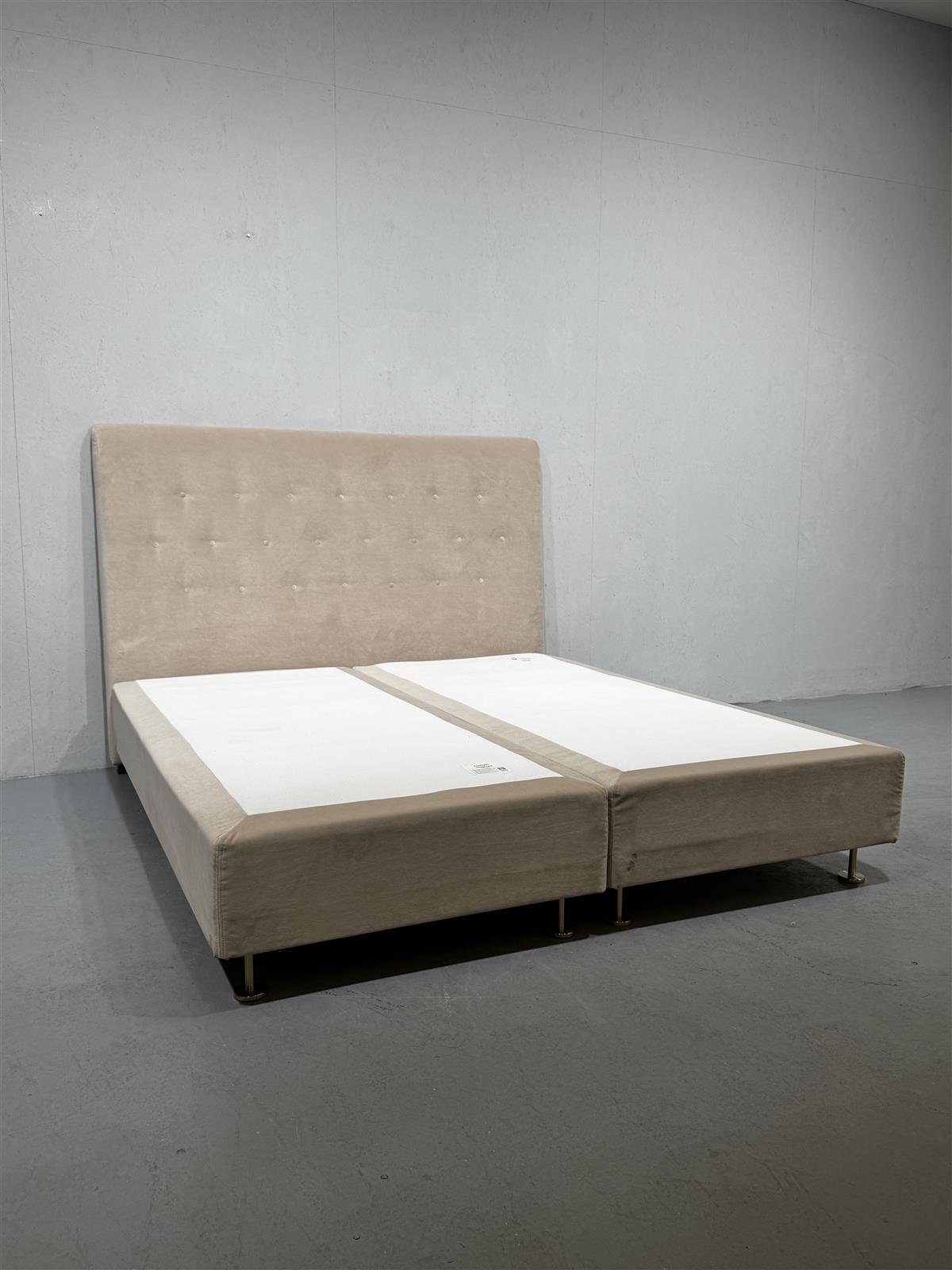 Laadukas Familon Velvet Lux jenkkisänky runkopatja 2 kpl sekä päätypala, jossa on beige verhoilu ja kultaiset jalat. Sängynpääty on mukavasti pehmustettu ja siinä on napitettu yksityiskohta.