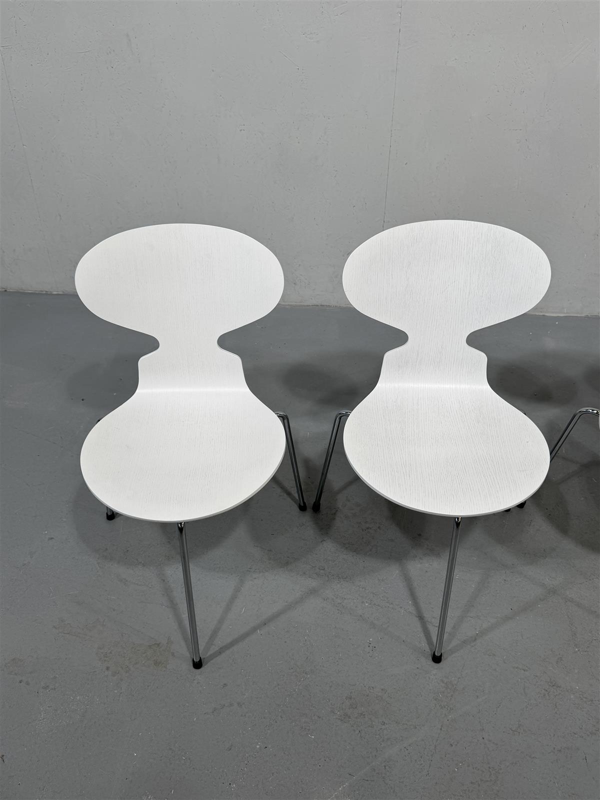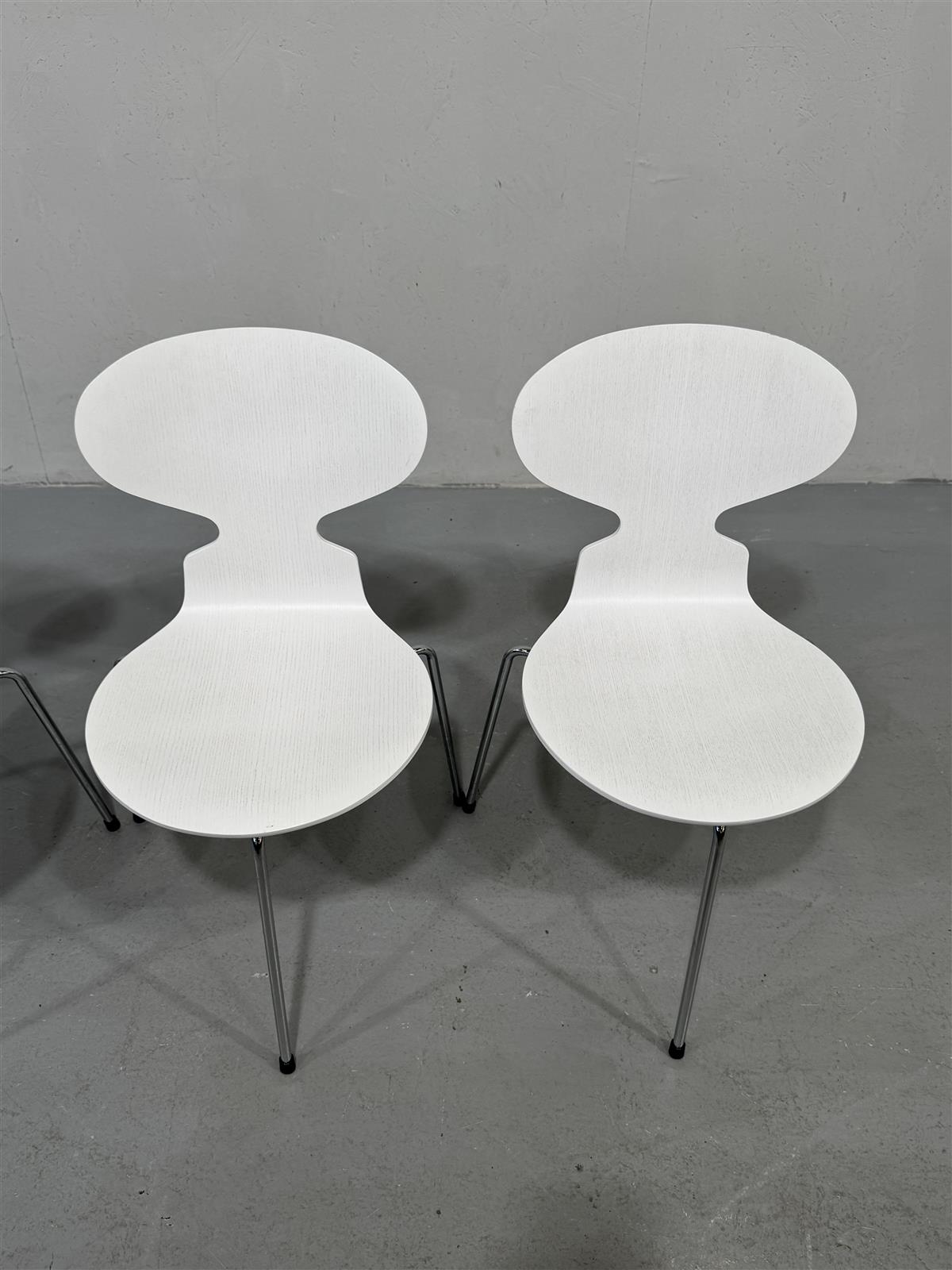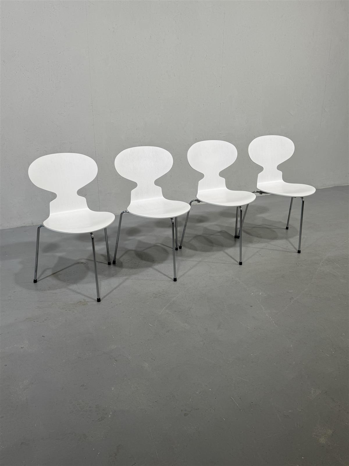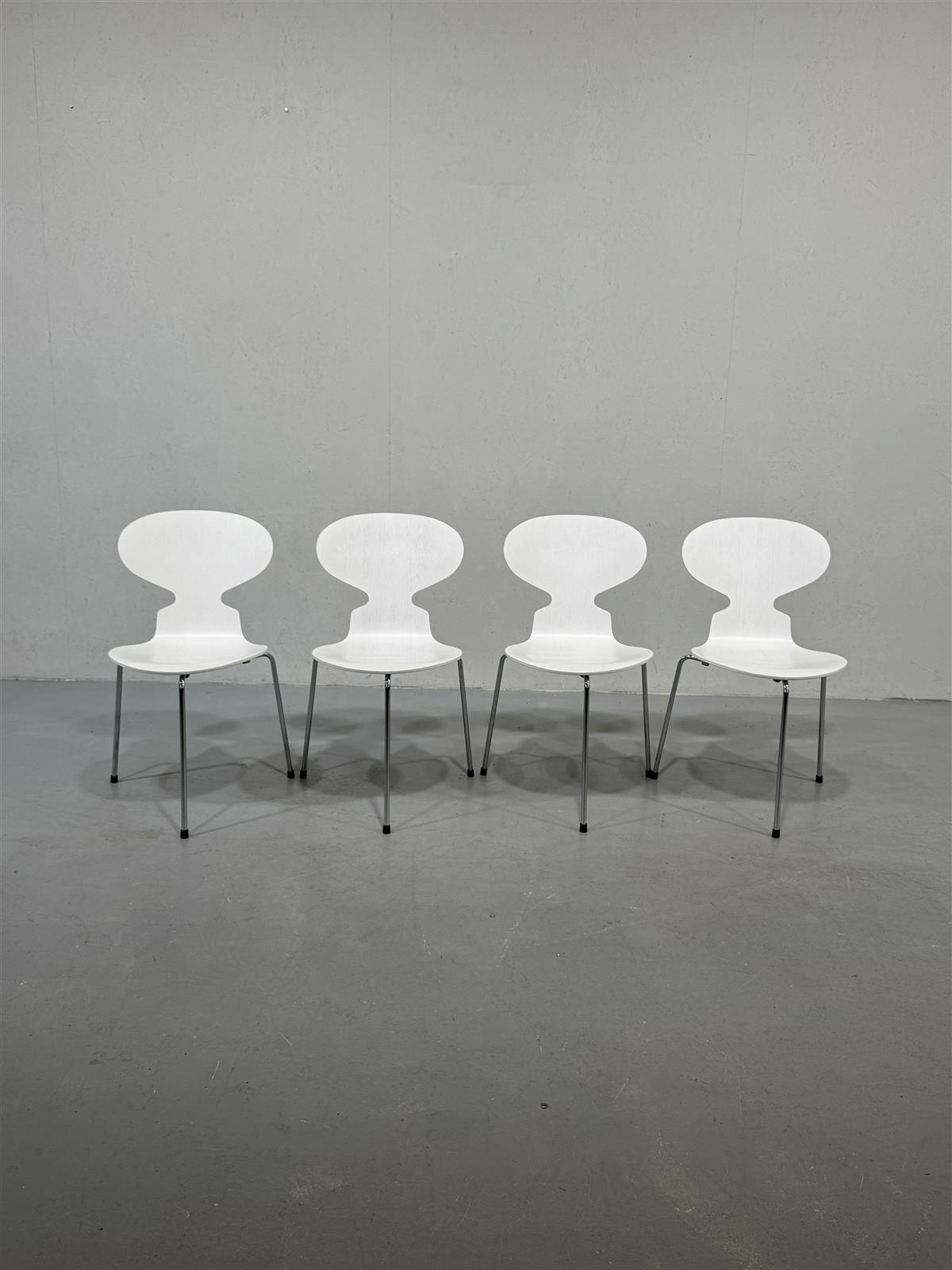Klassikko – Fritz Hansen 50 luvulla suunnittelema Muurahais tuoli. Tämä nelikko valkoinen ja tuolit seisovat tukevasti kolmella jalalla. Ehjärunkoiset tuolit, joissa hyvä kunto  – yhden tuolin selkänojan takana pinnoitelohkeama.