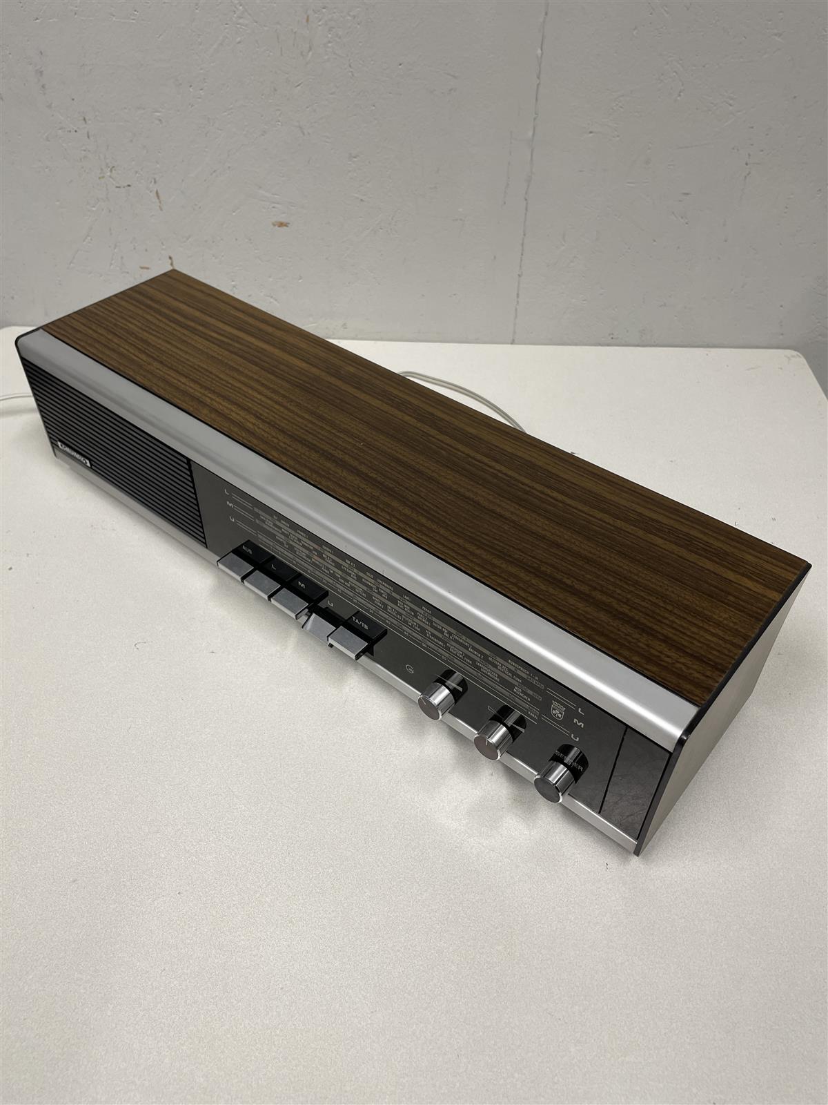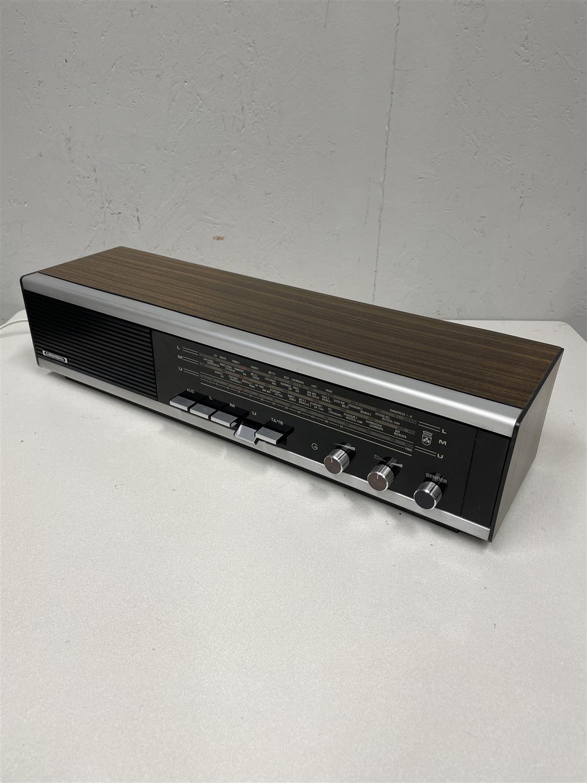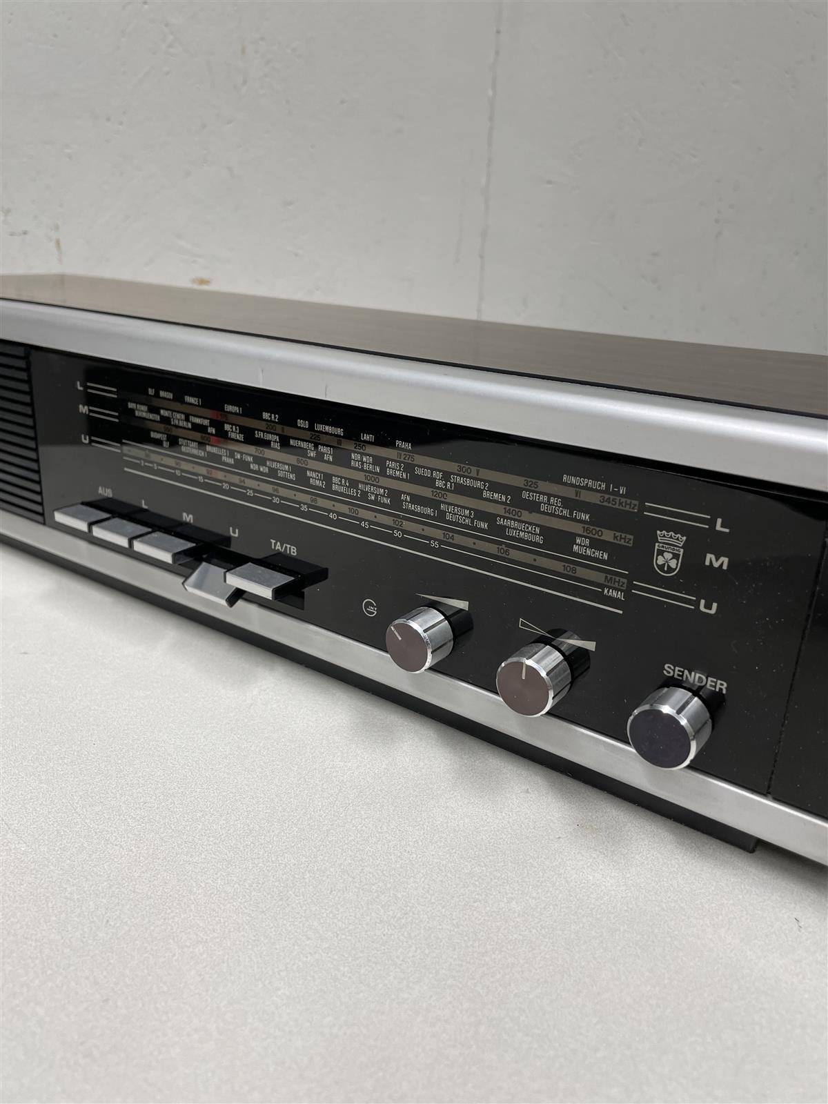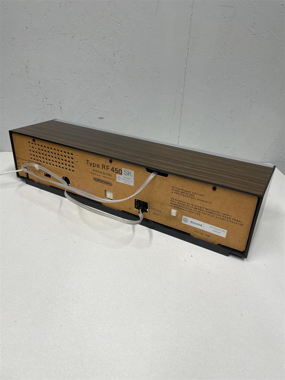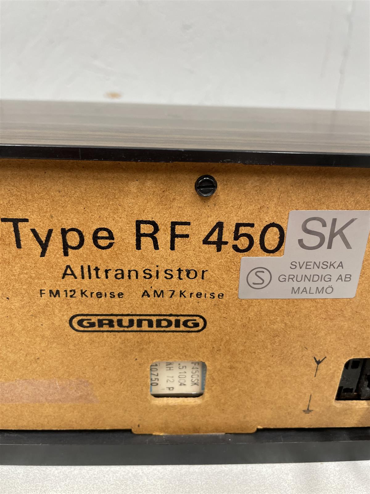 Grundig RF 450 radio 70-luvulta. Tässä mallissa on puinen kotelo ja selkeä etupaneeli, jossa on useita säätimiä ja painikkeita.