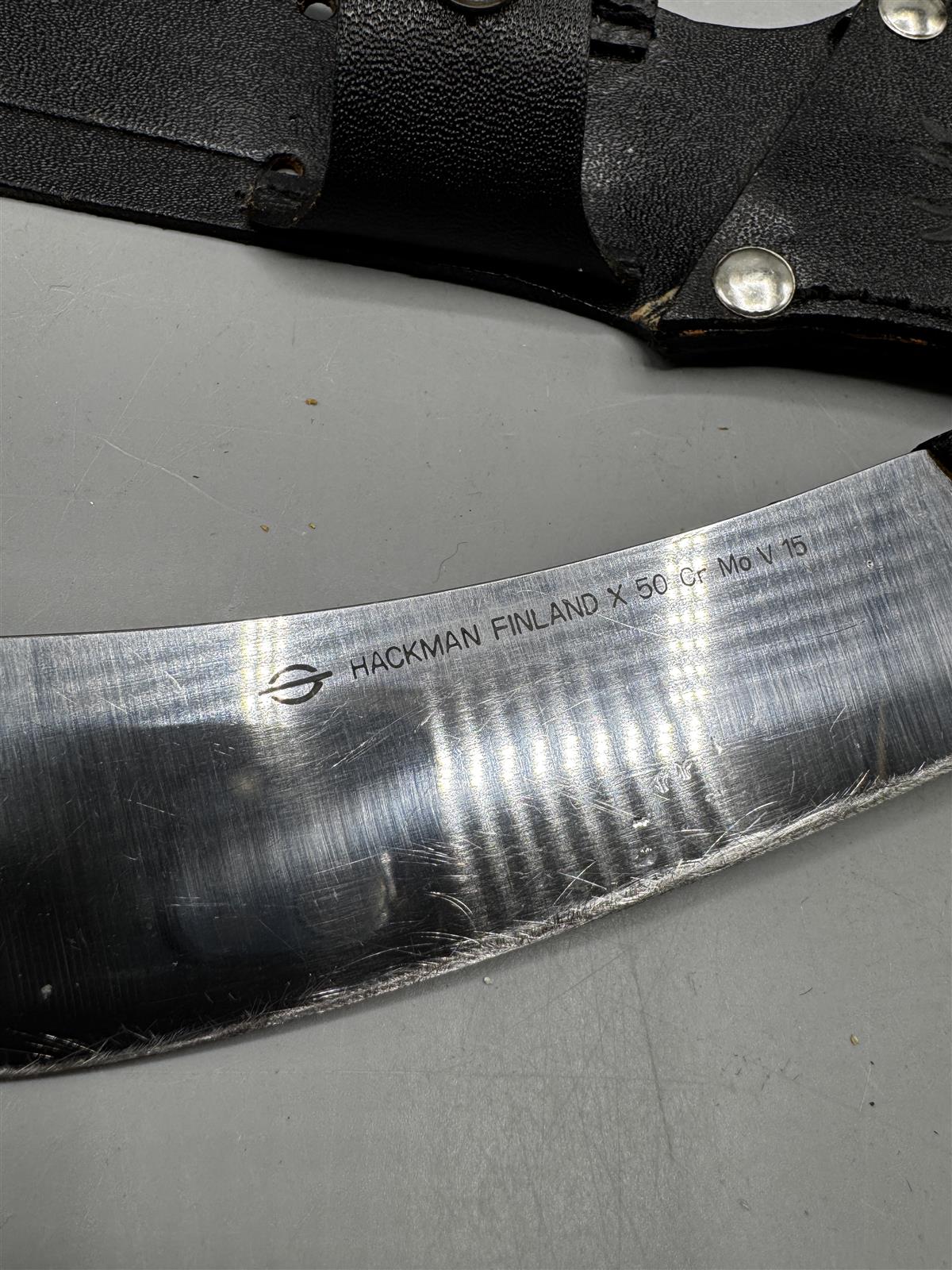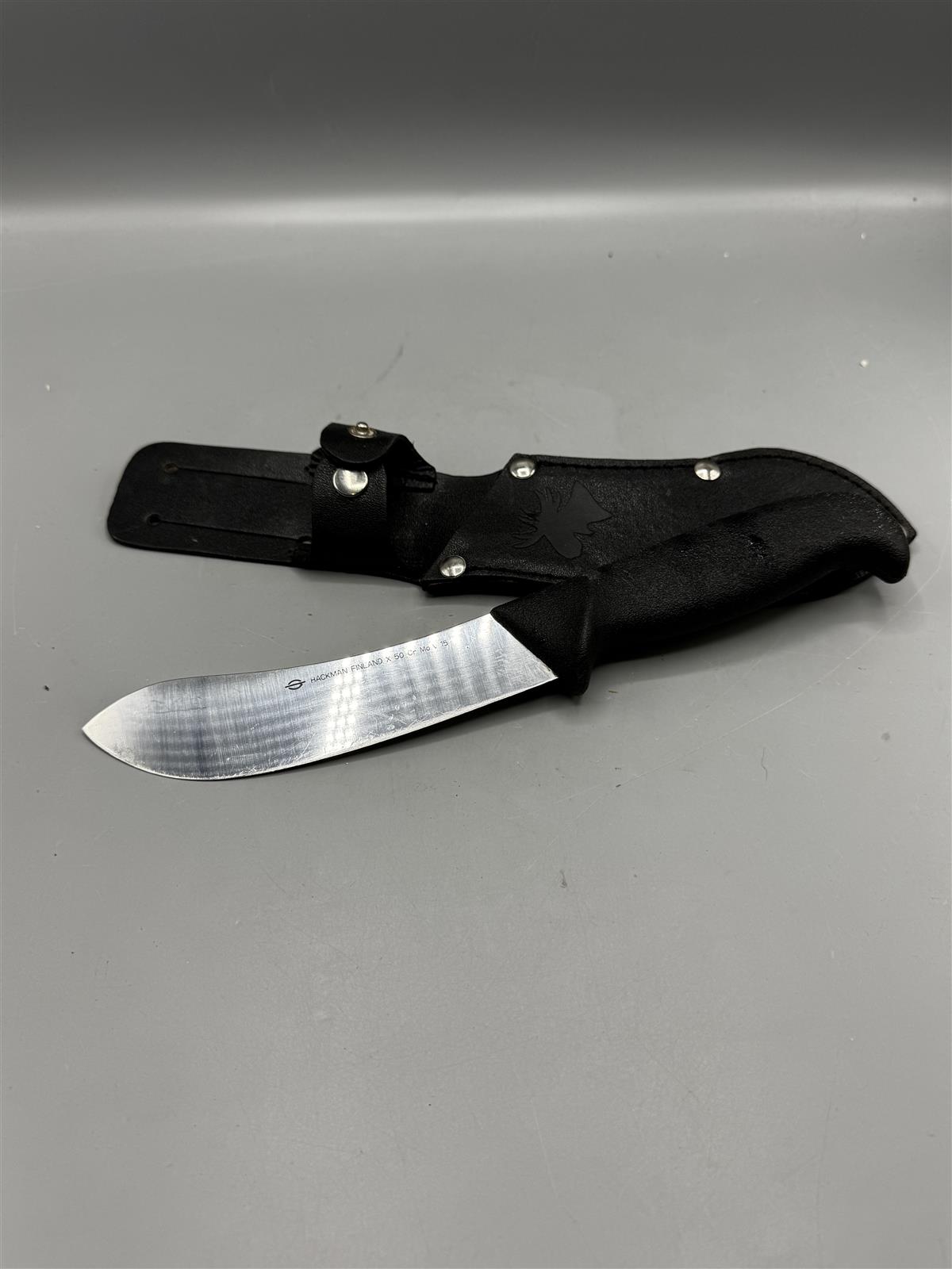 Hackman Finland -merkkinen puukko, jossa on musta kotelo. Terässä on merkintä X 50 Cr Mo V 15.