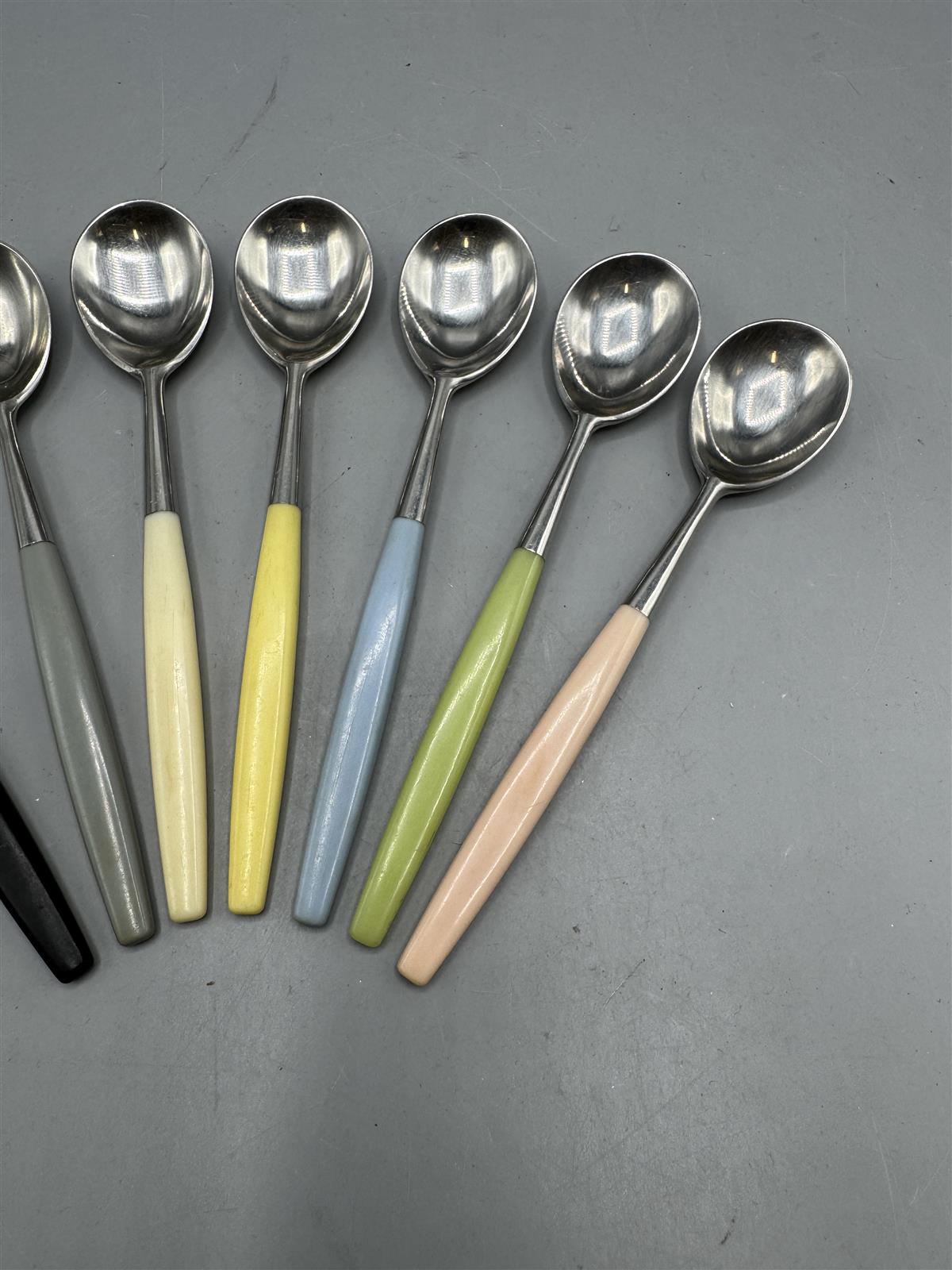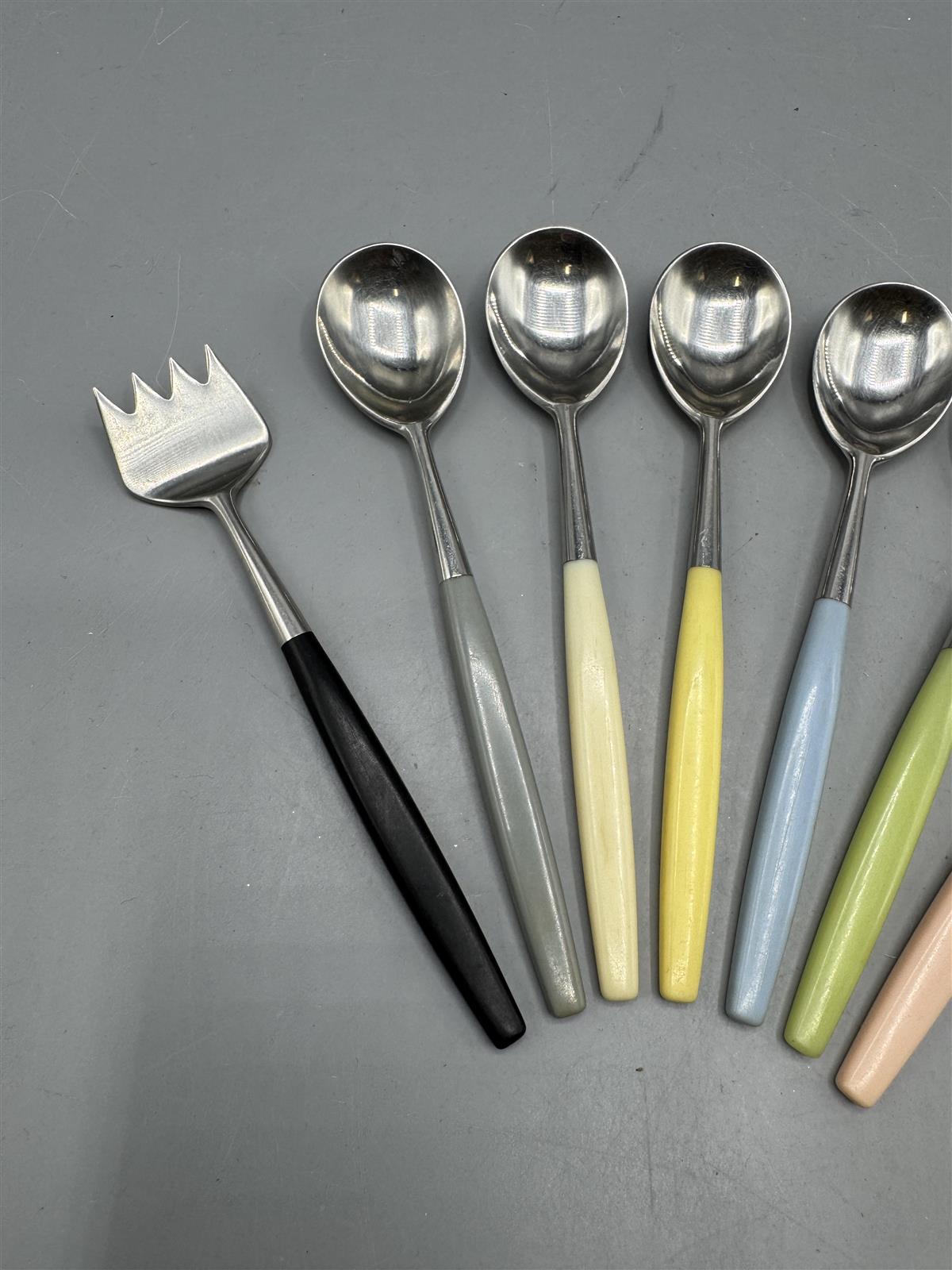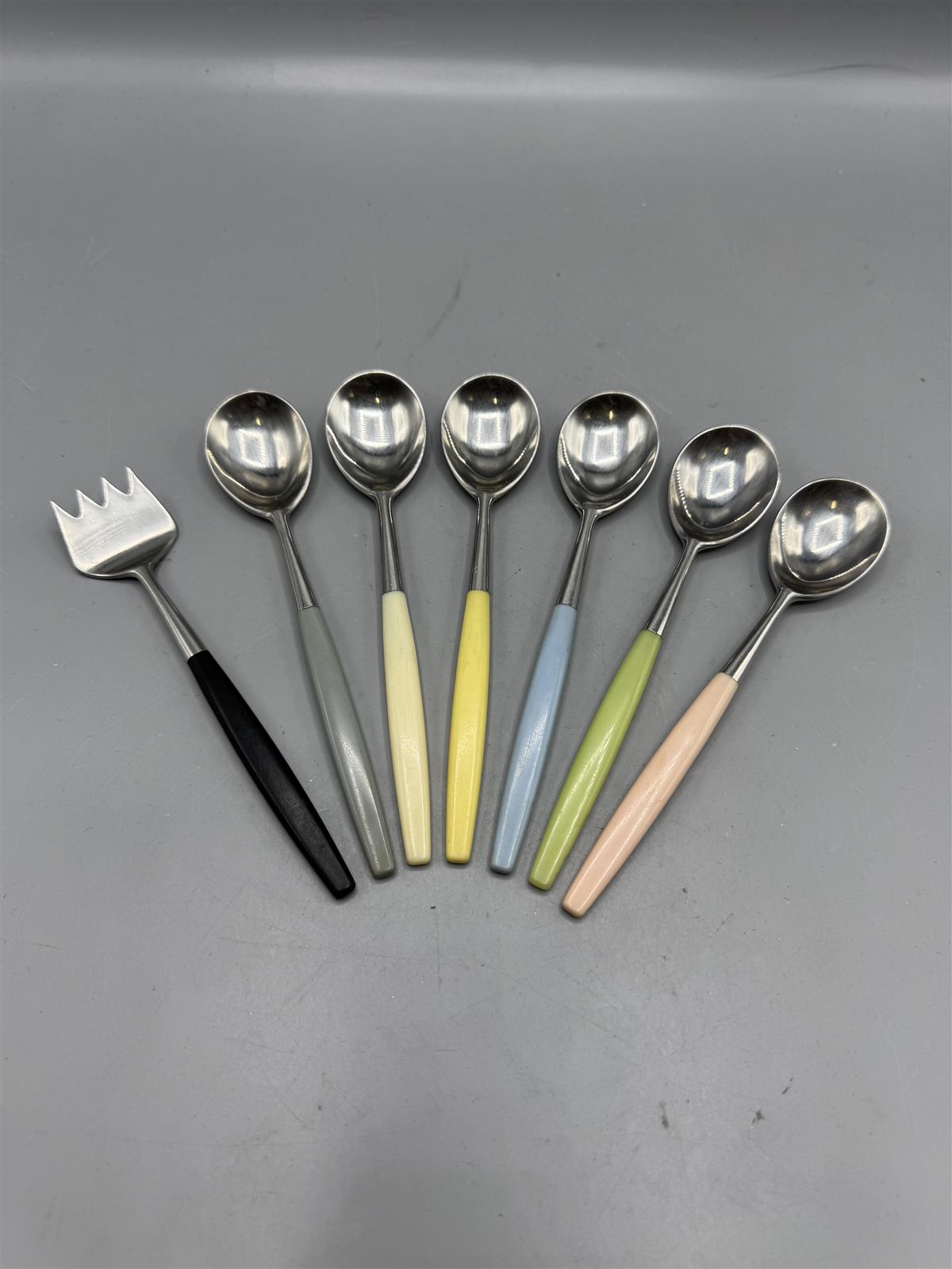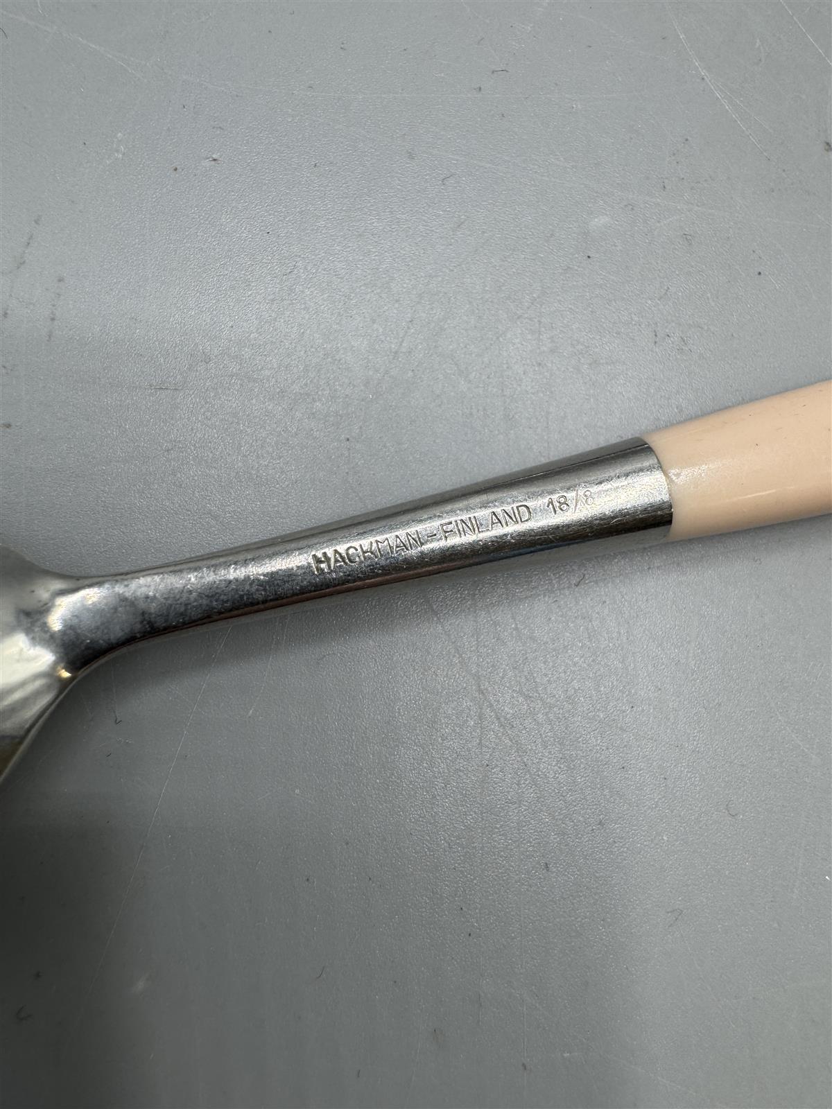 Hackmanin valmistamat Lion malliston aterimet, joissa on seitsemän erilaista osaa. Mukana on kuusi lusikkaa ja yksi erikoinen haarukka, joissa kaikissa on värikkäät kahvat. Kahvojen värit vaihtelevat mustasta pastelliväreihin, kuten harmaa, keltainen, sininen, vihreä ja vaaleanpunainen. Design Bertel Gardberg.