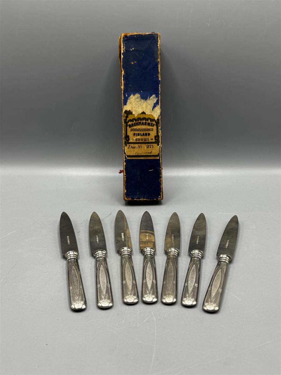Hackman & Co Sorsakoski vintage hedelmäveitset malli 271, alkuperäislaatikon kera. Veitsissä on kaiverrettu kuviointi ja ne ovat valmistettu Sorsakoskella, Suomessa.
