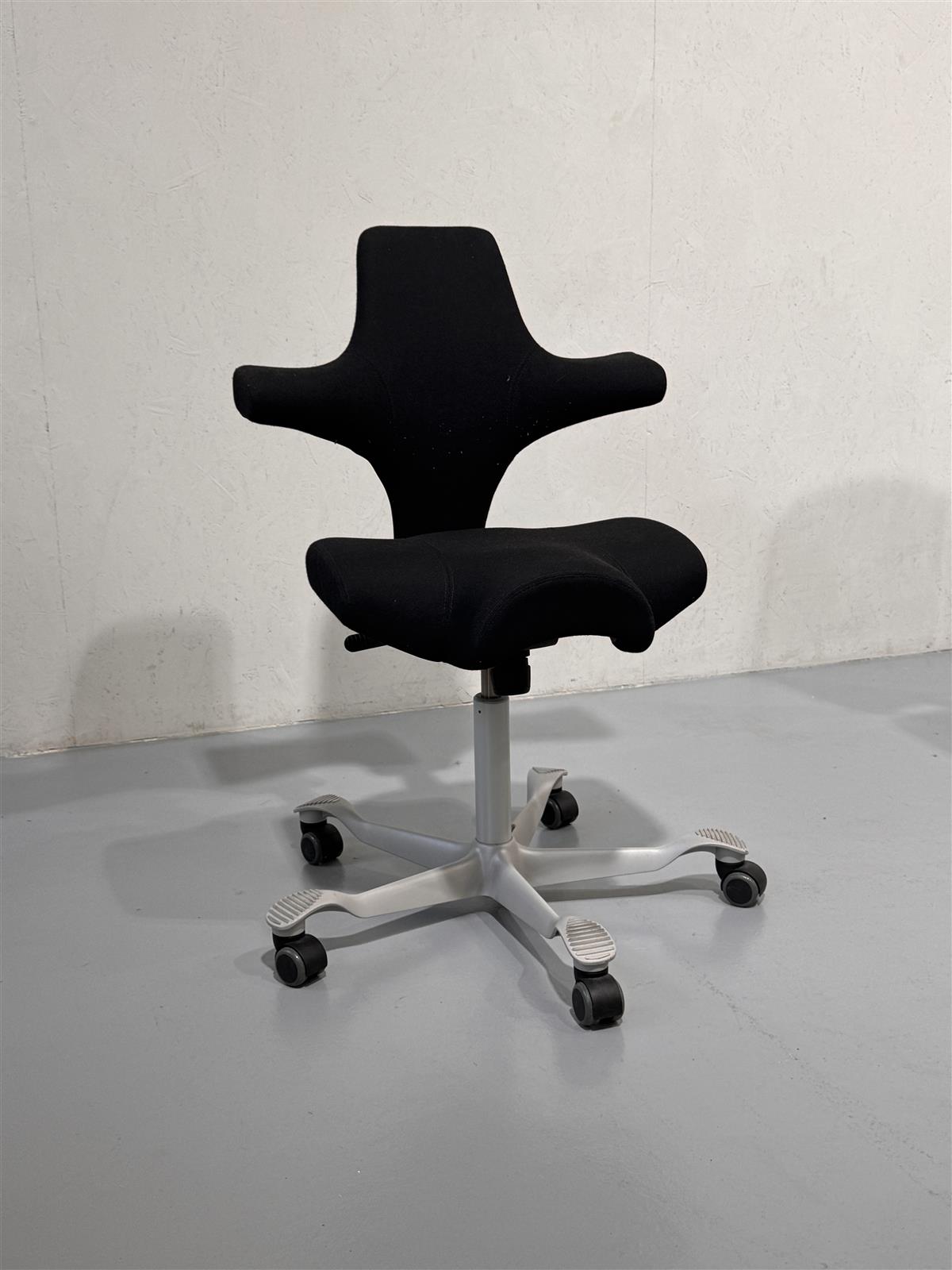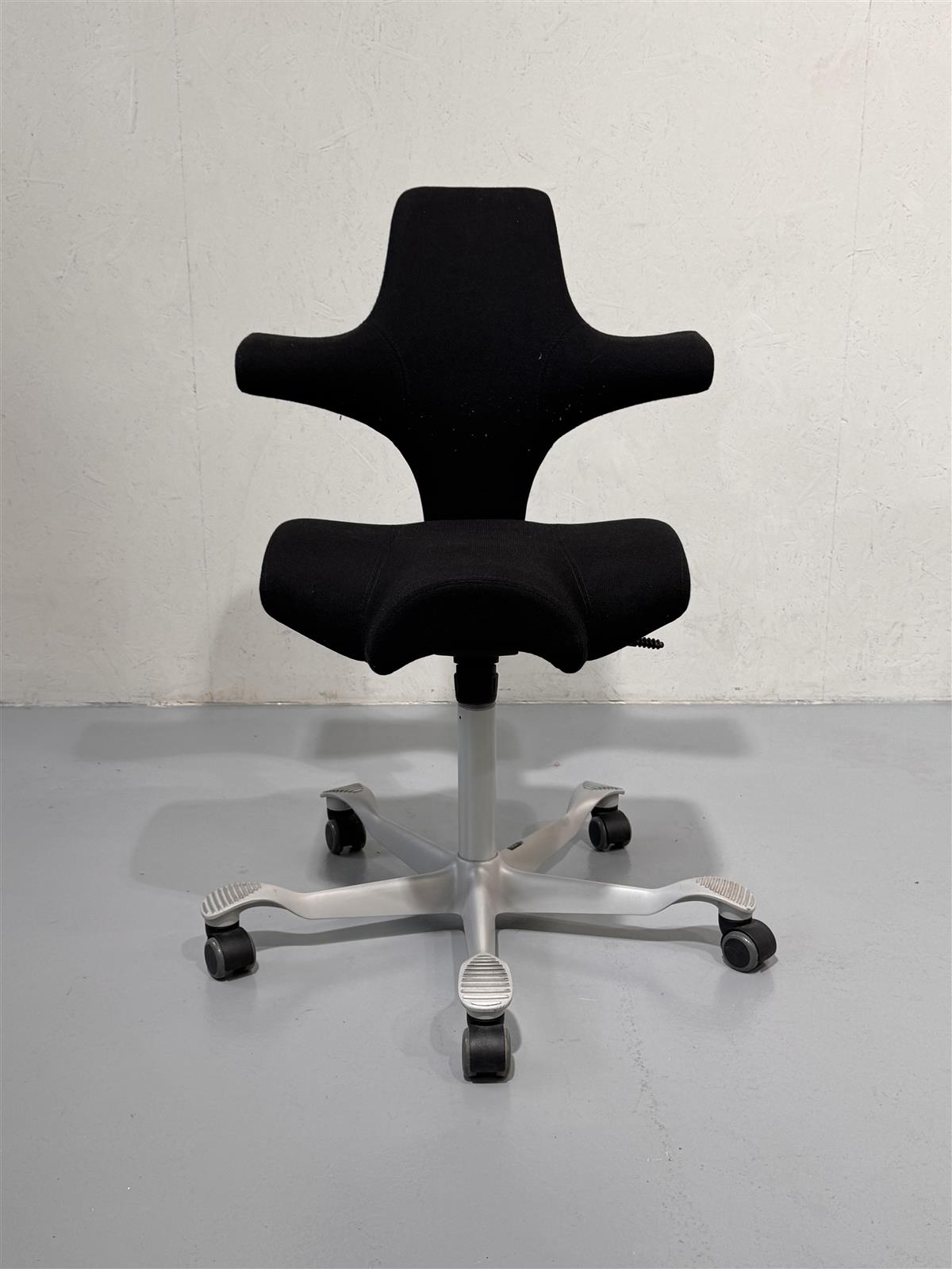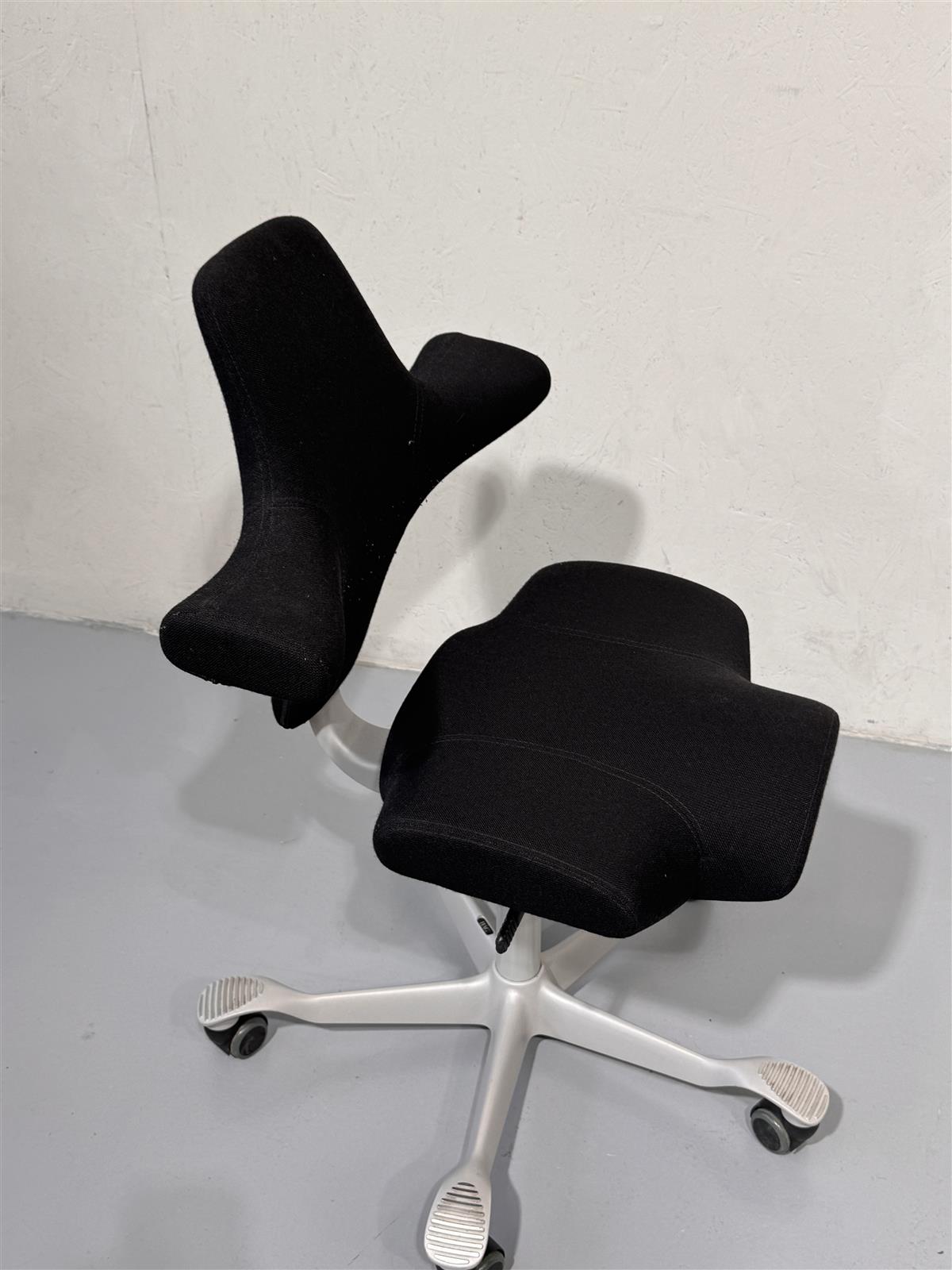 Ergonominen Håg Capisco työtuoli, joka on suunniteltu tarjoamaan optimaalista mukavuutta ja tukea pitkien työpäivien aikana. Musta kangasverhoilu ja hopeanvärinen jalusta luovat modernin ilmeen. Tuolissa on säädettävä istuinkorkeus ja selkänoja, mikä mahdollistaa monipuoliset istuma-asennot. Istuinkorkeus nousee jopa 68cm korkeuteen.
