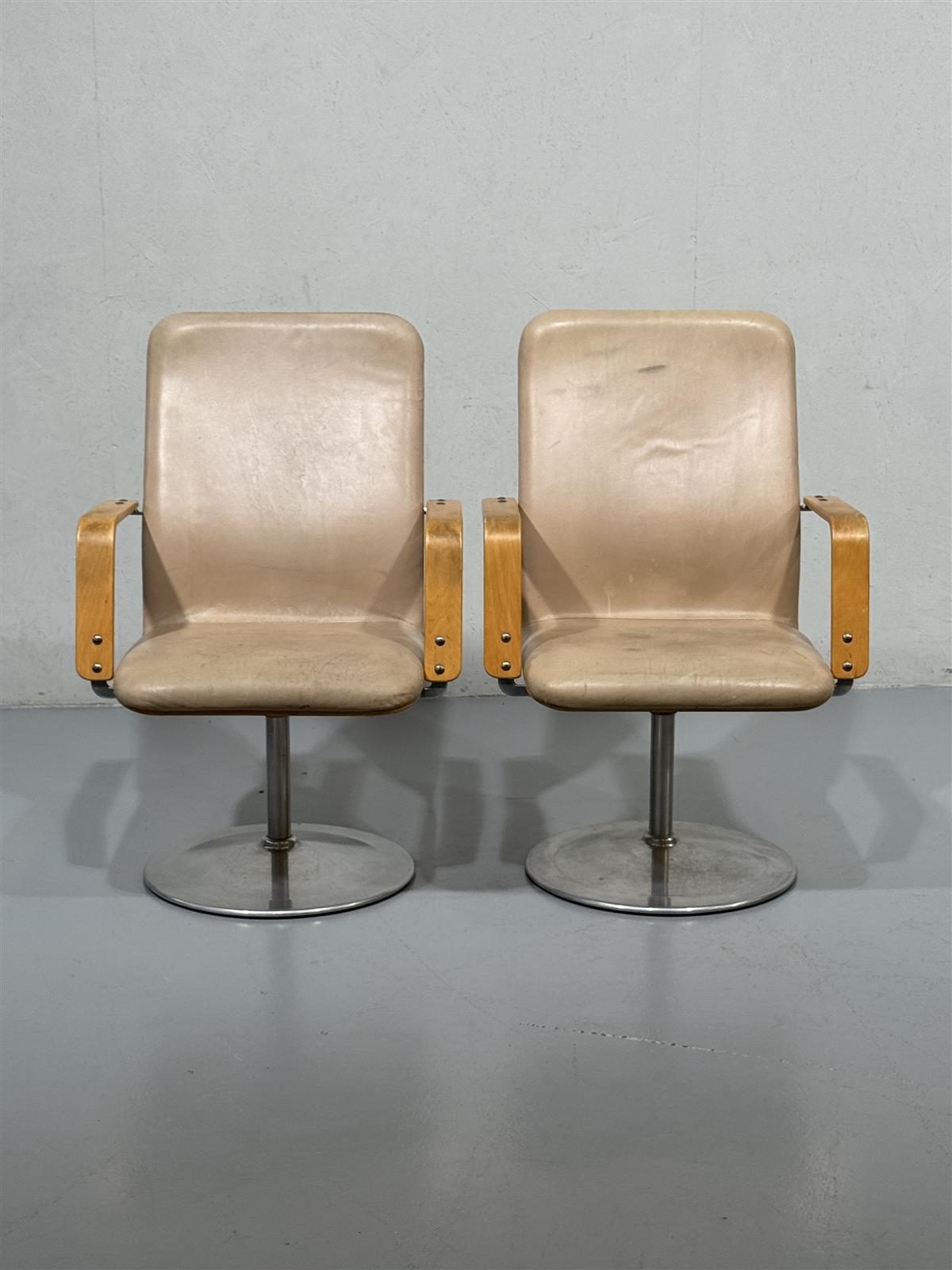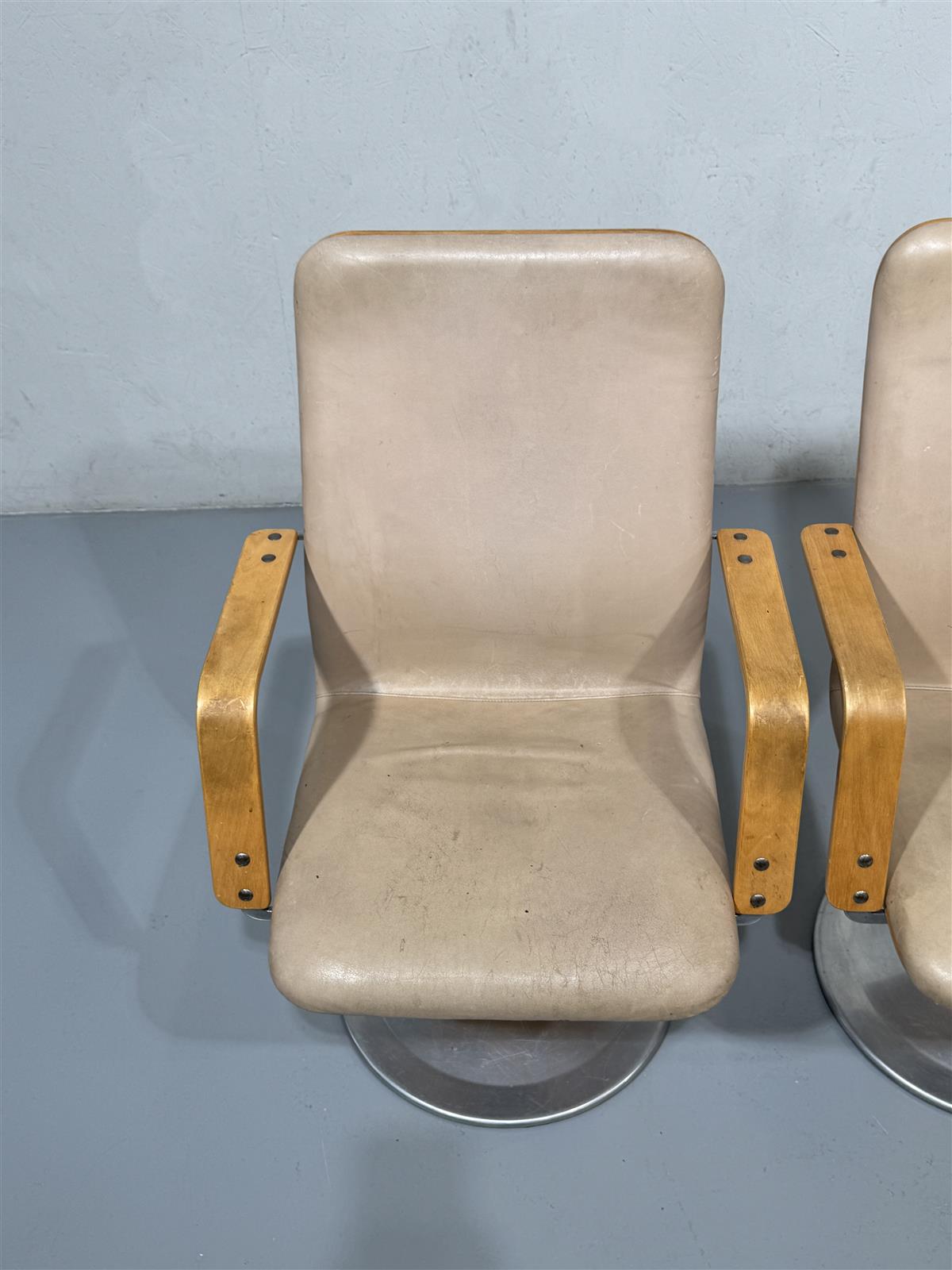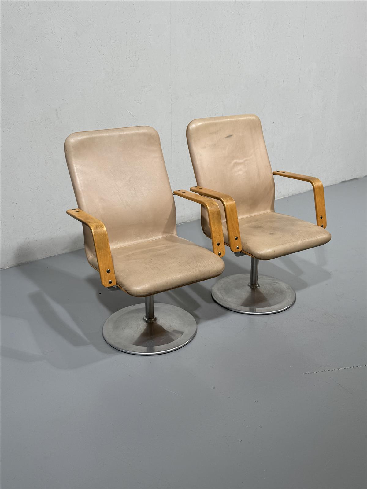 Haimin valmistama Plaano tuoli, suunnittelijana Yrjö Kukkapuro. Tuolissa on vaalea, beigemäinen nahkaverhoilu ja puukäsinojat, jotka yhdistyvät metalliseen jalustaan, jossa istuinosa pyörii. Istuinosa on mukavan pehmeä ja ergonomisesti muotoiltu, mikä tekee siitä miellyttävän istua pidempiäkin aikoja.