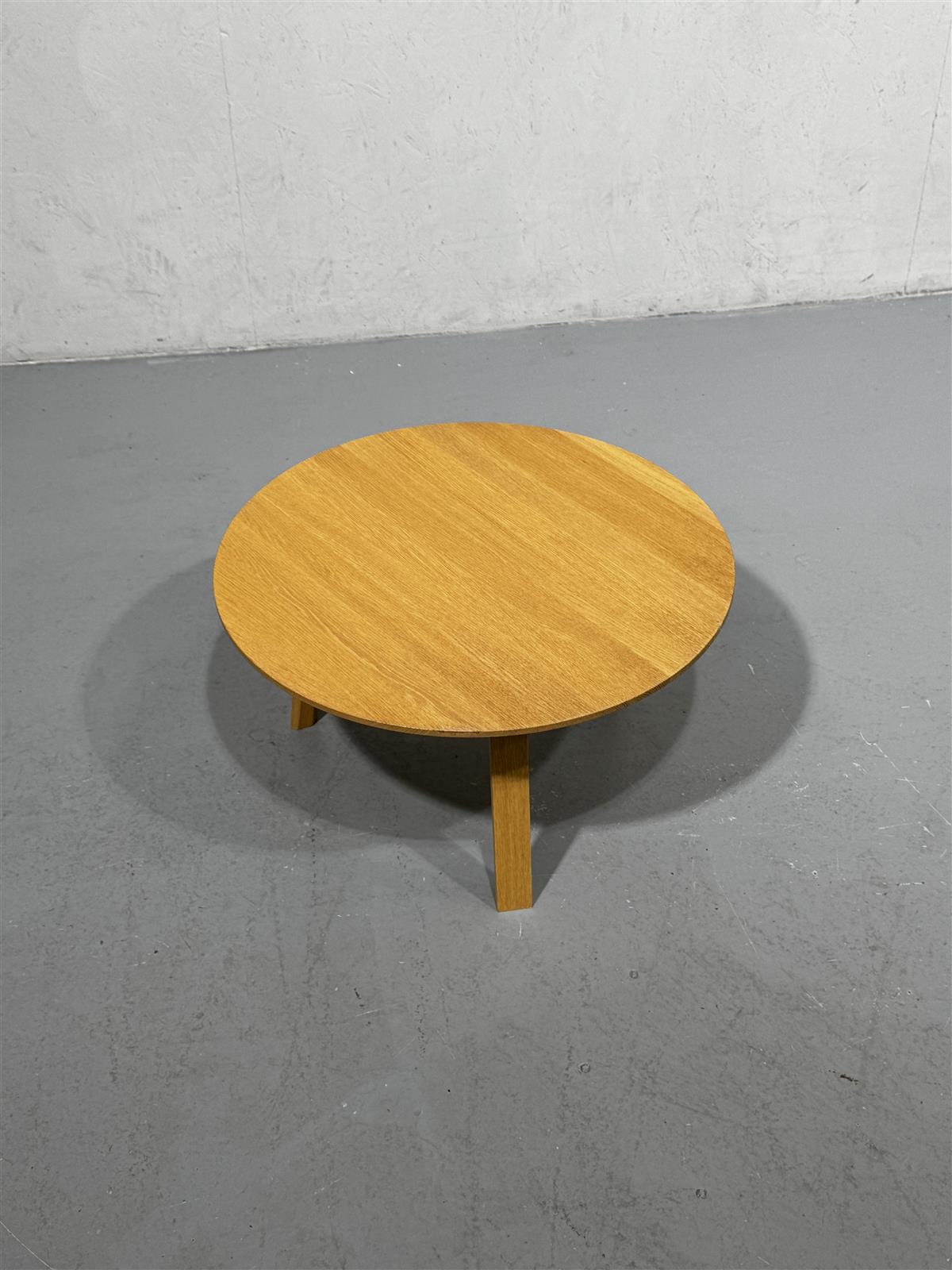 Pyöreä Hay Bella sohvapöytä, jossa on kolme jalkaa. Pöydän pinta on tasainen ja se on suunniteltu matalaksi.