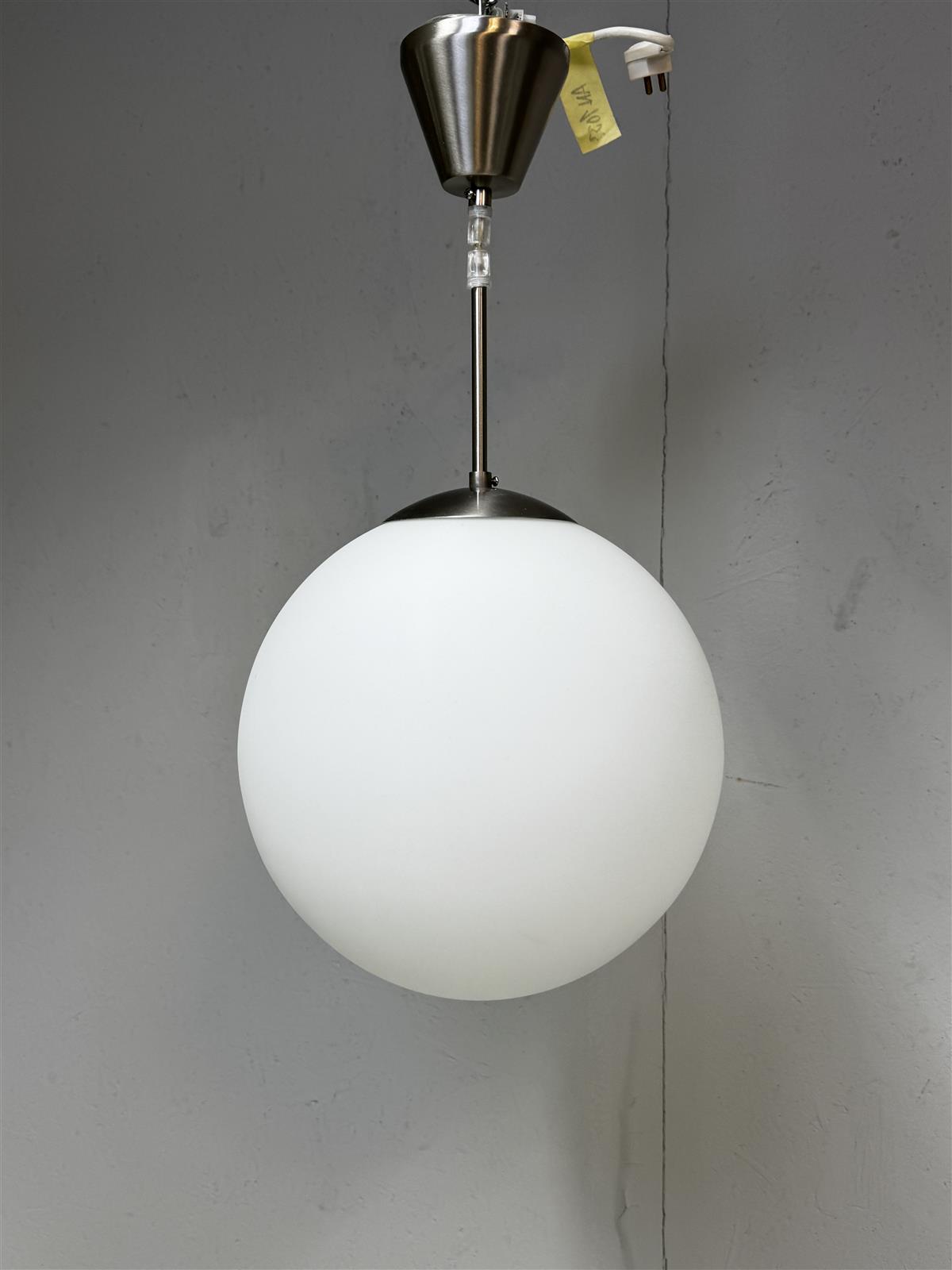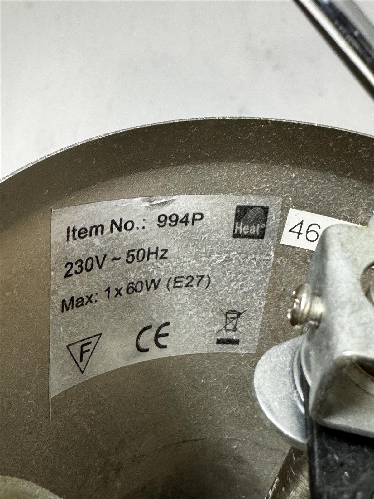 Riippuvalaisin, jossa on valkoinen pyöreä mattalasi varjostin ja metallinen kiinnitysosa. Valaisimessa on merkintä ’Item No.: 994P’ ja se toimii 230V – 50Hz jännitteellä. Maksimiteho on 60W (E27). Valmistaja Heat.  Valaisin edustaa modernia tyyliä, joka sopii monenlaisiin sisustuksiin. Sen yksinkertainen muotoilu tekee siitä ajattoman valinnan.
