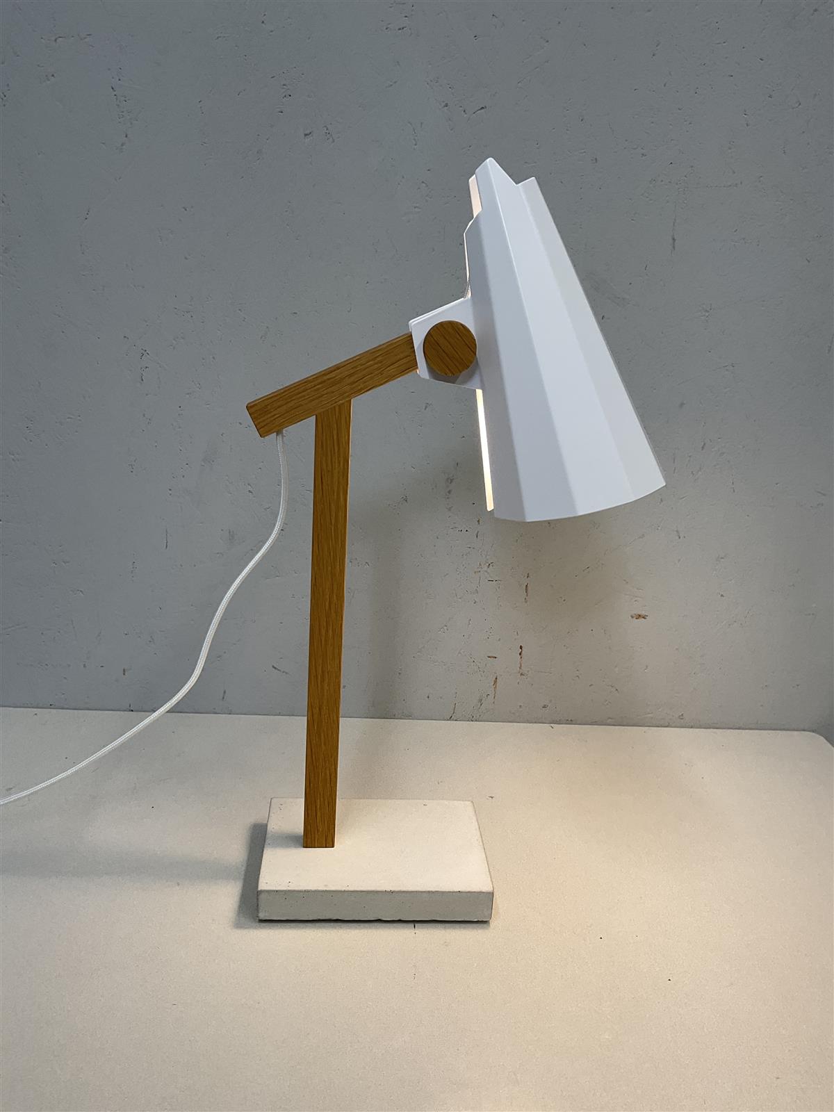 ”Kotimainen Filly pöytävalaisin on erinomainen kaveri työpöydälle. Pienen kokonsa ansiosta se sopii mainiosti myös makuuhuoneen valaisimeksi yöpöydälle tarjoten miellyttävän valon häiritsemättä vieressä nukkuvaa. Valaisimen katkaisin on tekstiilipäällysteisessä virtajohdossa. Suomessa valmistetun Filly-varjostimen mielenkiintoinen, origamimainen muoto syntyy alumiinista taivuttamalla. Kokonaisuuden kruunaa jalkaosa, jossa yhdistyvä lämmin tammi ja kylmä betoni. Valaisimen tyyli on uniikki ja tunnistettava, ja samalla se on erinomaisen käytännöllinen ja erilaisiin valaistustarpeisiin muokkautuva”