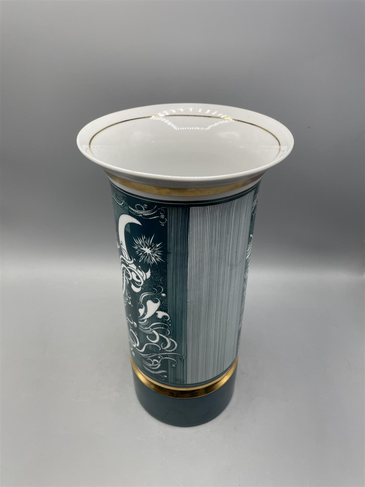 Posliinivaasi, jossa on koristeellinen aurinko- ja kasvokuviointi. Valmistaja Hollohaza, Unkari. Vaasi on koristeltu kultaisilla yksityiskohdilla.