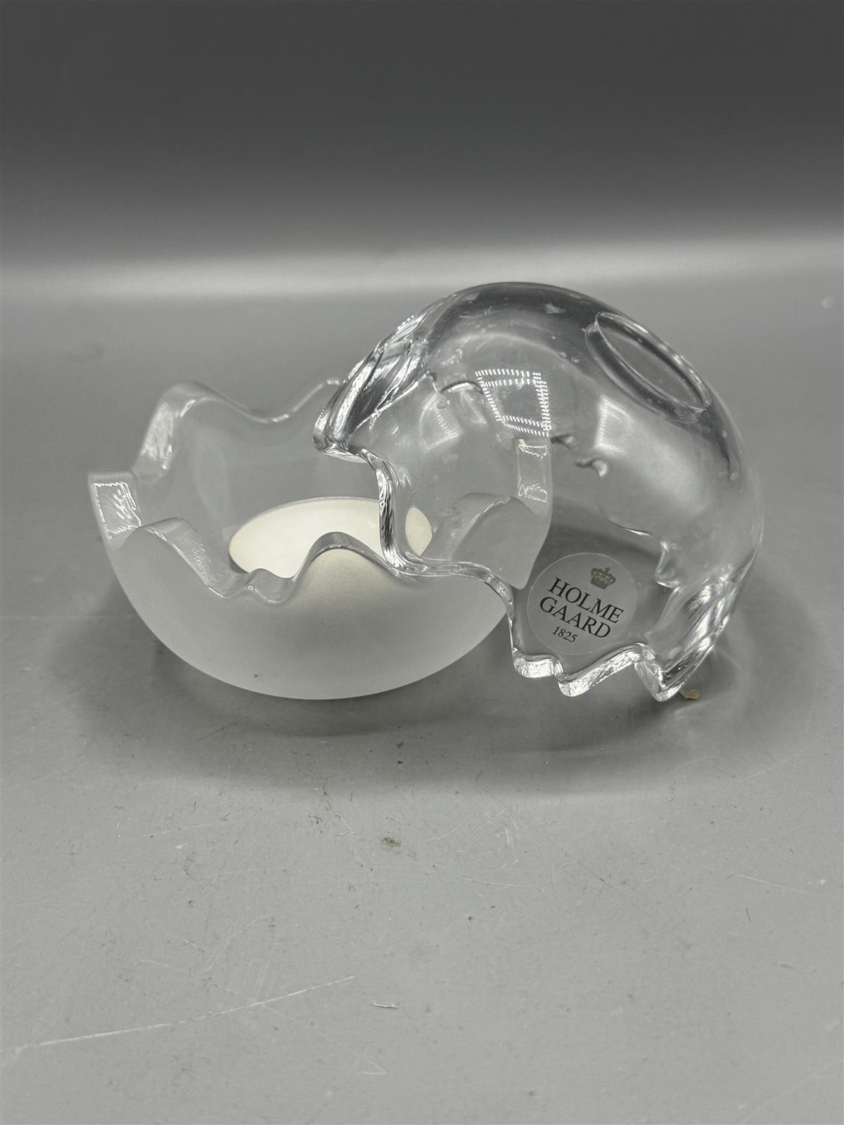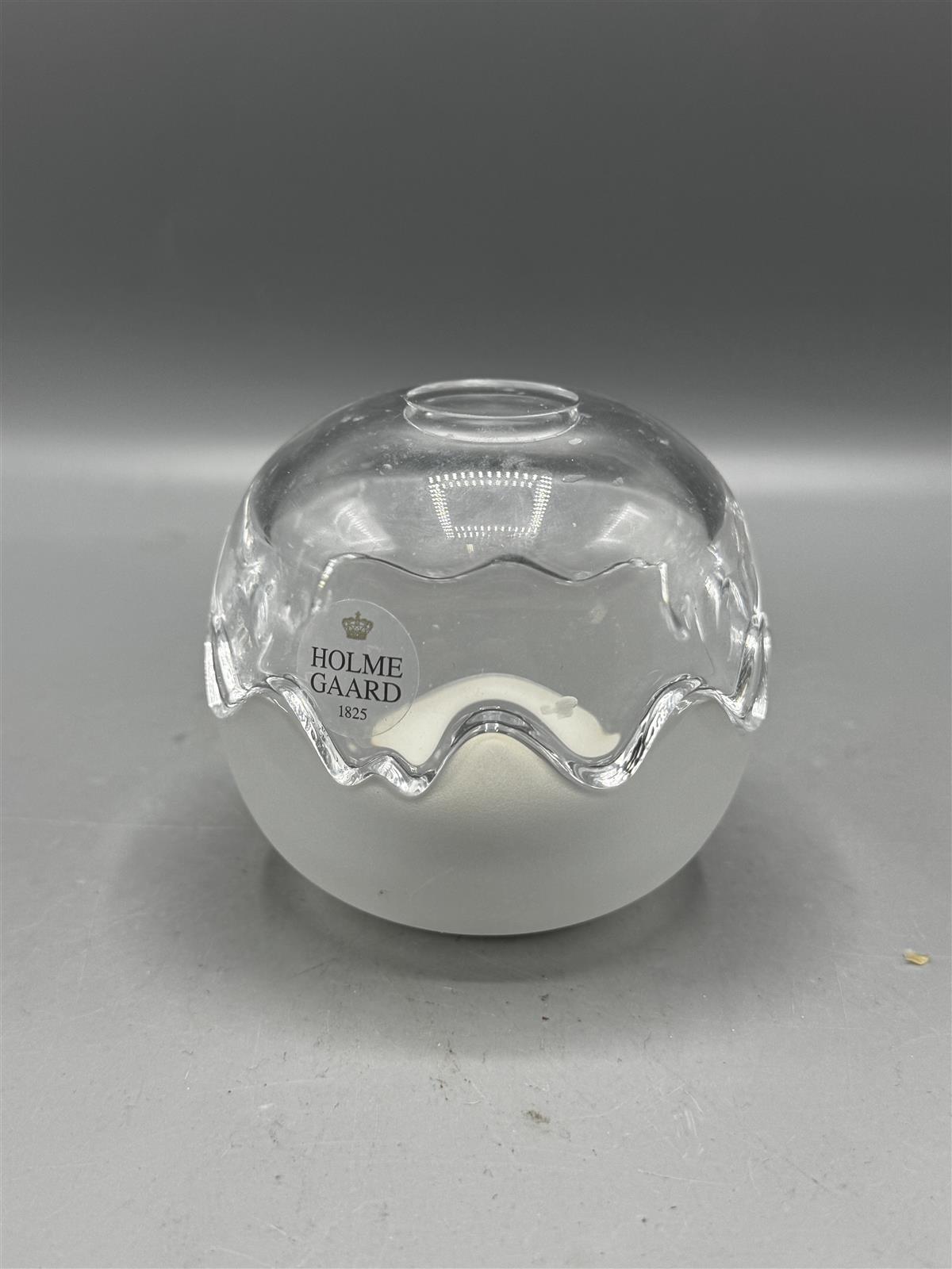 Holmegaard Mixed Double Bonbonniere, suunnittelija Michael Bang (2002). Kirkas ja matta lasi, jossa aaltoileva muotoilu keskellä. Mukana alkuperäinen pakkaus. Sisällä tuikku mutta voi käyttää myös tarjoiluastiana.