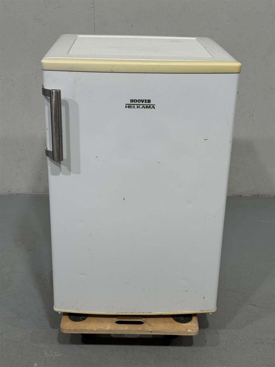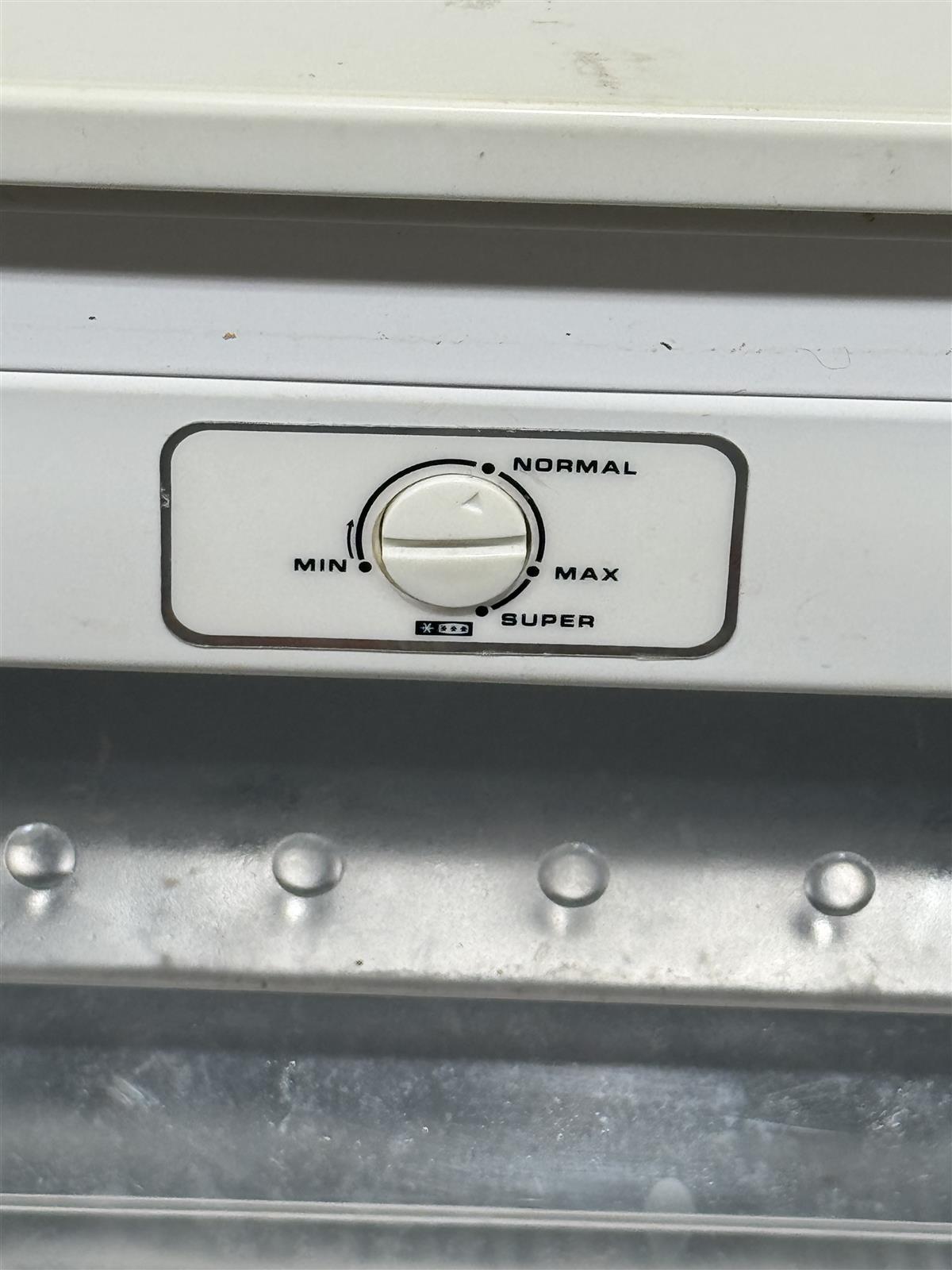Hoover Helkama pakastin, jossa on neljä läpinäkyvää vetolaatikkoa. Pakastimen etuosassa on säätönuppi, jossa on vaihtoehdot minimi, normaali, maksimi ja super. Pakastimen takaosassa on musta jäähdytyselementti ja virtajohto.