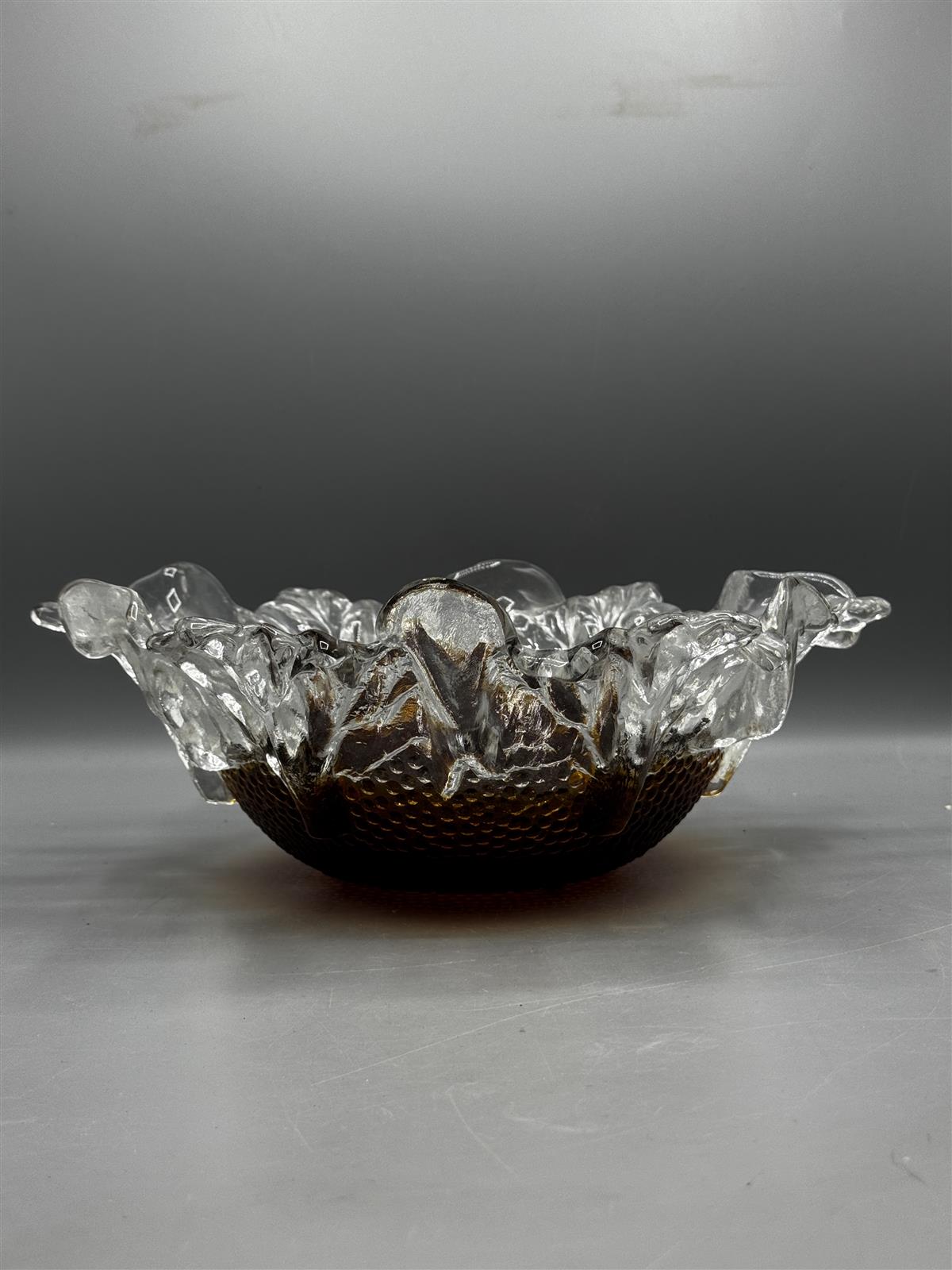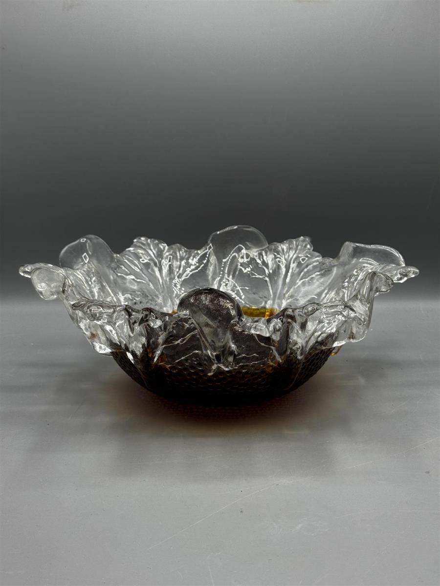 Kirkas Humppila Kasvimaalla tarjoilukulho, design Pertti Santalahti, jossa on aaltoileva reuna ja kohokuvioitu pohja. Kulhon keskiosa on tummanruskea, mikä luo kontrastia kirkkaaseen lasiin.