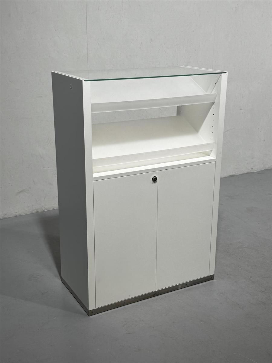 Valkoinen, tukeva hyllykkö – kaappi, jossa on lasinen taso päällä, kaappi alaosassa ja viistottaiset, säädettävät akryylitasot (esimerkiksi esitteitä varten) keskiosassa. Kaappi toimii painonapein, avain puuttuu. Tukeva.