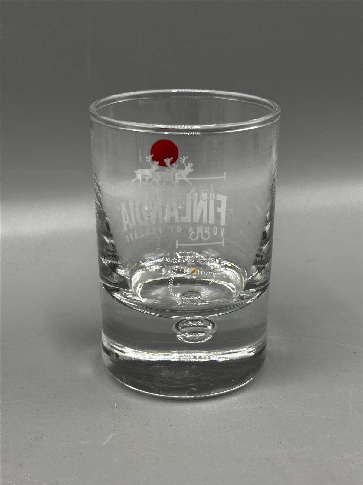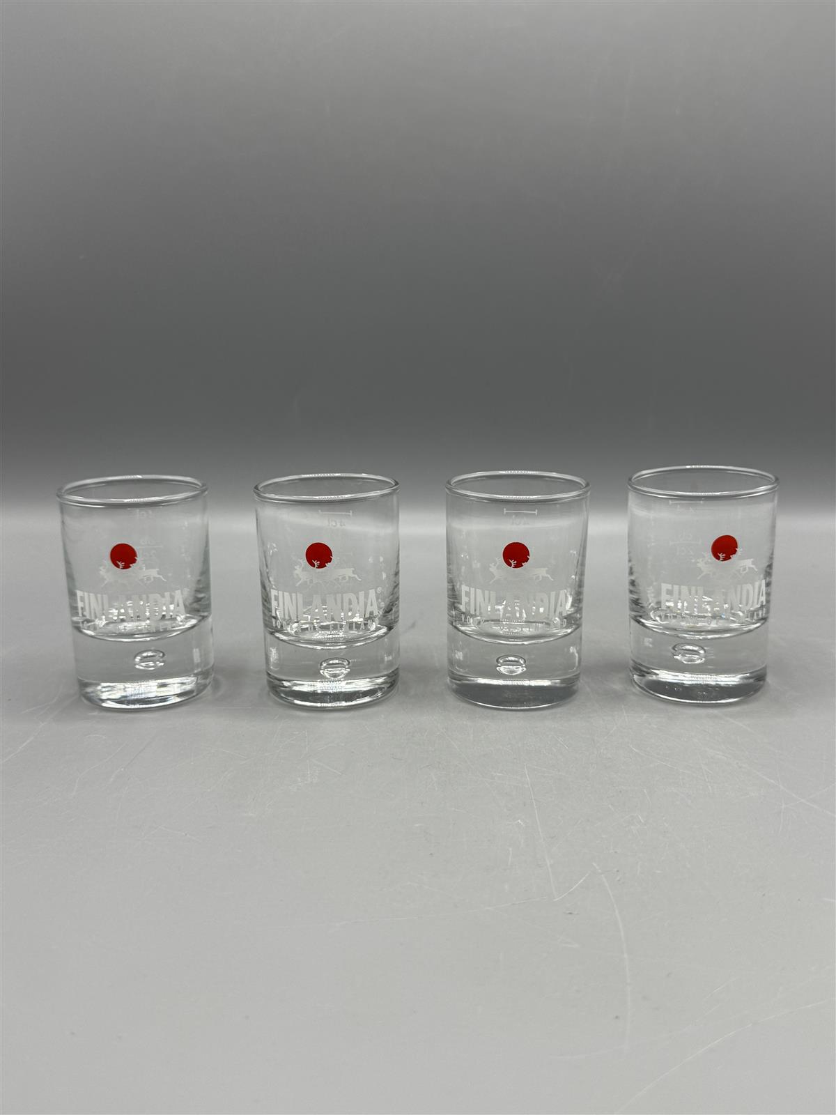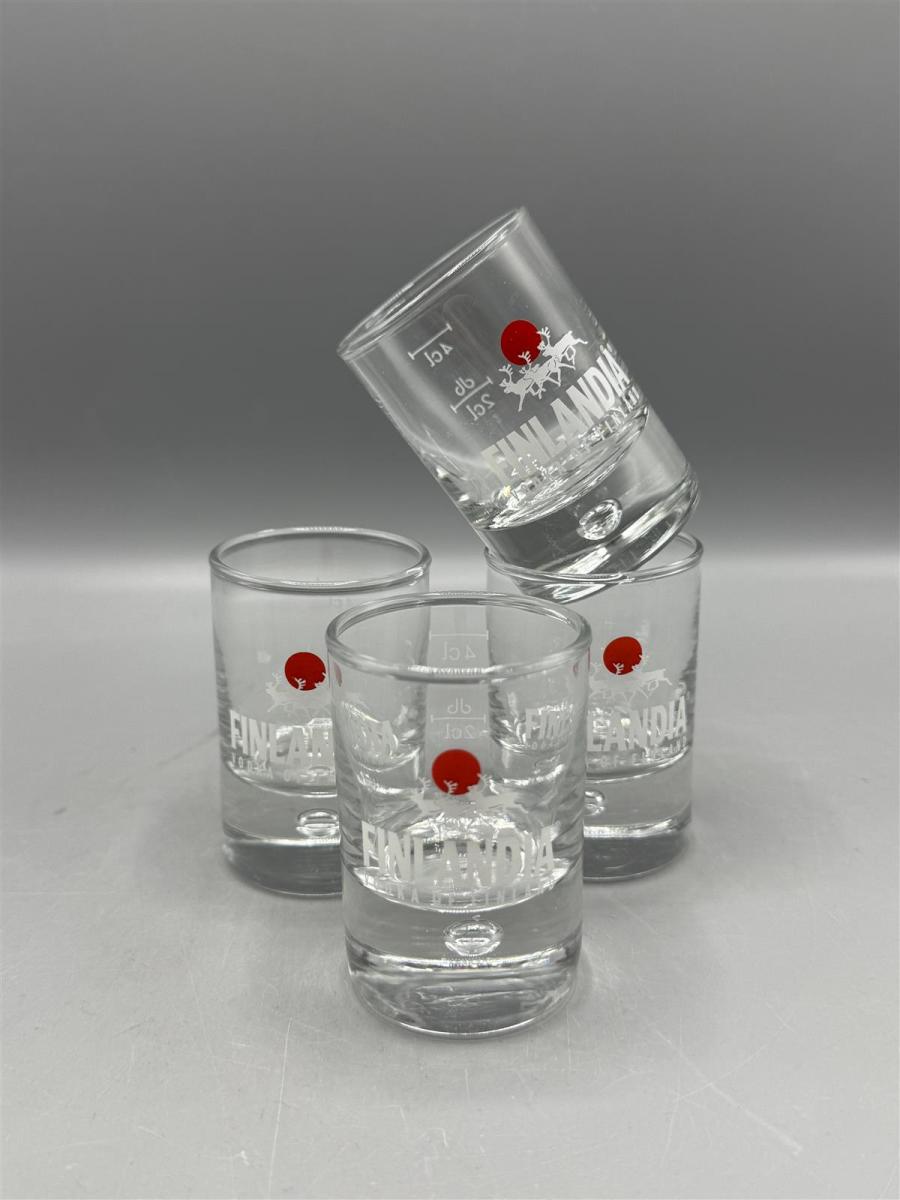 Neljä Iittalan valmistamaa snapsilasia, joissa on Finlandia Vodka -logo ja punainen ympyrä. Lasit ovat kirkasta lasia ja niissä on mitta-asteikko.