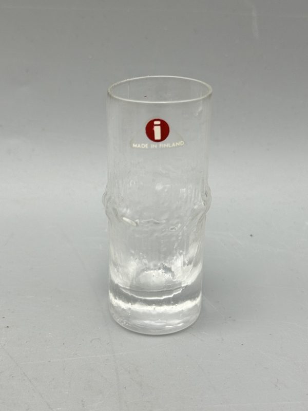Iittala Niva snapsilasit 6 kpl omassa puulaatikossa, kaikissa laseissa tarrat. Puulaatikossa ENSO teksti alareunassa.