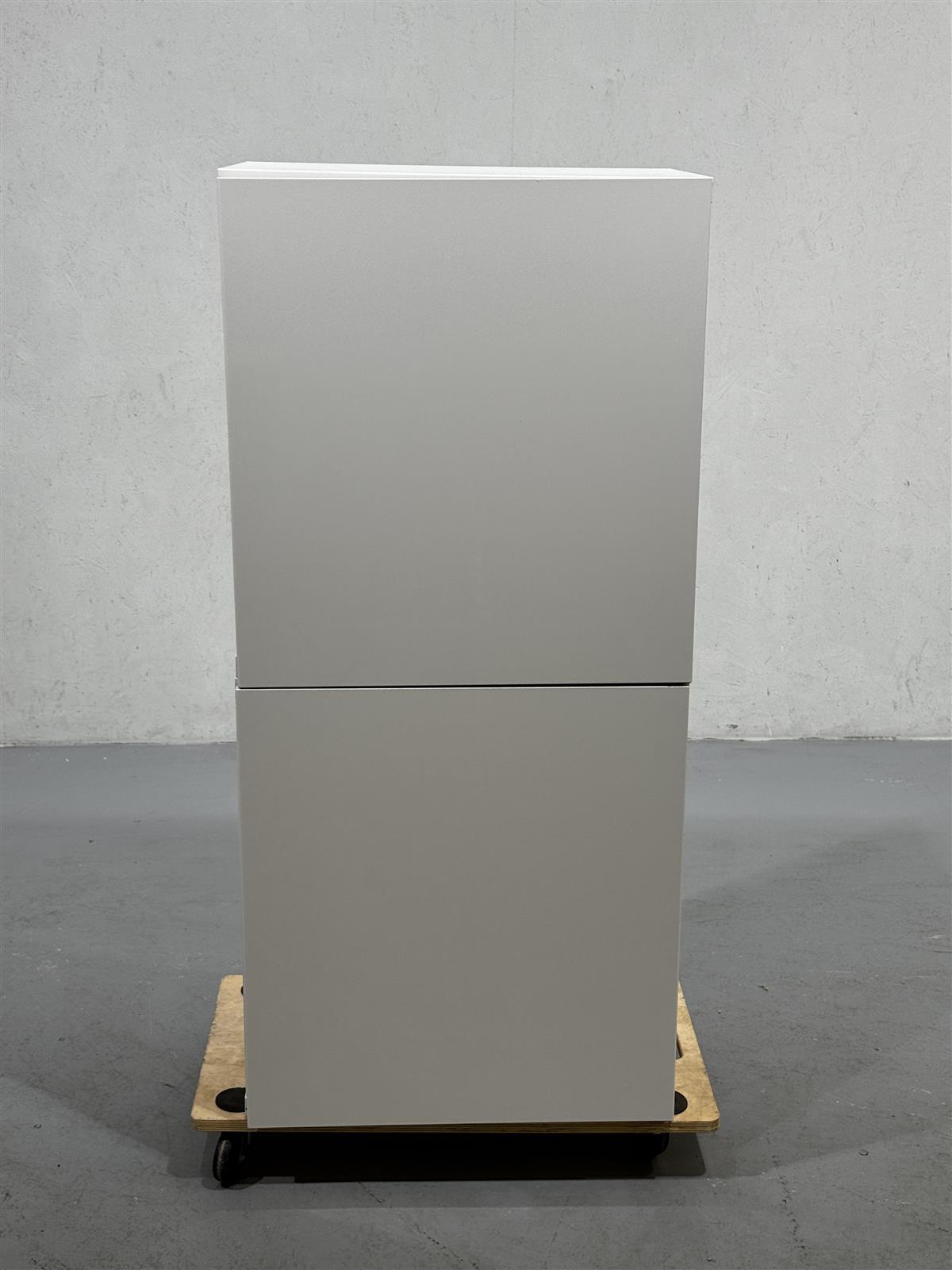 Tyylikäs moderni Ikea Bestå kaappi, jossa on kaksi ovea ja useita hyllyjä. Tämä valkoinen kaappi sopii monenlaiseen sisustukseen ja tarjoaa runsaasti säilytystilaa. Kuvattu rullien päällä, jotka eivät kuulu mukaan.