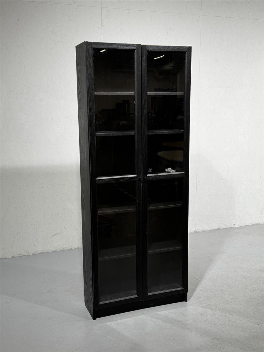 Ikea Billy kirjakaappi, jossa on lasiovet ja useita hyllyjä. Kaappi on musta ja siinä on moderni muotoilu.