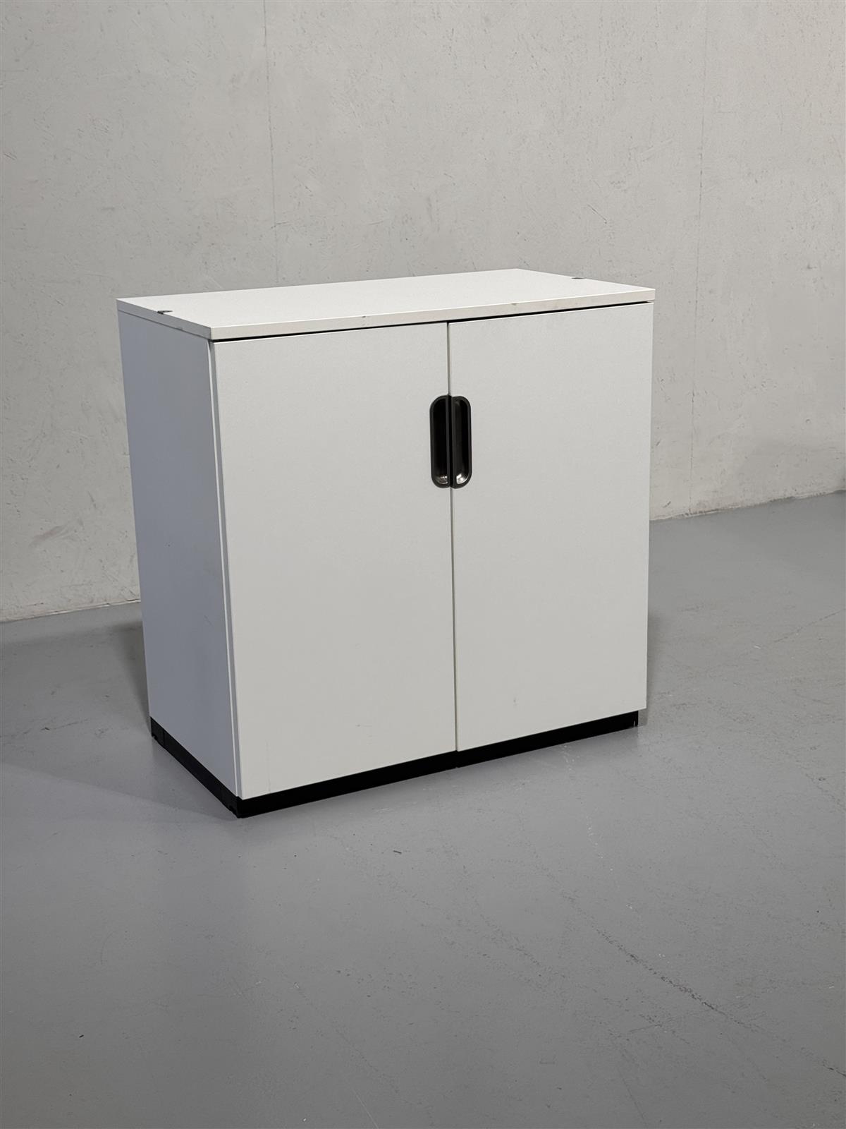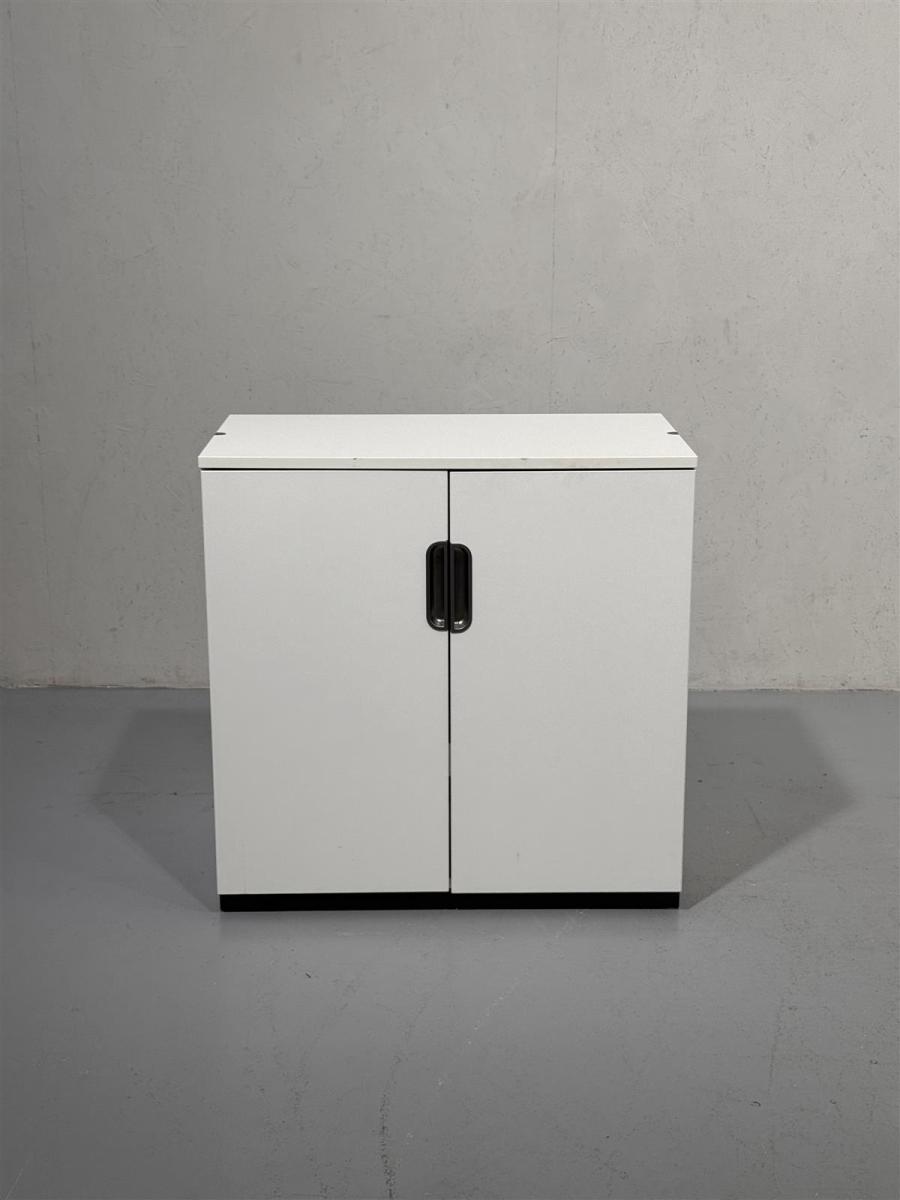Kompakti Ikea Galant kaappi, jossa on kaksi ovea ja tummat kahvat. Sisällä on yksi hylly, joka jakaa tilan kahteen osaan. Kaapin takaseinässä on pyöreä aukko kaapeleille tai ilmanvaihdolle. Valkoinen ulkopinta ja musta sisäosa luovat selkeän kontrastin.