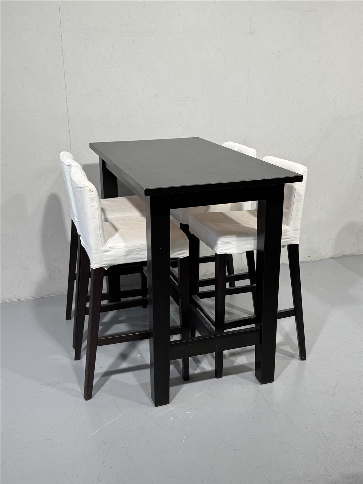 Ikea HENRIKSDAL malliston puinen baaripöytä ja neljä korkeaa tuolia. Pöydän ja tuolien runko on musta, ja tuoleissa on valkoiset, irroitettavat päälliset.