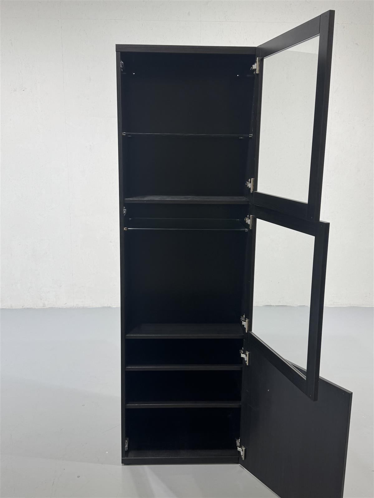 Korkea ja kapea kaappi, jossa on kaksi lasiovea. Musta väri antaa modernin ja tyylikkään ilmeen. Sopii hyvin säilytykseen ja esillepanoon, esimerkiksi olohuoneeseen tai toimistoon. Valmistaja on Ikea.