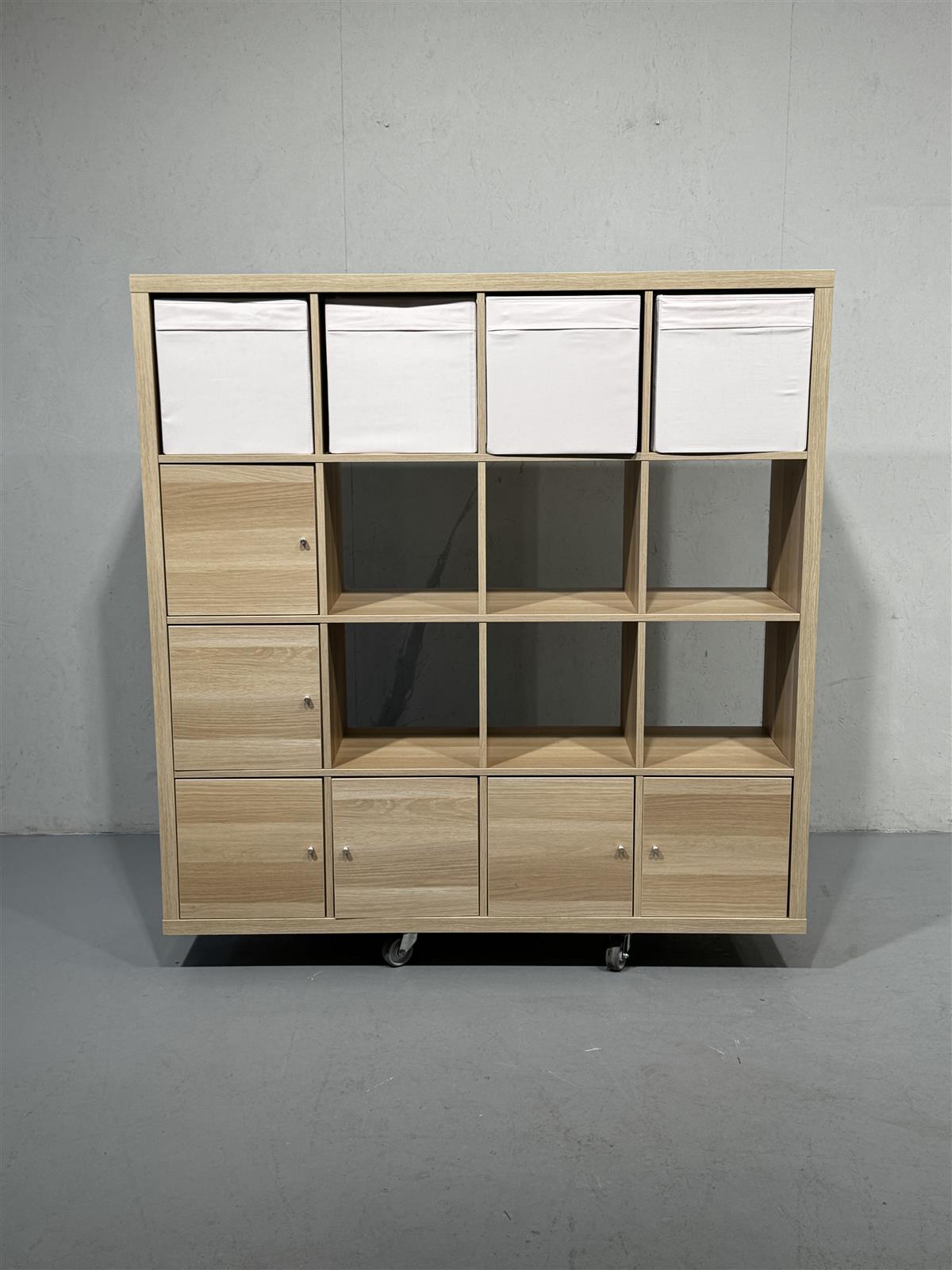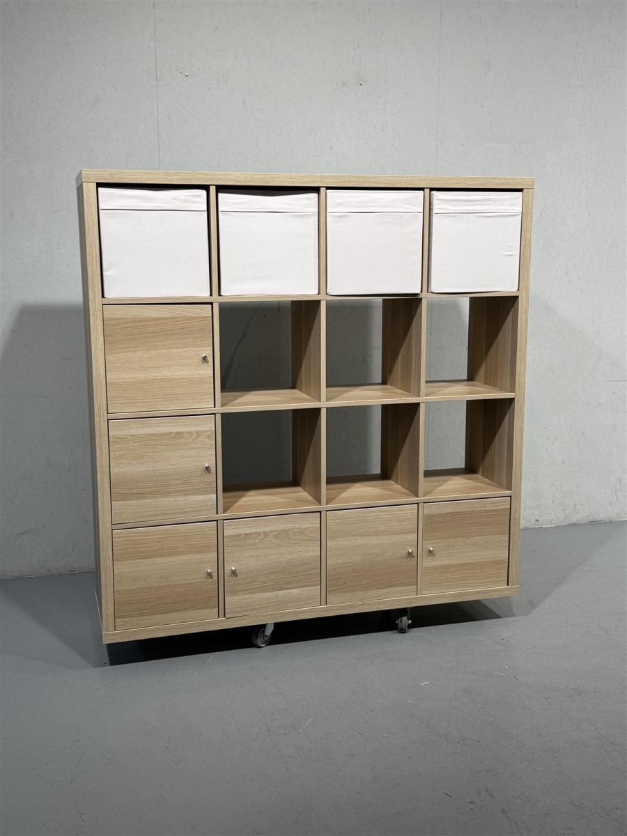 Ikea Kallax malliston puun värinen 4 x 4 hyllykkö, jossa on useita lokeroita, kaappeja sekä koreja. Yläosassa on valkoiset kangaslaatikot. Kuvattu rullien päällä, jotka eivät mukana kaapissa.