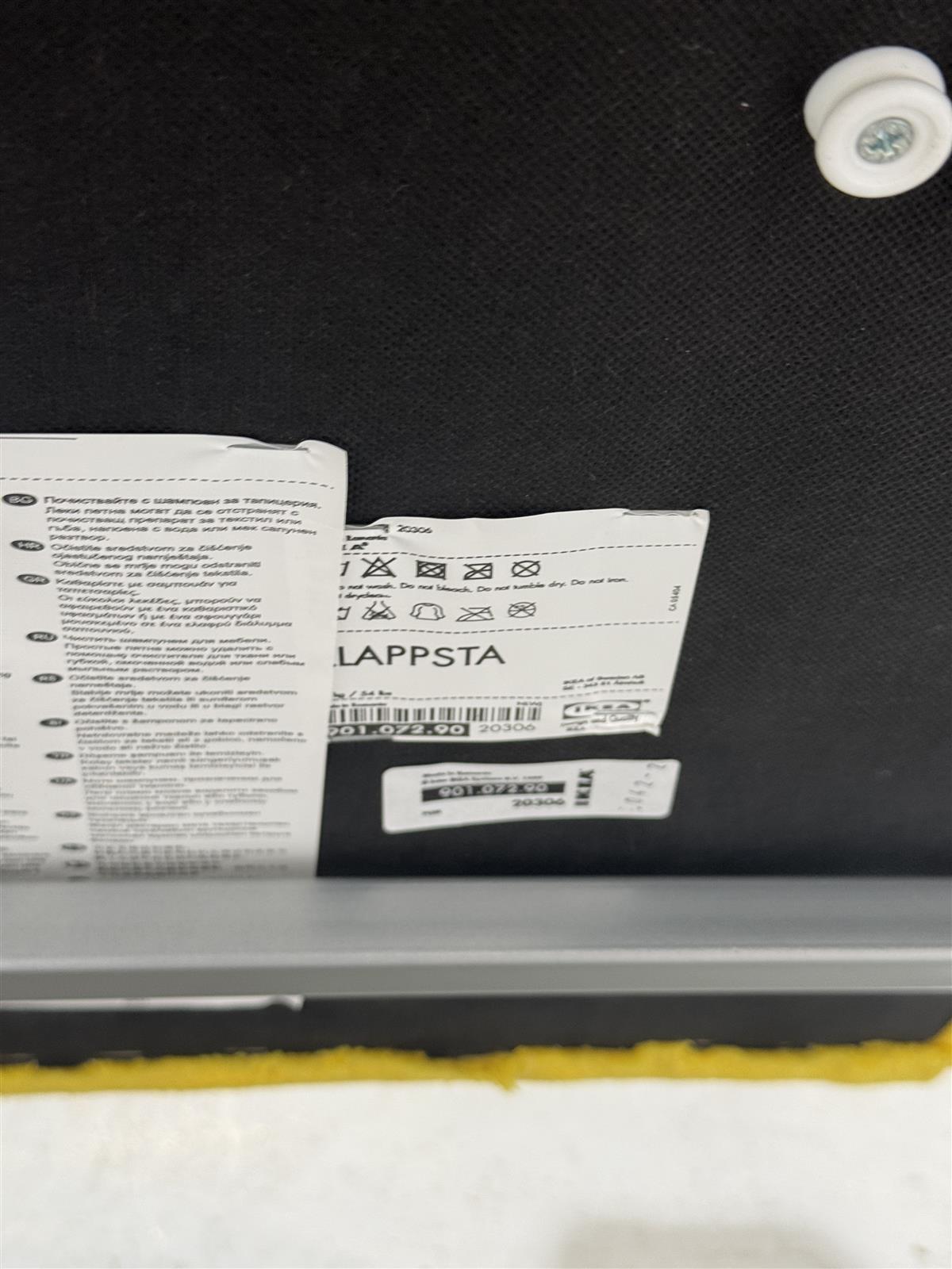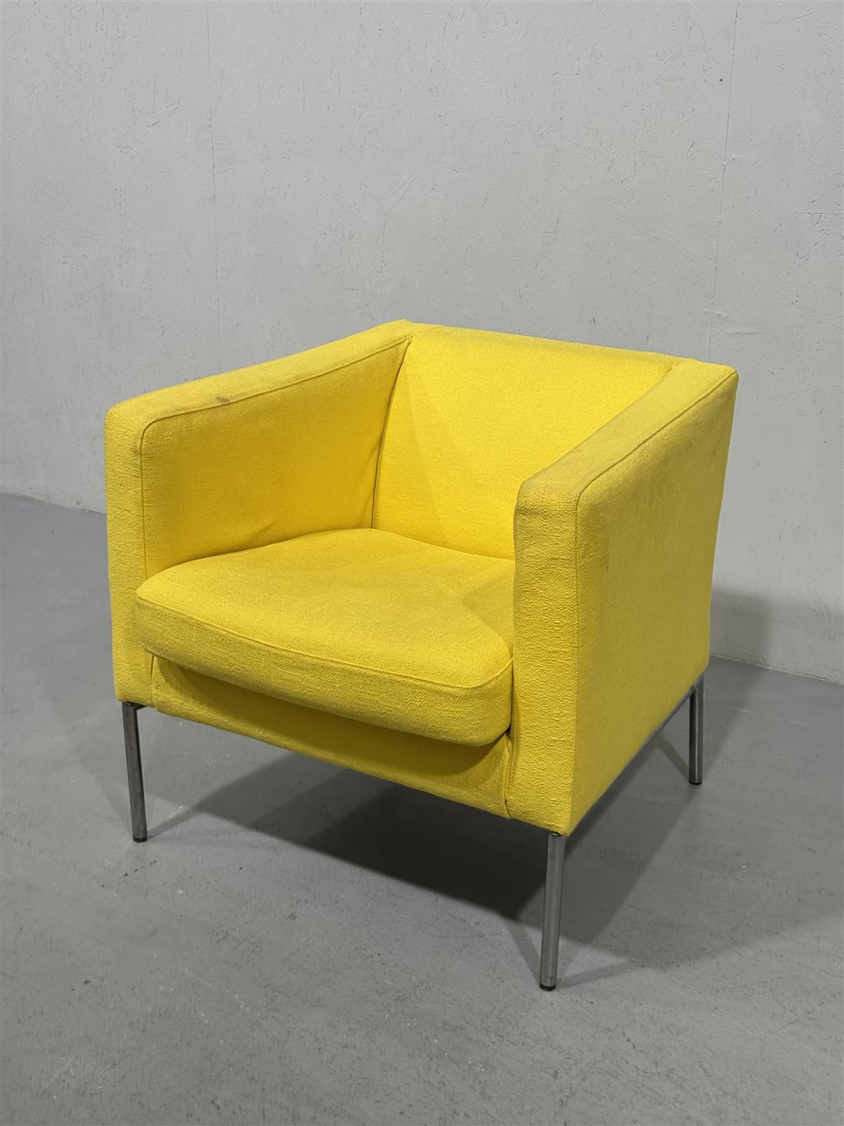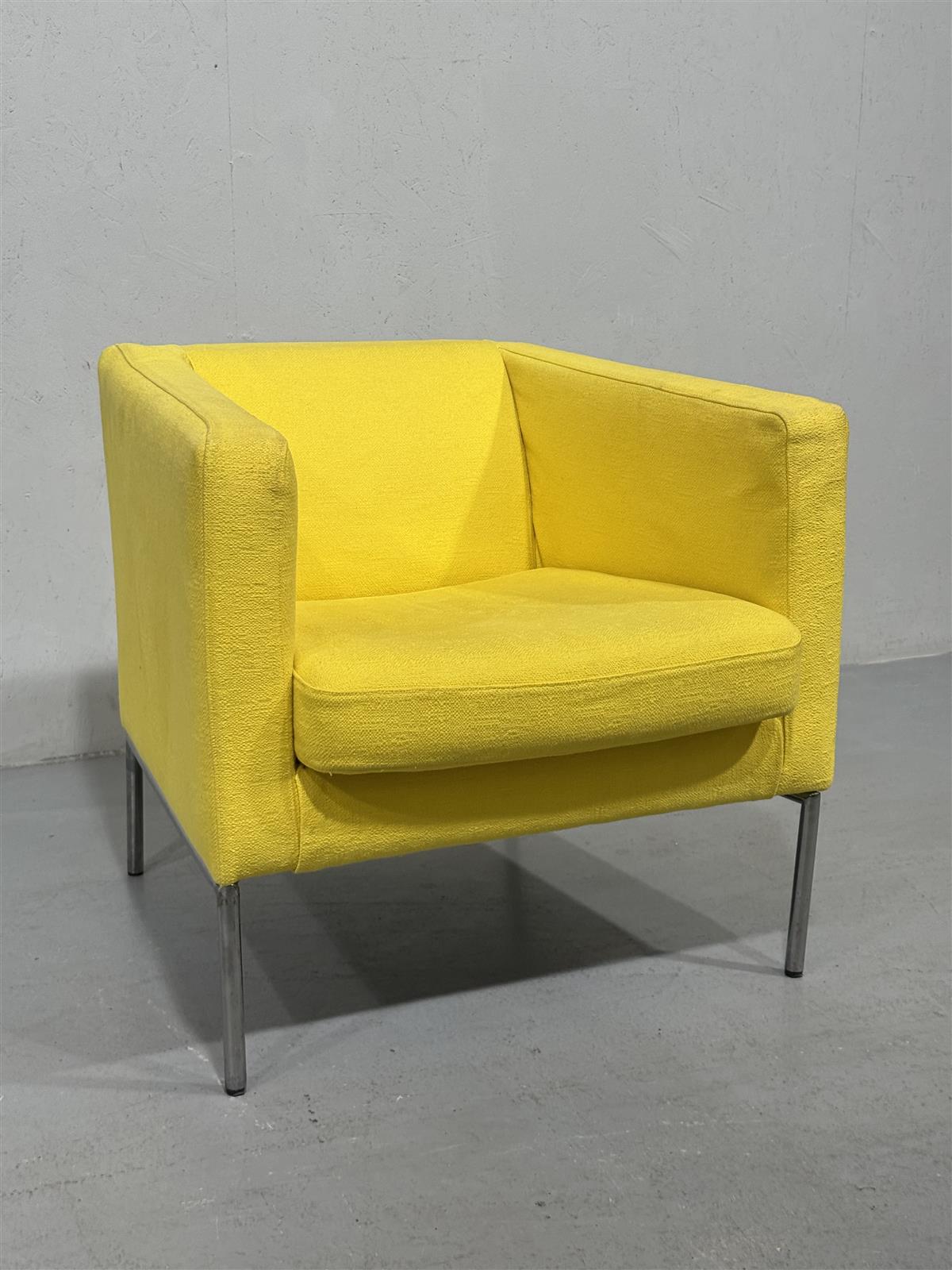 Kirkkaan keltainen Ikea Klappsta nojatuoli, jossa on metallijalat. Kompakti ja moderni muotoilu sopii monenlaisiin sisustuksiin. Valmistaja on Ikea, joka tunnetaan edullisista ja käytännöllisistä huonekaluistaan.