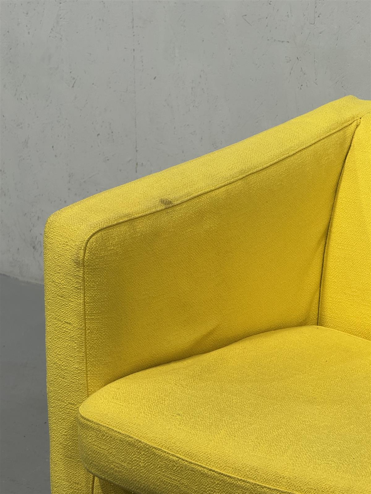 Tuolissa on havaittavissa pientä kulumaa ja likaa erityisesti käsinojissa, mutta yleisilme on siisti. Kangas on säilynyt hyvin, ja metallijalat ovat tukevat.