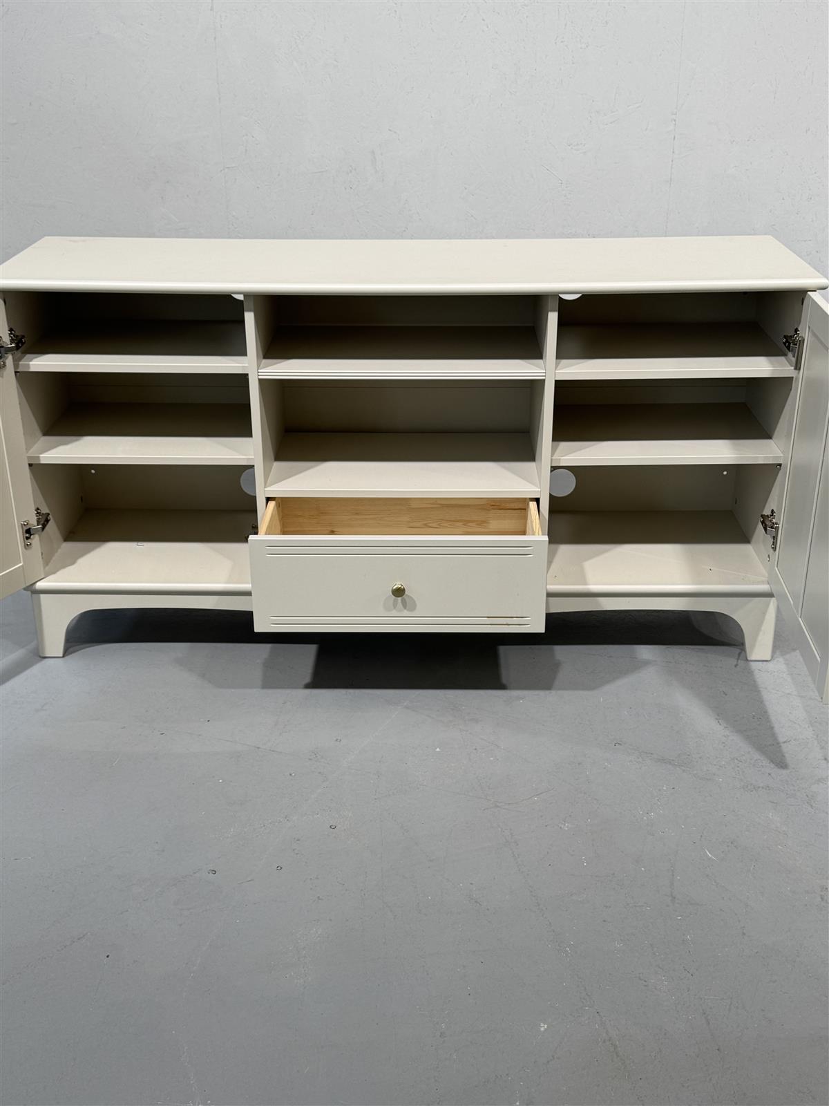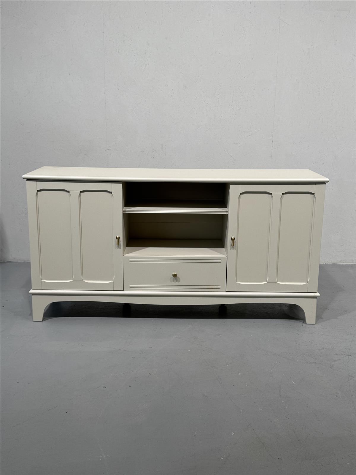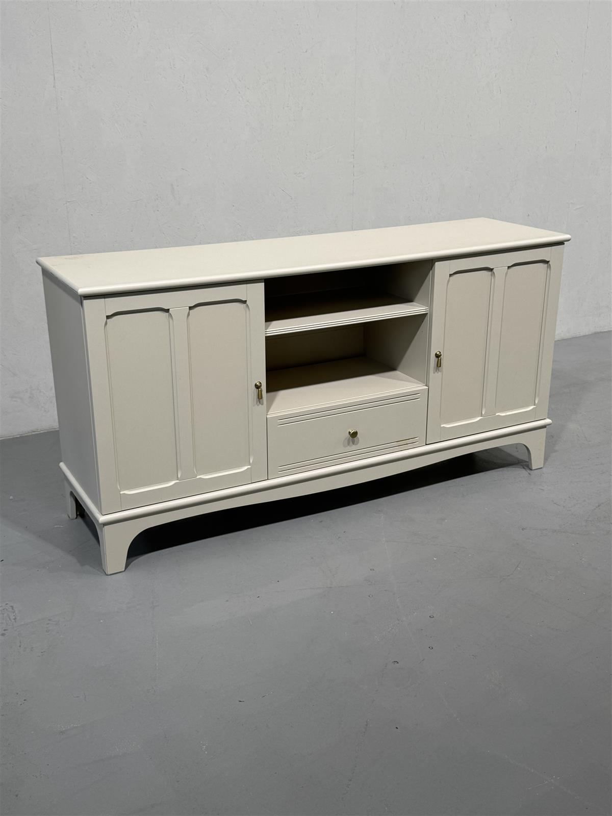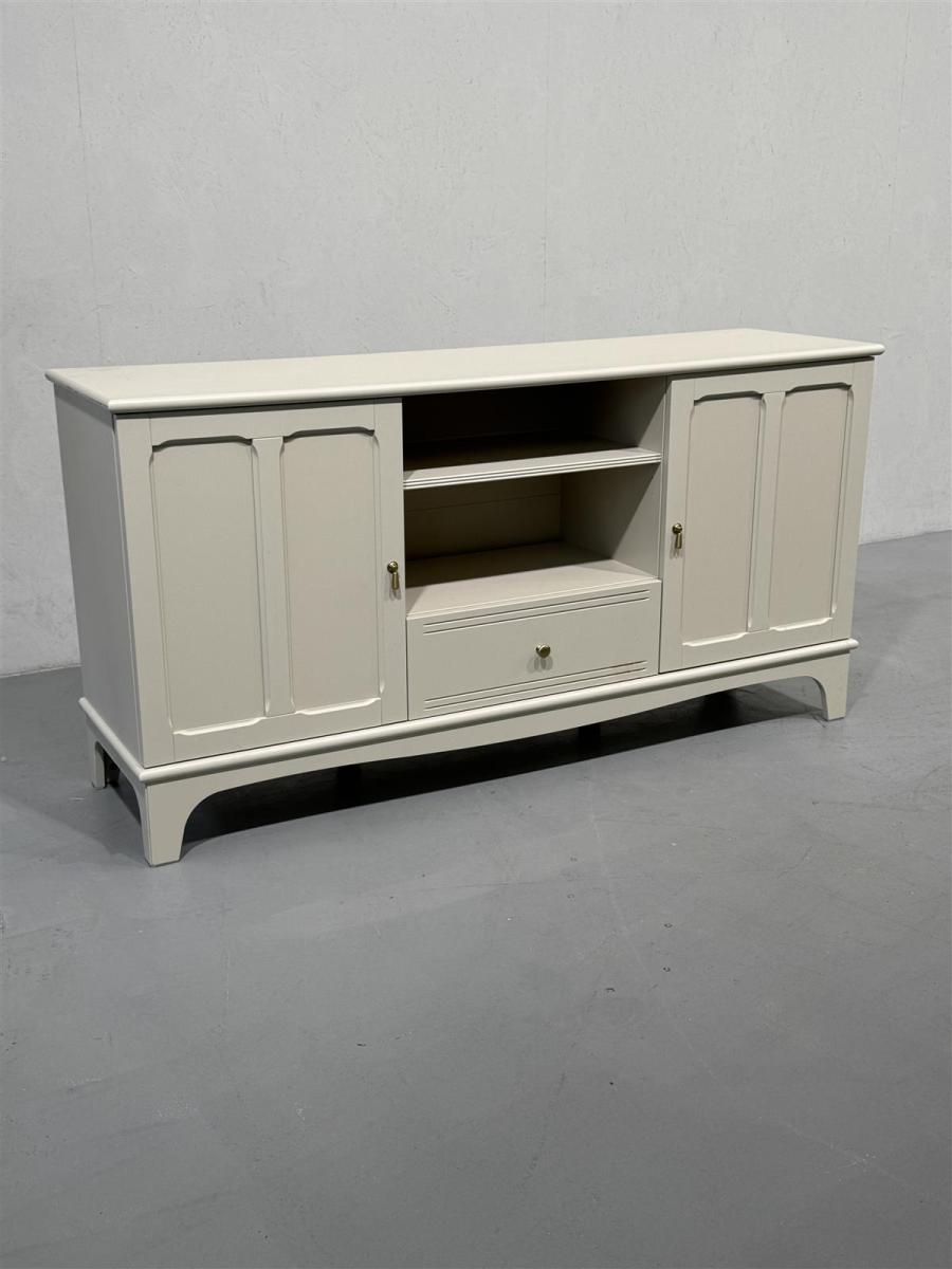 Tyylikäs Ikea Lommarp senkki, jossa on kaksi kaappia ja keskellä avohyllyt sekä laatikko. Väri on vaalea ja muotoilu yksinkertainen mutta toimiva, sopien monenlaiseen sisustukseen.