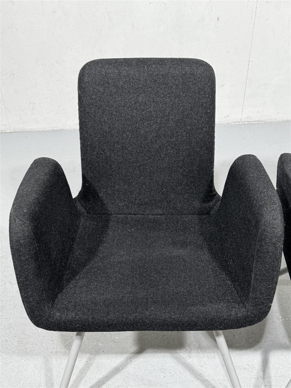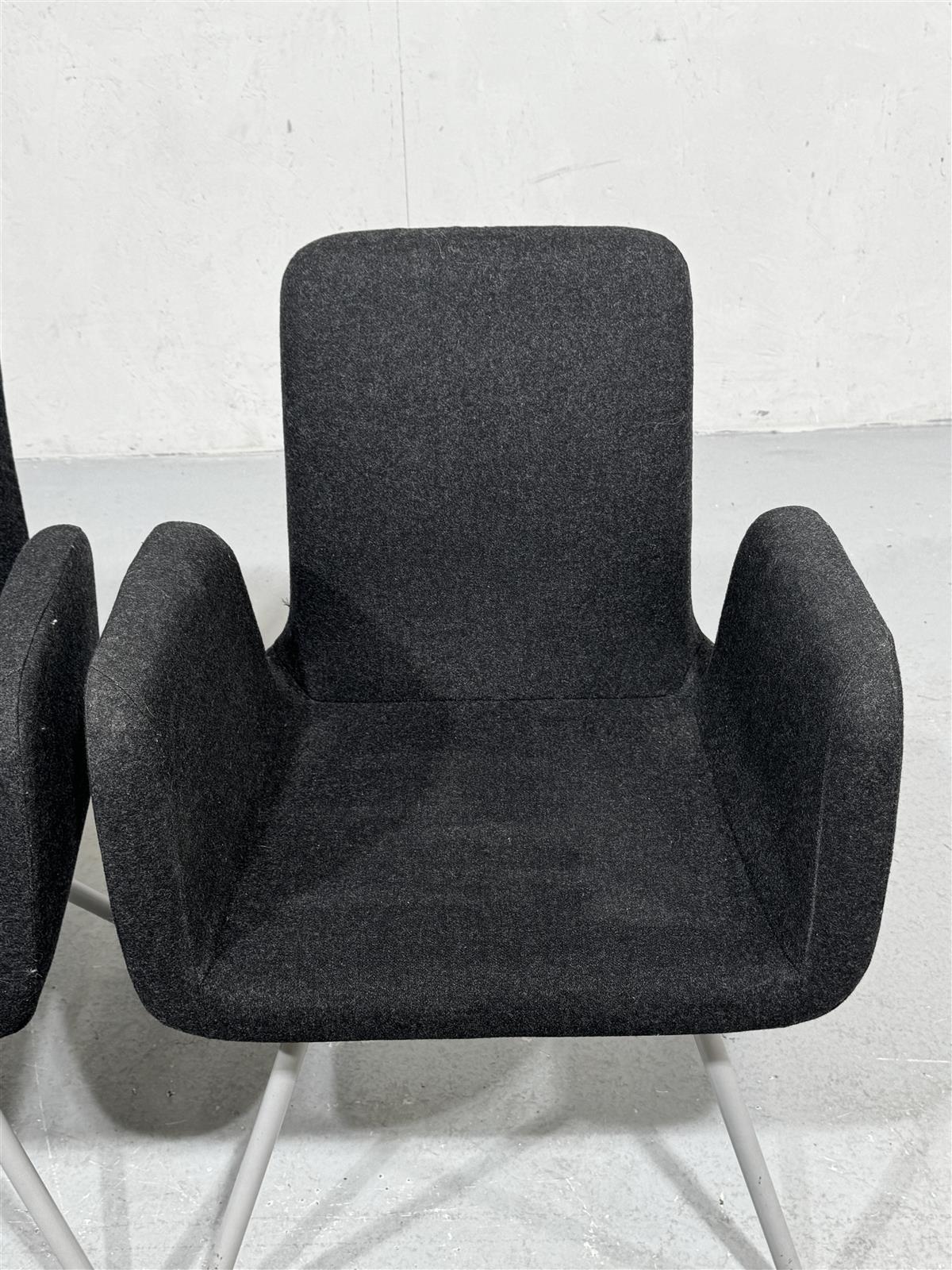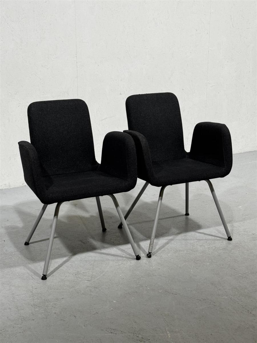 Kaksi tumma Ikea Patrik tuolia, joissa on käsinojat ja metallijalat. Tuolit ovat modernin tyylikkäät ja sopivat monenlaisiin sisustuksiin.